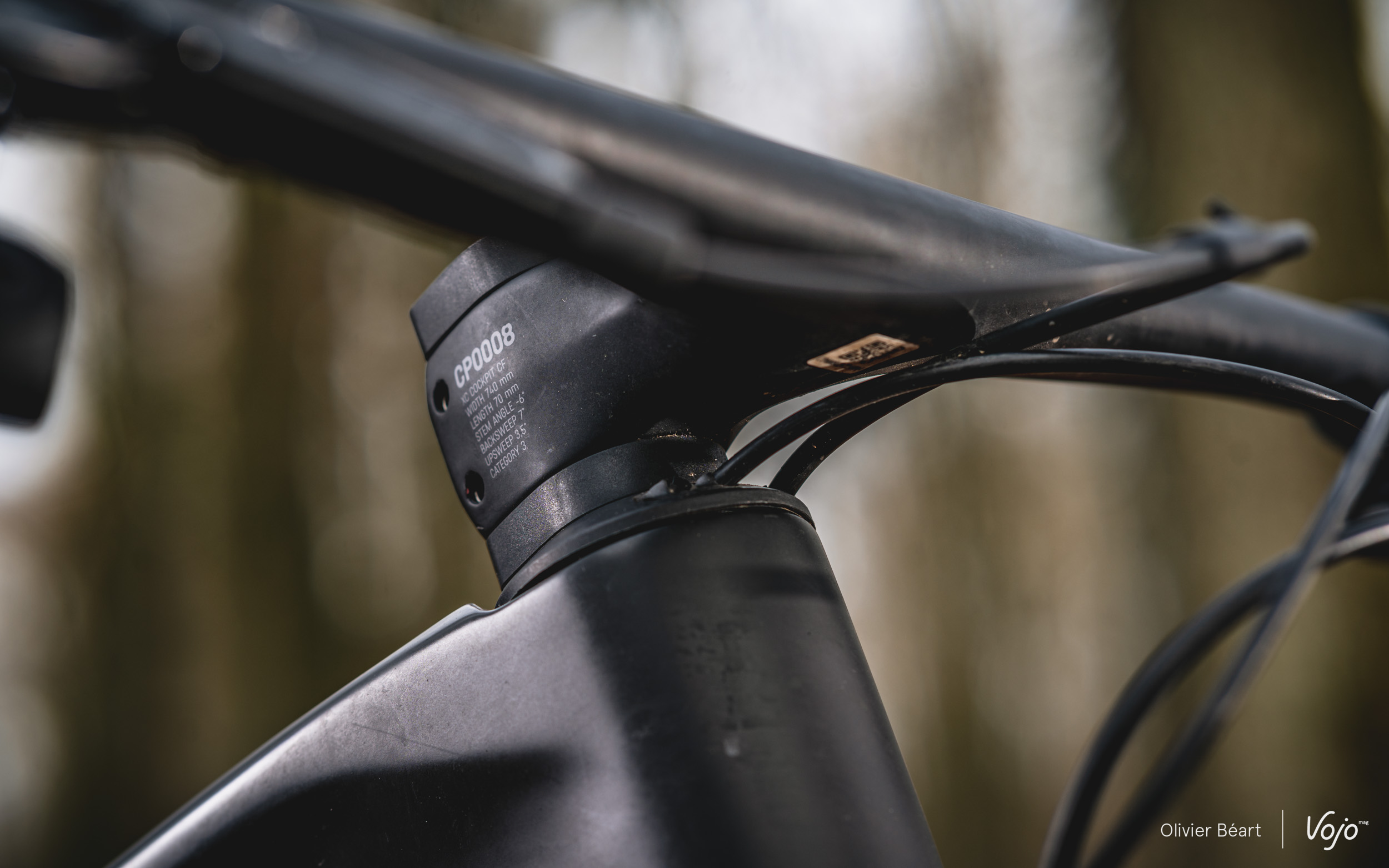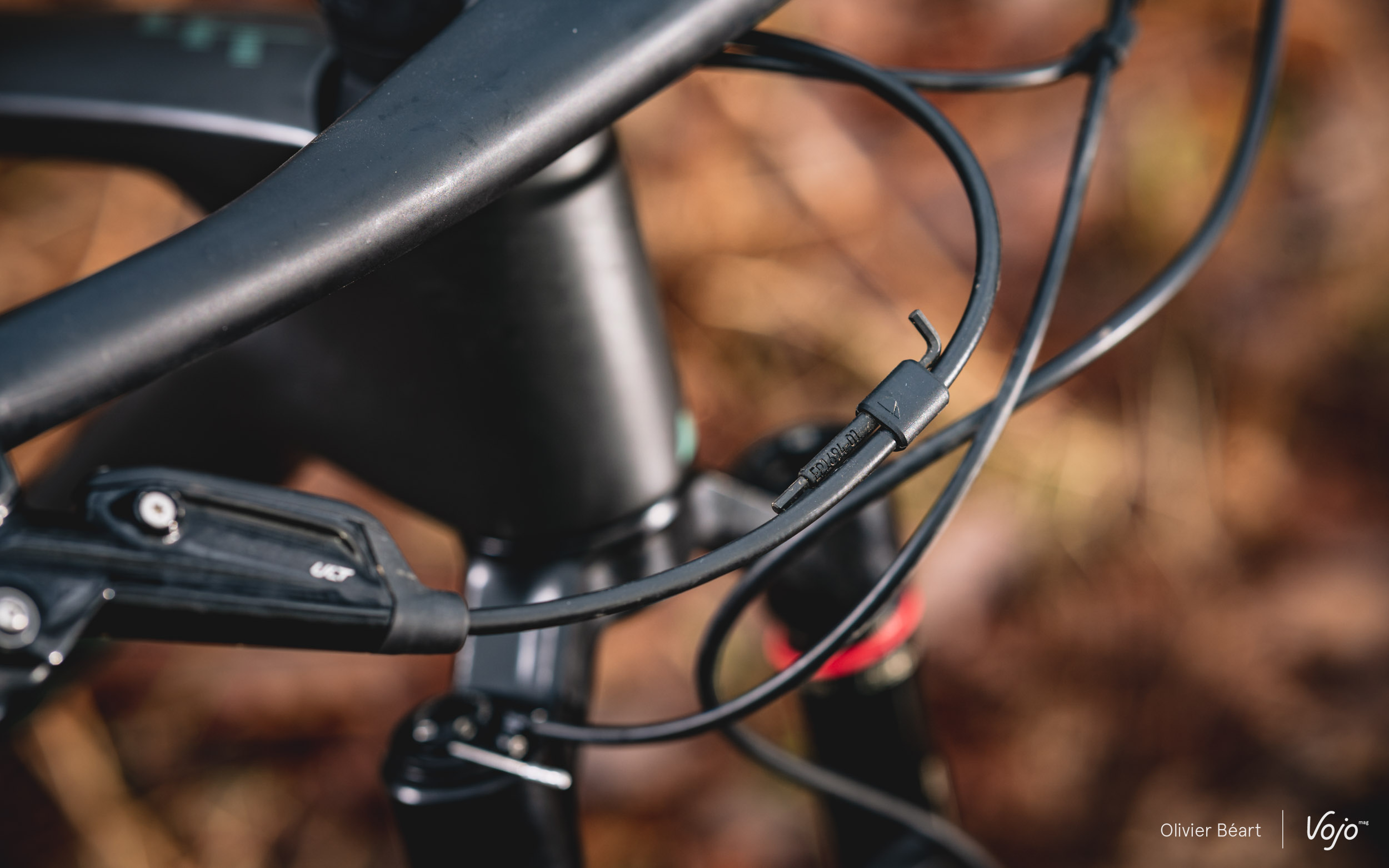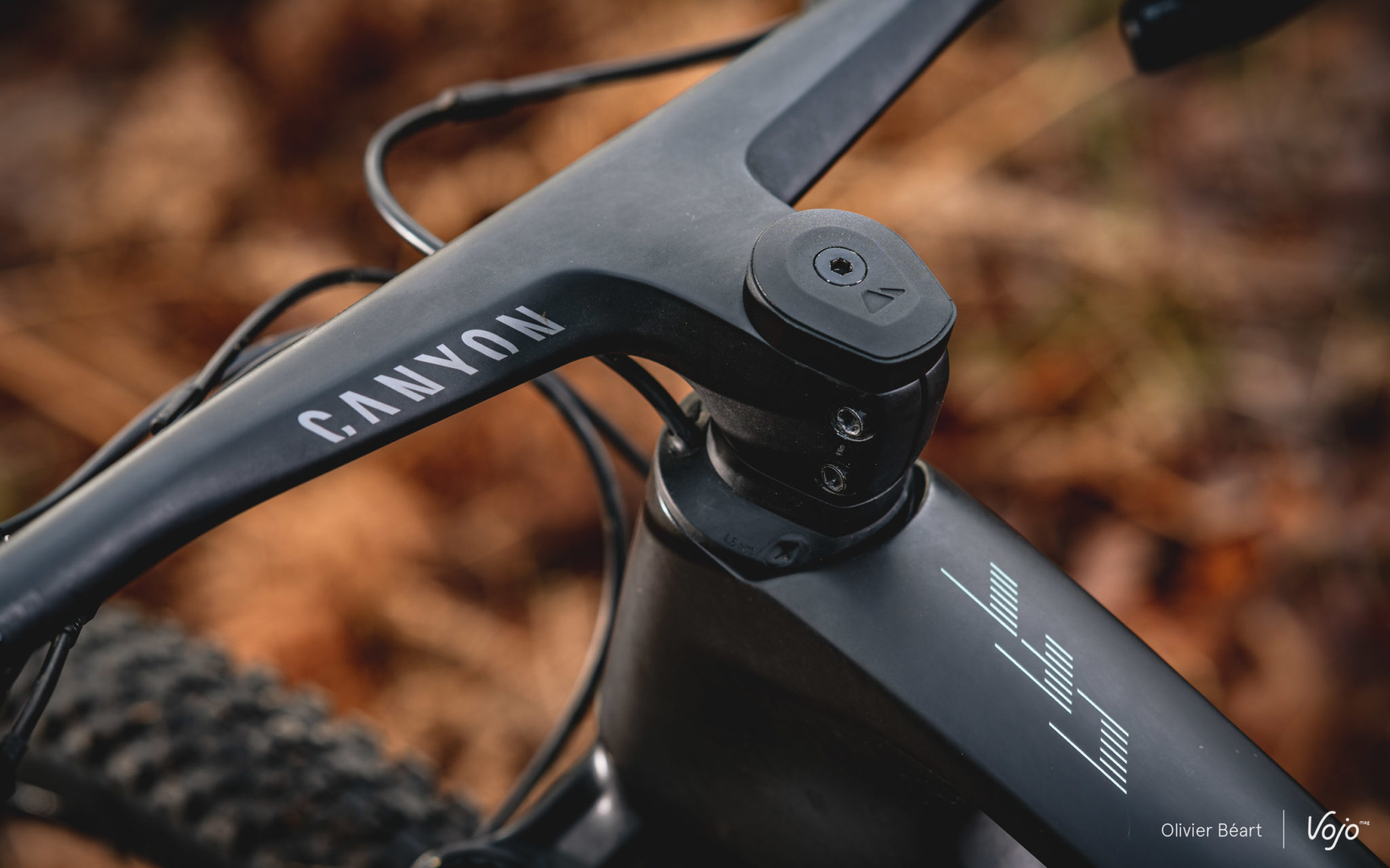 Dans cette optique de proposer une intégration au rendu visuel encore plus abouti, Canyon a également fait le choix d’un passage de gaine au niveau du jeu de direction. Des tubes de guidage sont également prévus au sein du cadre afin de faciliter le passage interne des gaines. Néanmoins, à l’usage, ce n’est pas le système le plus pratique que nous ayons eu à utiliser en cas de changement de gaine ou d’ajout d’une gaine supplémentaire, pour une commande de tige de selle télescopique par exemple.