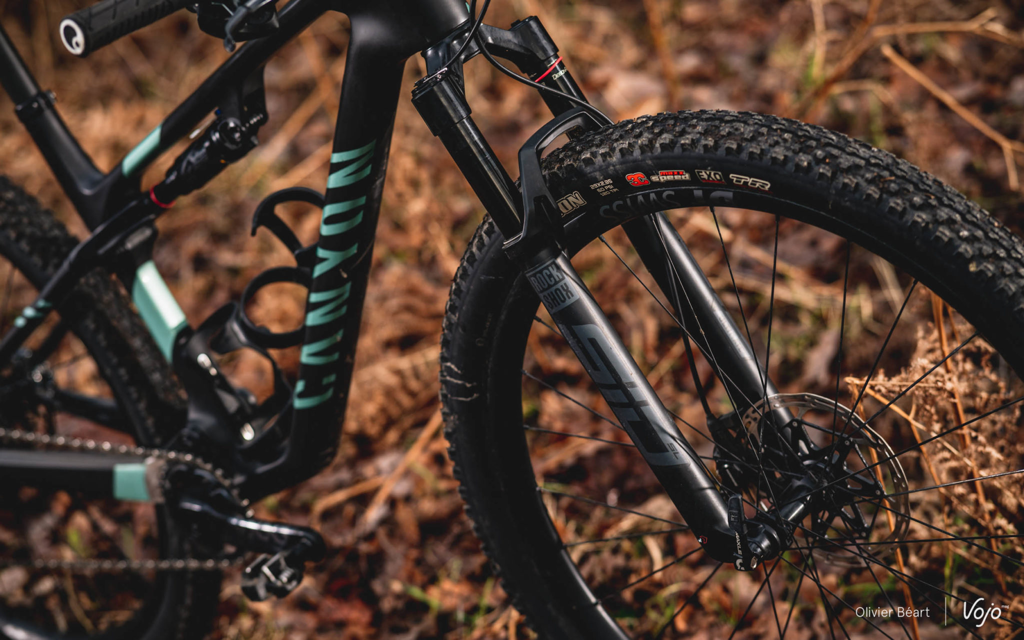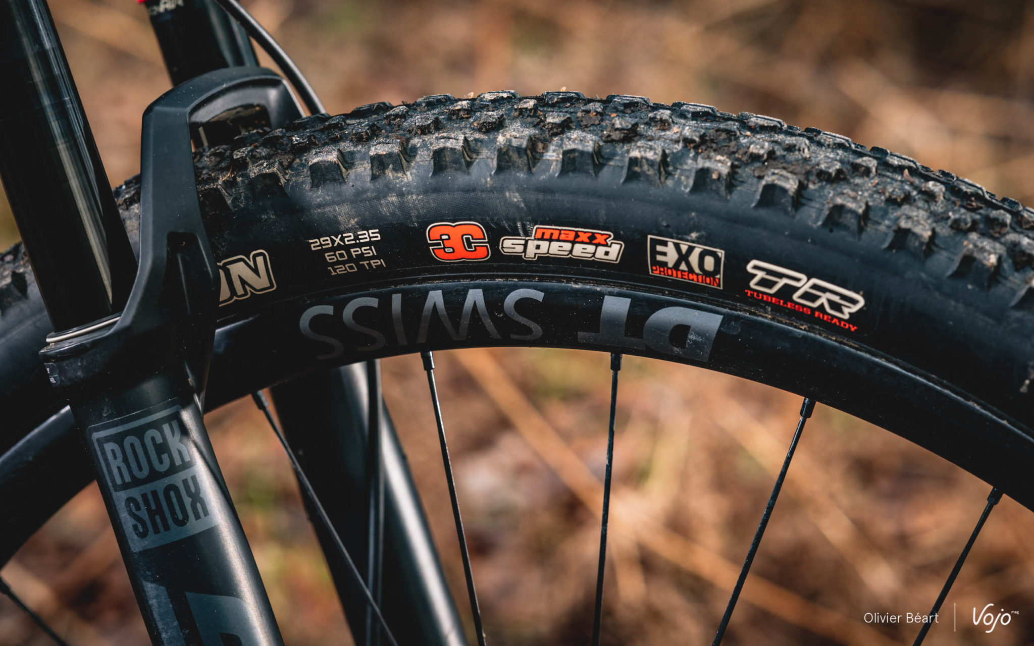 Le train roulant, en 29″ évidemment, est composé de Maxxis Ikon Exo 3C Maxxspeed en 2.35 de largeur, montés sur une paire de DT Swiss XRC1200 en carbone et de 30mm de largeur. Le Lux World Cup peut accueillir des pneus jusque 2.5 de section à l’arrière.