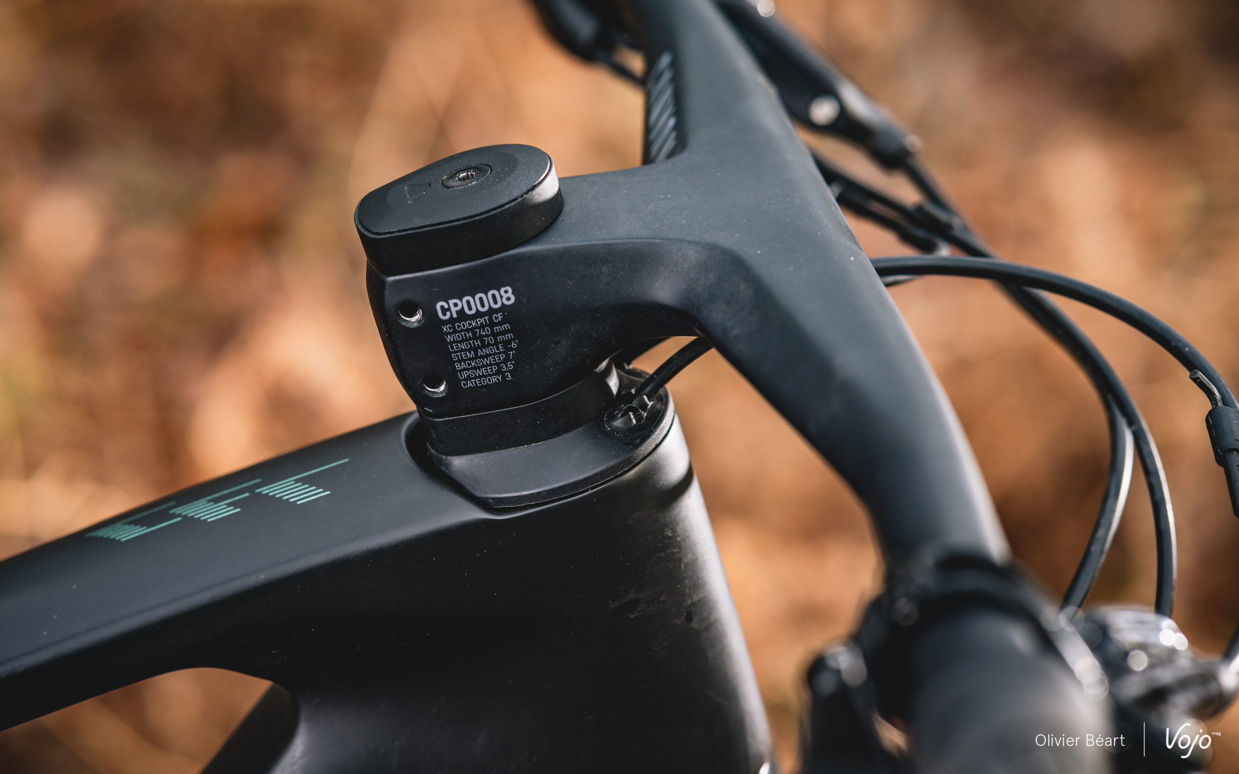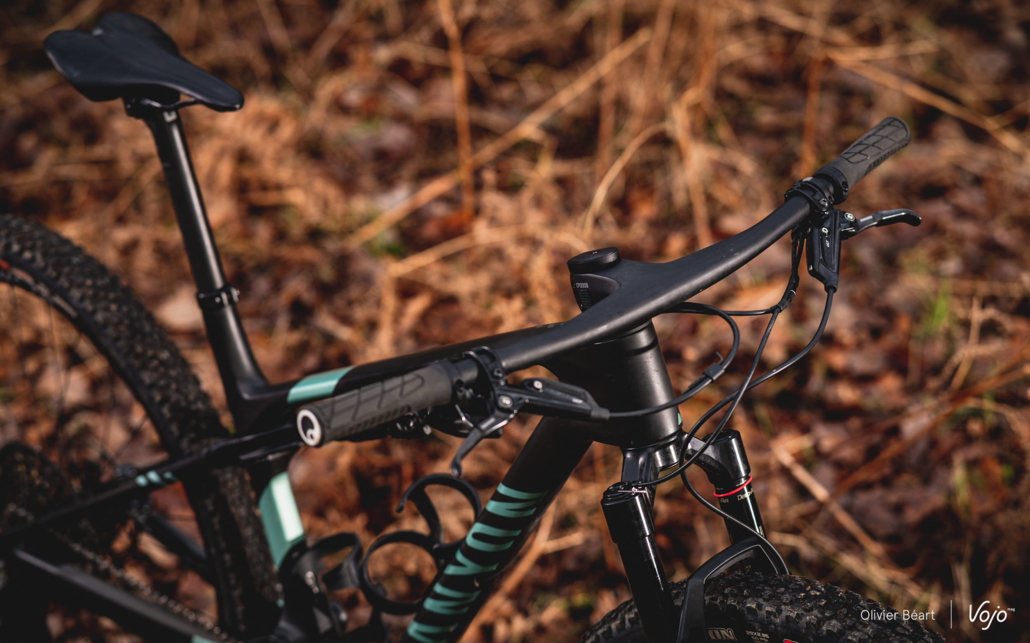 Le cockpit en carbone développé par Canyon et répondant au nom de CP0008 fait visuellement son effet de par sa construction en une pièce. Ce poste de pilotage de 740mm de largeur est doté de grips GA20 de chez Ergon. L’ensemble est ergonomique et confortable à l’utilisation. Avec son profil plat et grâce aux fibres utilisées par Canyon, il est rigide juste ce qu’il faut pour procurer une excellente précision de pilotage, tout en parvenant à filtrer les vibrations. Bref, un excellent combo, très agréable à l’œil pour ne rien gâcher.