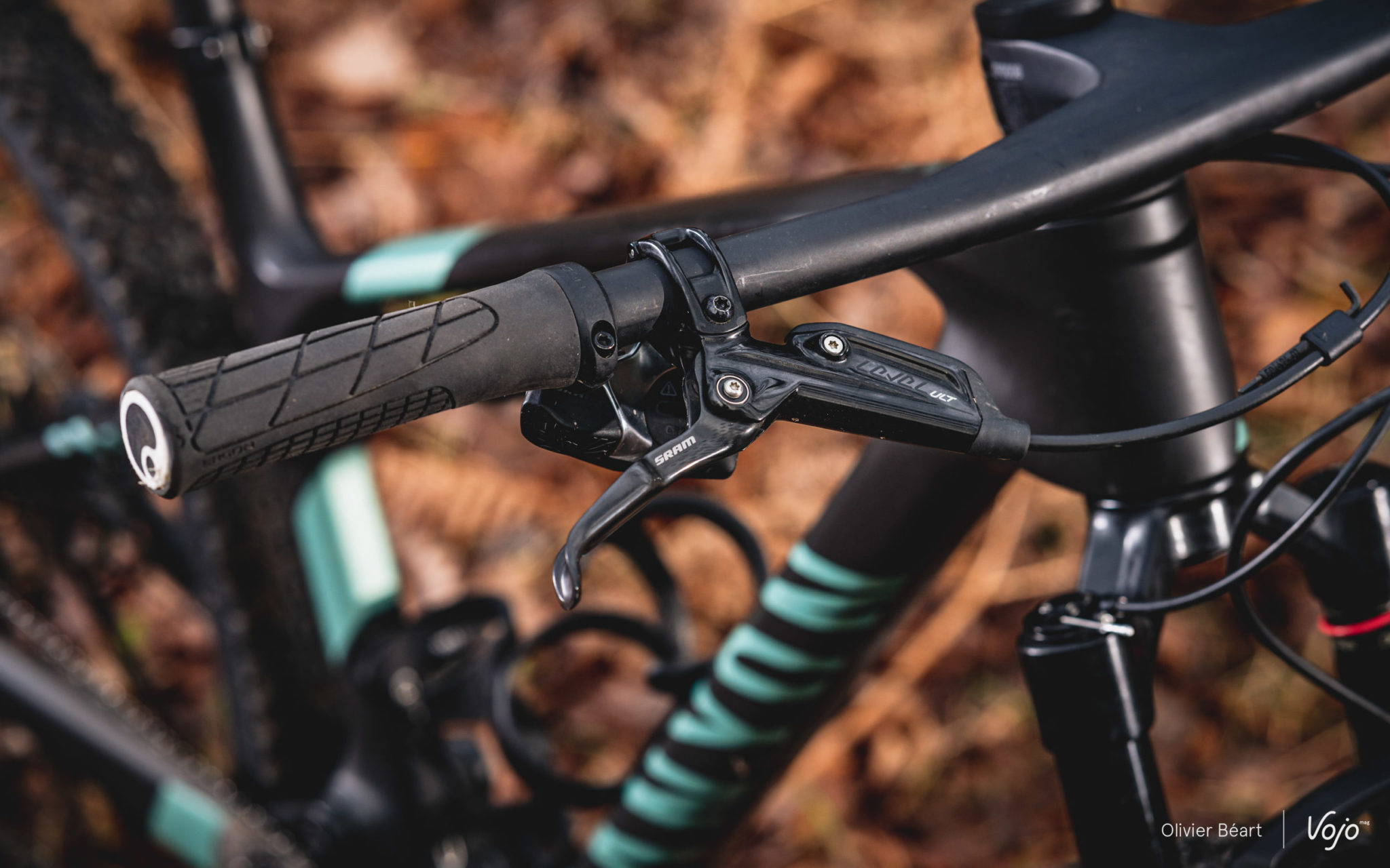 Côté freinage, on passe sur Sram, avec les Level Ultimate et des disques de 160mm. Le montage du frein arrière se fait en « flat-mount » afin de concentrer les forces de freinage dans les bases arrière. Les performances des freins Sram sont parfois critiquées mais ici, nous n’avons absolument rien eu à leur reprocher pour le programme du vélo.