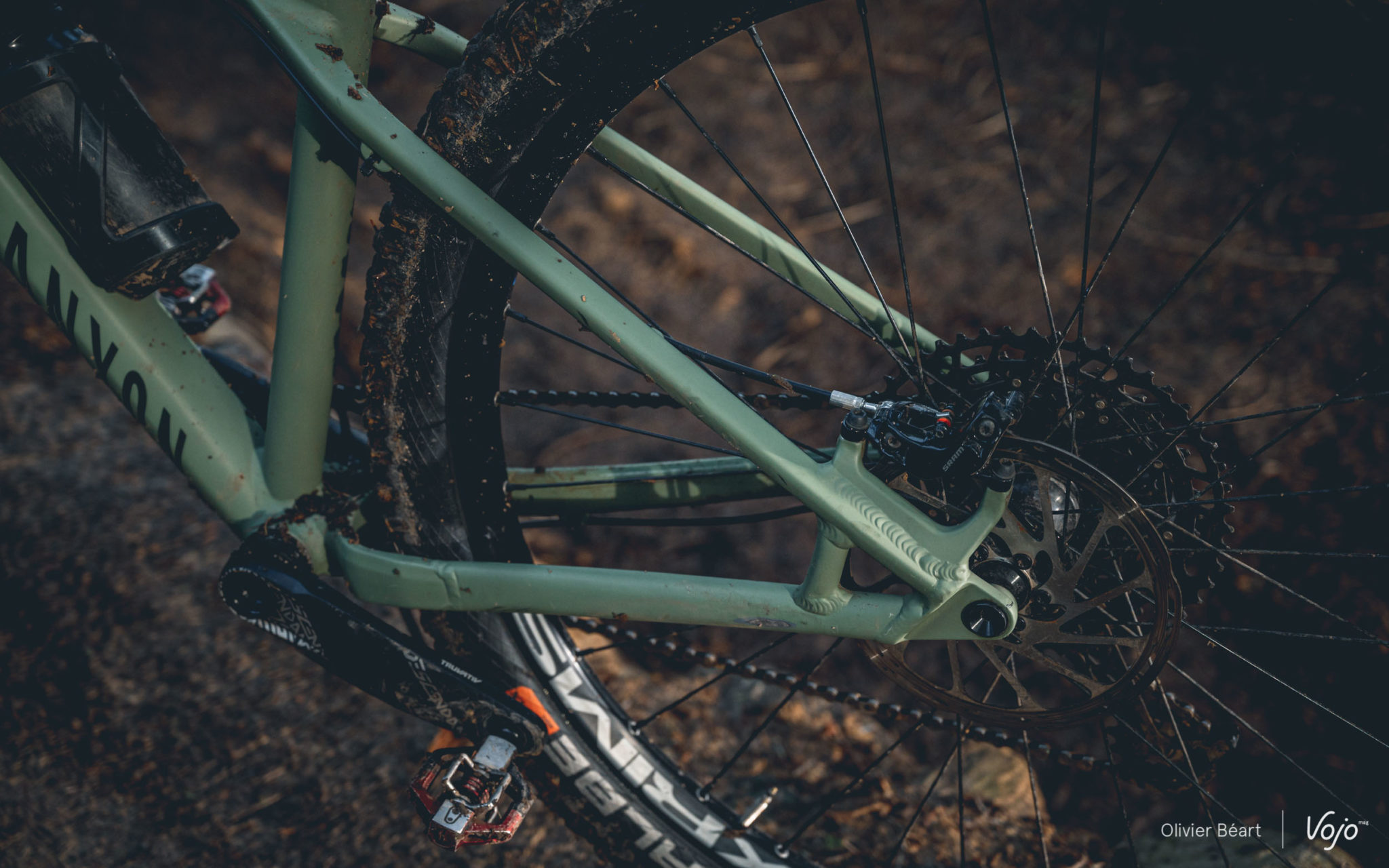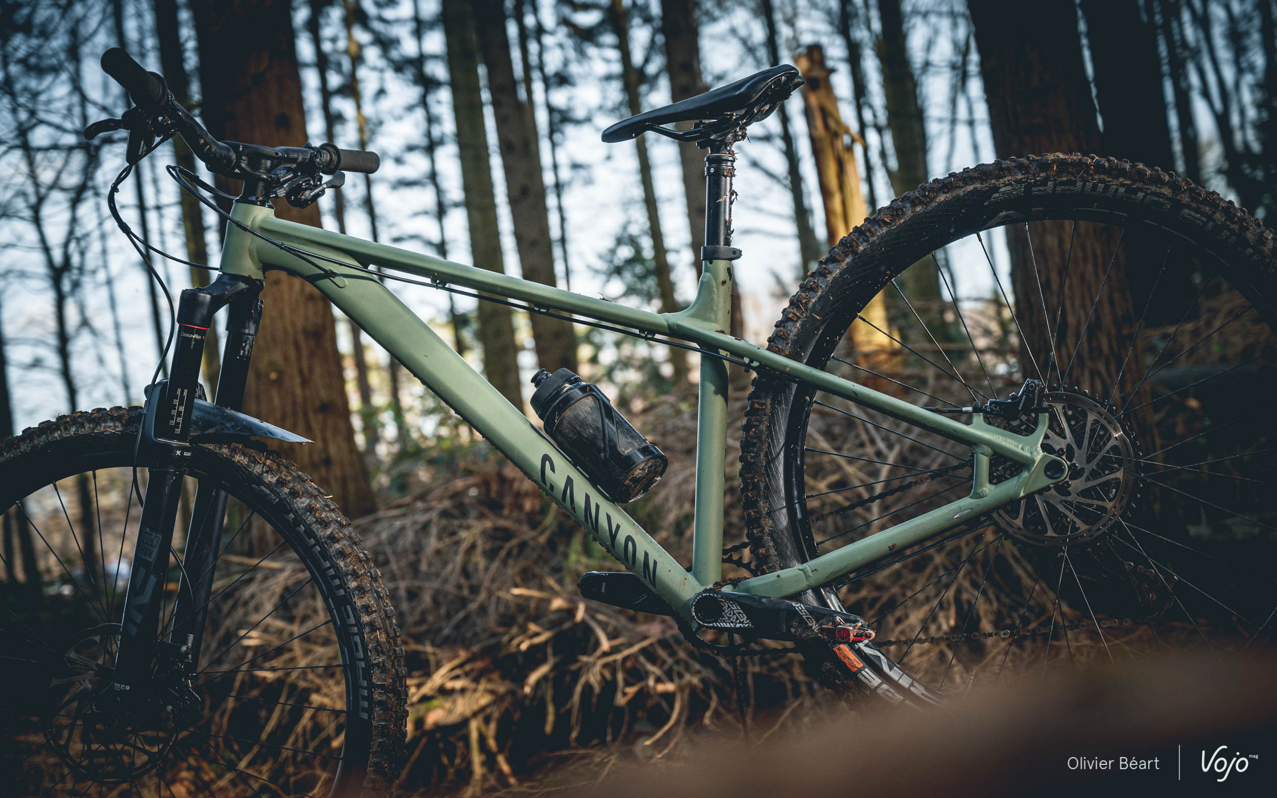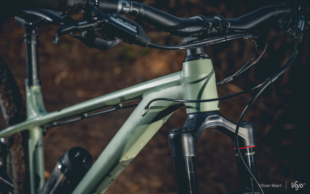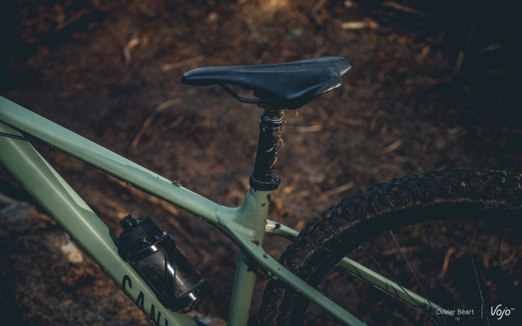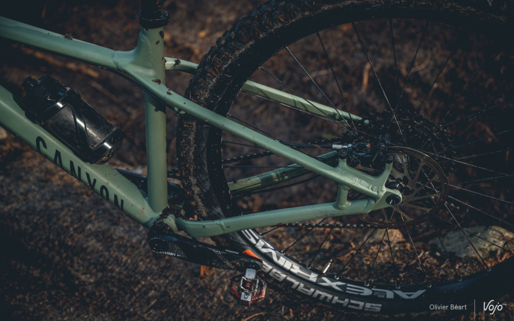 Par contre, impossible d’ignorer que le cadre est rigide. Très rigide même ! Malgré des haubans aplatis et un tube supérieur effilé, le châssis ne filtre pas grand chose et on ressent vraiment le terrain en direct. Sans filtre. On sent que Canyon a clairement privilégié la solidité et la robustesse, pour faire un cadre à l’épreuve des pires traitements, plutôt que de jouer la carte de la subtilité. Dans ce cadre, peut-être que le choix de tubes en acier aurait permis d’atteindre un meilleur compromis ?