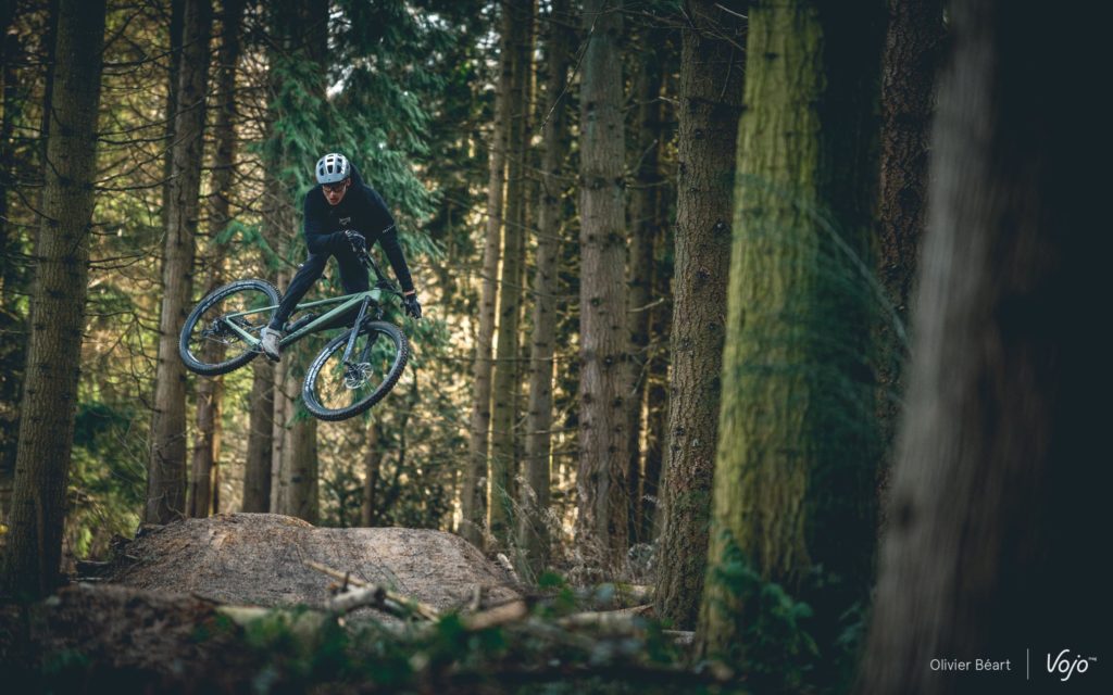 Mais commençons plutôt par ses points fort. En tête, on trouve sa géométrie, absolument parfaite. Long, bas, avec de l’angle devant et une tige de selle bien droite, le Canyon Stoic est parfaitement dans son époque, et cela se sent. C’est un vrai vélo plaisir, fait pour… faire le con ! Très vite, on a envie de se lâcher, de sauter, de tenter des trucs, de s’engager dans la pente, et avec tout cela, on s’amuse vraiment beaucoup ! Il faut aussi louer le travail de la fourche, qui aide vraiment à se sentir en confiance et autant à placer la roue avant qu’à garder le cap au niveau du train avant.