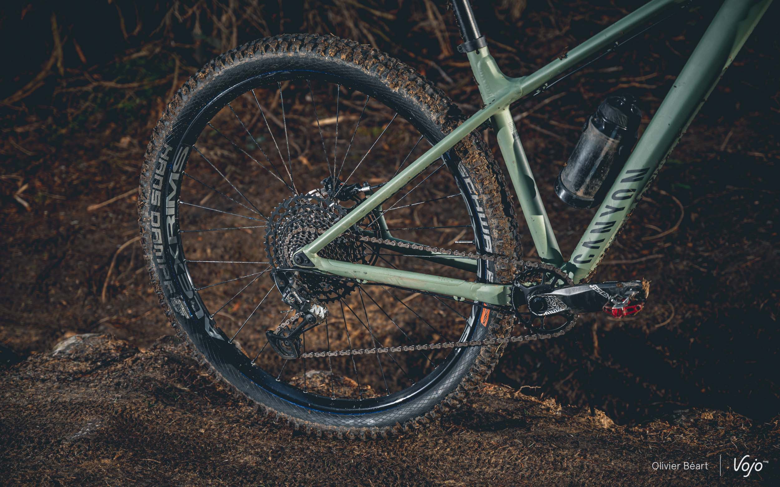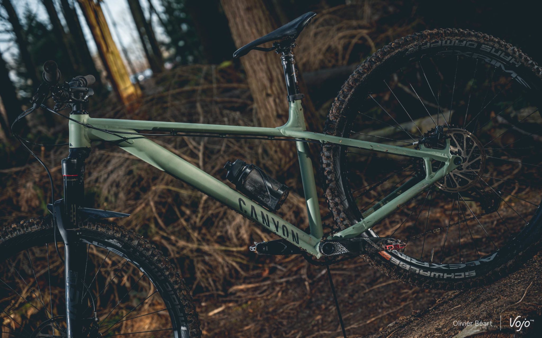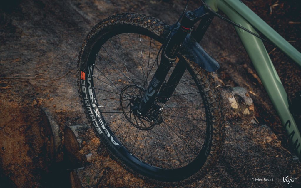 Enfin, les roues sont un montage maison sur base de jantes Alex Rims en 30mm de largeur interne, chaussées de pneus Schwalbe Hans Dampf et Magic Mary en 2.35″ de largeur et gomme Super Trail. Rien à dire du côté des pneus, c’est du tout bon haut de gamme, mais sur les roues, on sent que Canyon a voulu jouer la carte de la robustesse maximale… et vu qu’il fallait aussi garder un tarif contenu, cela se ressent fortement au niveau du poids, ainsi que du comportement dynamique. Nous y reviendrons dans notre essai.