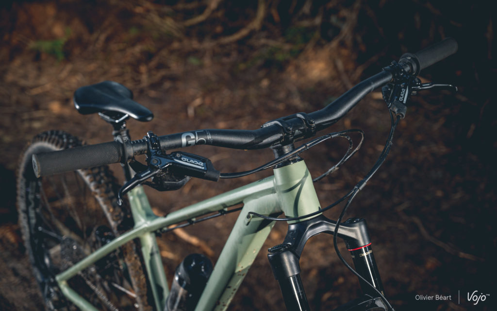 On retrouve aussi du Sram au niveau des freins, avec les Guide T qui, malgré leurs 4 pistons, montrent assez vite leurs limites. Ça freine, oui, mais ça manque de consistance et aussi un peu de mordant. Globalement, ils ne semblent pas vraiment sous-dimensionnés, mais surtout bien placides et manquant de mordant pour un vélo comme celui-ci. Nous aurions clairement préféré des Shimano qui, dès le niveau de gamme Deore, offrent des performances plus en rapport avec ce qu’on attend sur un vélo destiné à un pilotage agressif.