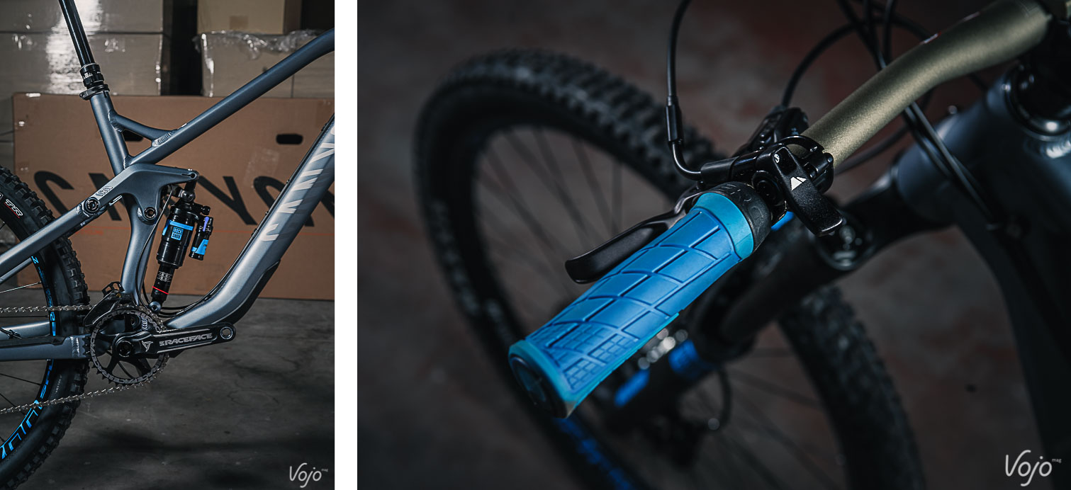 Dans tous les cas, les fondamentaux sont là, avec une tige de selle télescopique RockShox Reverb, des suspensions RockShox Monarch Plus et Pike (en 160mm de débattement), de vrais pneus d’enduro (Maxxis High Roller et Minion DHR), ou encore une transmission Sram 1×11 (en version Race). On remarque aussi un certain souci du détail, avec notamment un anti-déraillement E13 XCX, ou encore des poignées Ergon GE1 particulièrement agréables à l’usage.