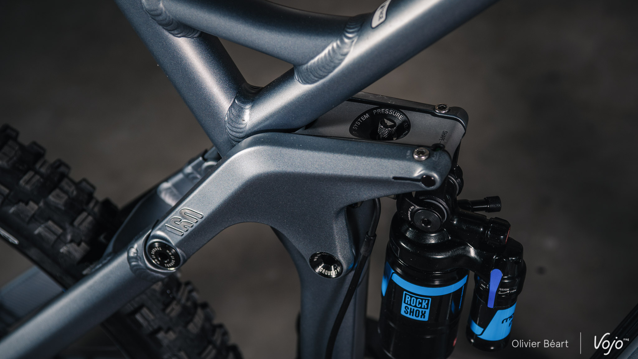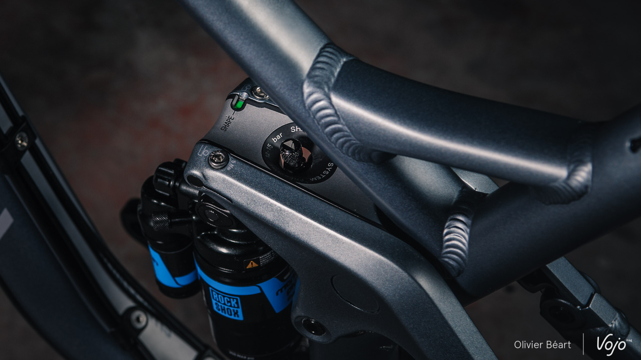 Au niveau de la suspension, nous avons opté d’emblée pour un bon 30% de SAG à l’arrière et 25% à l’avant. C’est exactement ce qui est recommandé pour la fourche, mais un peu plus pour l’amortisseur. En effet, nous nous sommes vites rendus compte qu’avec le ShapeShifter, on dispose de deux vélos en un et on peut réellement se permettre de typer très « DH » la position basse en retirant un peu d’air, dans la mesure où le rendement devient comme par magie excellent quand on repasse sur la position haute.