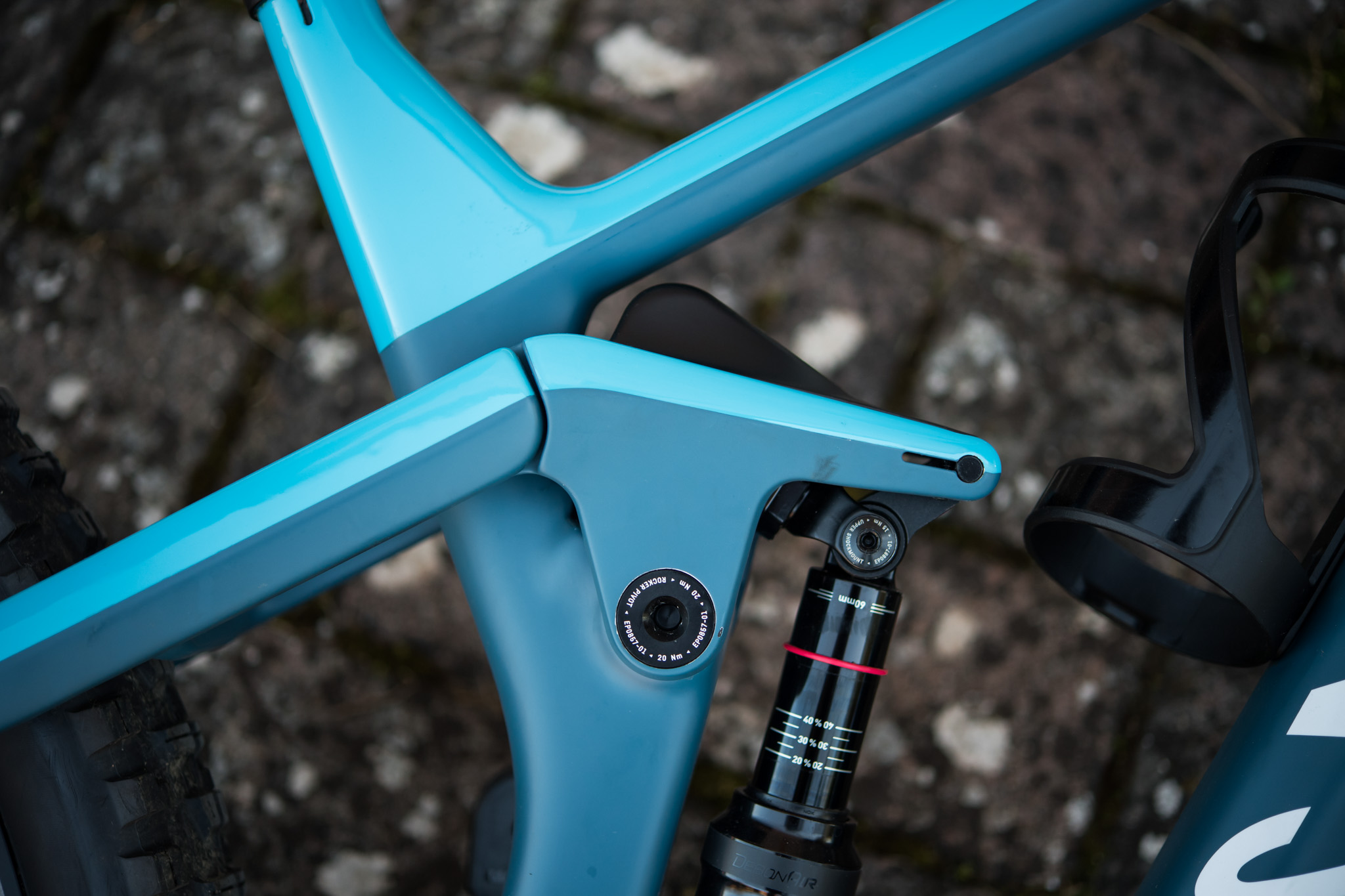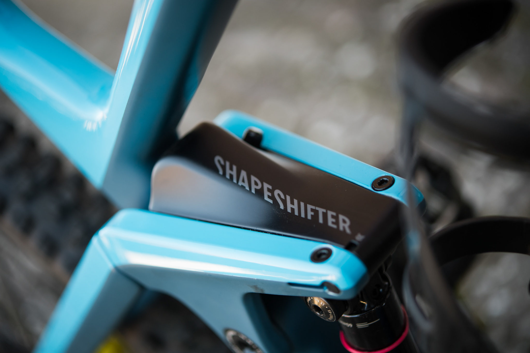 La seule pièce en aluminium qui subsiste sur le cadre est la petite biellette interne du ShapeShifter, par ailleurs complètement revu. Pour rappel, le ShapeShifter c’est ce petit piston placé au niveau de la biellette de la suspension et qui permet, en poussant sur un levier, de modifier le point d’ancrage haut de l’amortisseur. Conséquence ? Les angles du vélo se referment (+ 1,5° pour l’angle de selle et l’angle de direction), la suspension se raffermit et le débattement est réduit.