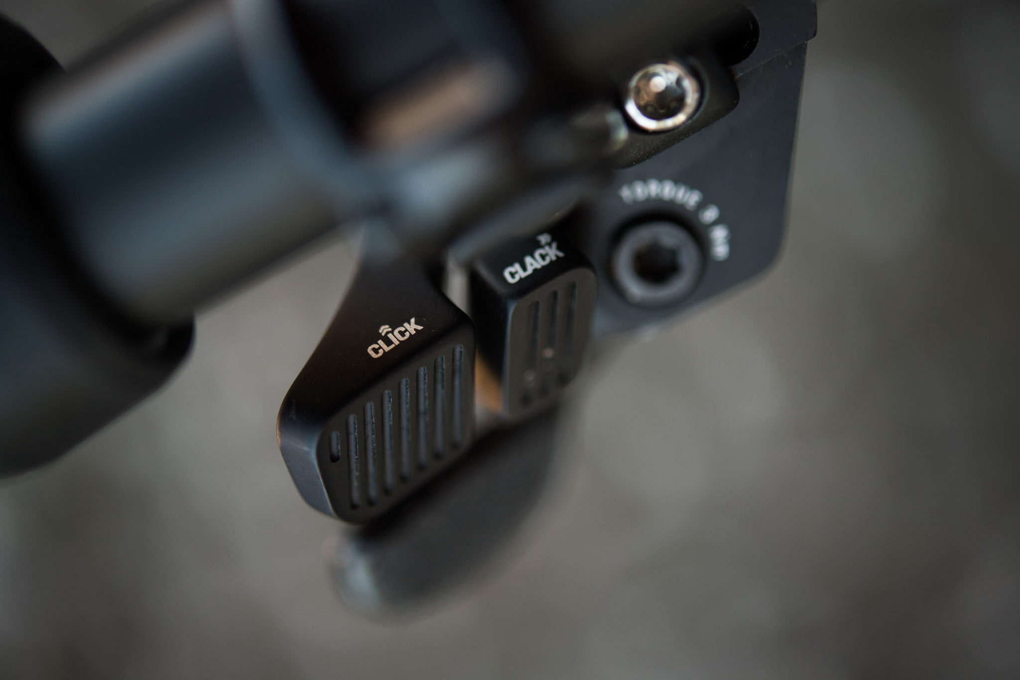 Cette même manette du ShapeShifter intègre au passage le levier pour la tige de selle télescopique, ce qui donne à l’ensemble un aspect très propre et intégré bien qu’on ait quand même 3 leviers sous le cintre. Ça fait un peu cockpit d’avion en apparence mais c’est finalement très intuitif à utiliser et dans le doute, on peut toujours s’en remettre à Canyon. Avec un humour auquel elle ne nous avait pas habitué jusque-là, la marque allemande a marqué les leviers de « click », « clack » et autres « pshhhhhh » pour s’y retrouver plus facilement.