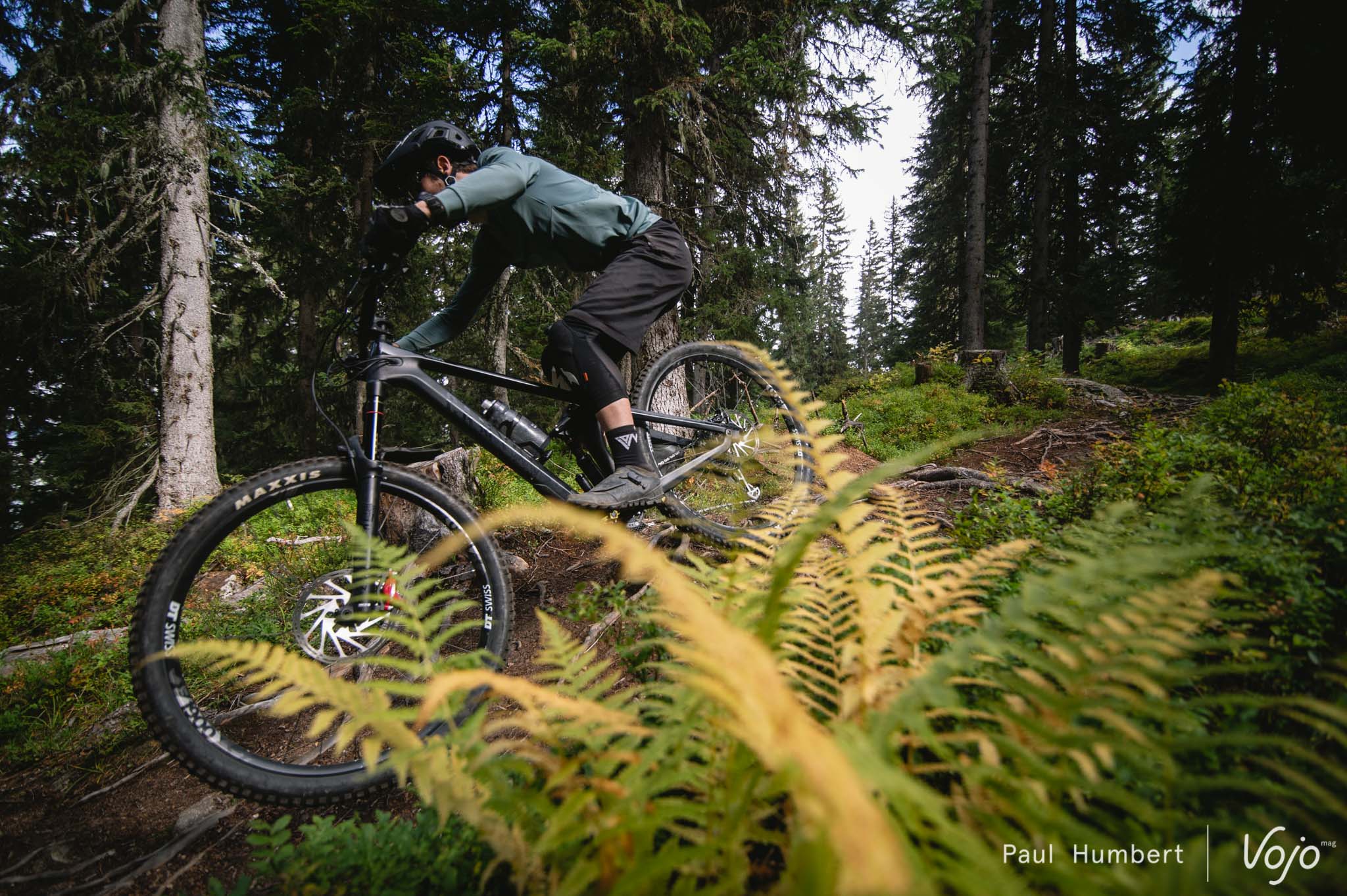 Cette simplicité combinée à la facilité de prise en main font du Strive un bon vélo pour progresser dans son pilotage et lorsque vous aurez un certain niveau, vous sentirez naturellement la limite des composants. La fourche Rockshox Lyrik RC est sensible et offre un fonctionnement général honnête mais manque de support pour rouler vraiment fort. C’est là qu’il se démarque du modèle « team » haut de gamme qui apporte, justement, ce support supplémentaire. Tant qu’on est sur l’avant du vélo, on aurait aussi aimé un autre pneu que le Maxxis DHR II car il manque de grip au freinage sur certains terrains. Un DHF ou un Assegai, pour rester chez Maxxis, aurait été préférable. Néanmoins, il ne faut pas perdre de vue qu’on est sur un vélo en carbone et de manière générale, les performances sont bonnes pour ce prix.