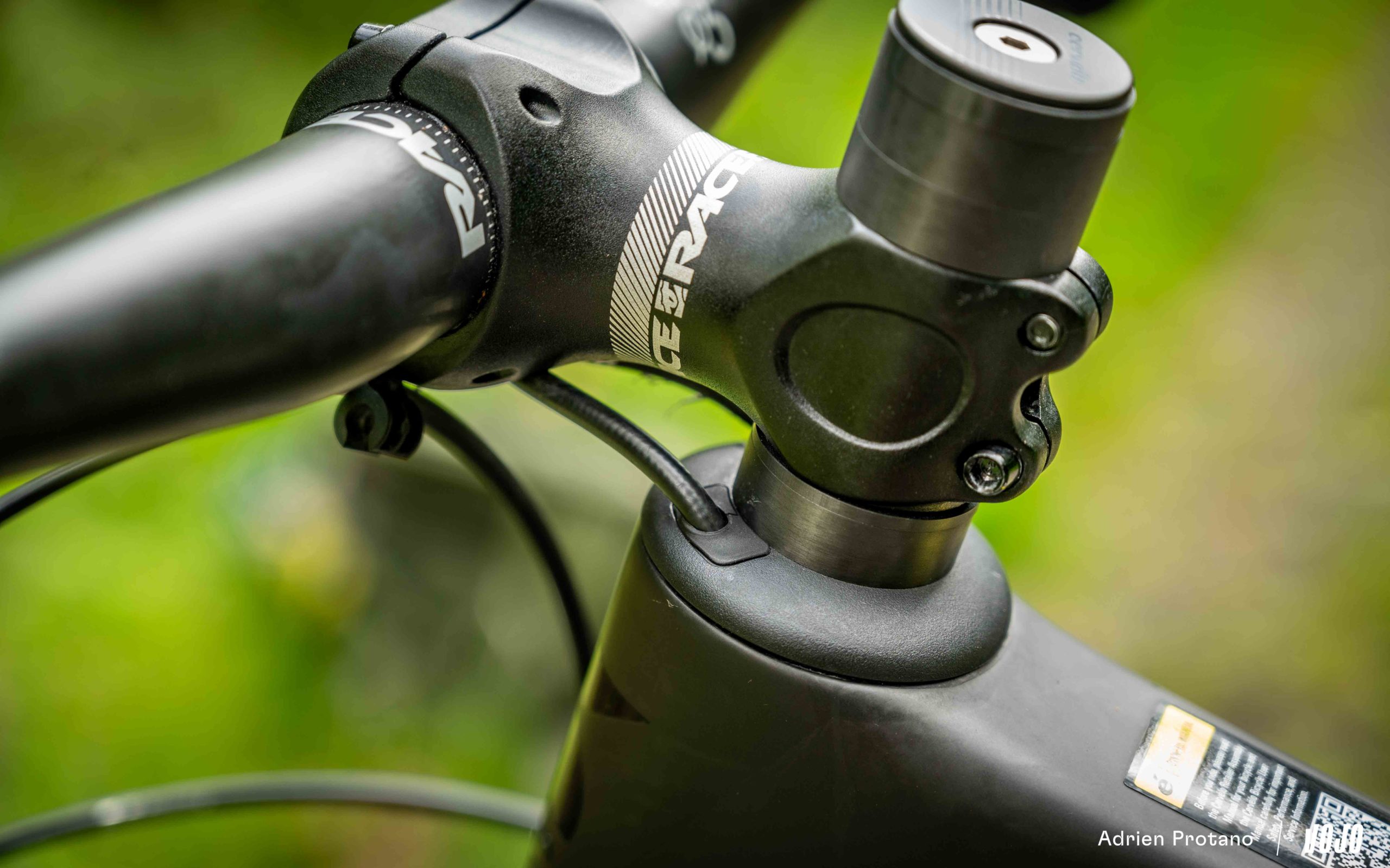 À l’avant, on remarque la discrète présence d’un jeu de direction permettant de faire rentrer directement les câbles et Durits dans le cadre. En plus d’offrir un look plus épuré et soigné, cela permet également d’éviter de devoir percer le cadre, avec les conséquences que cela entraîne sur la rigidité du châssis et sa construction.