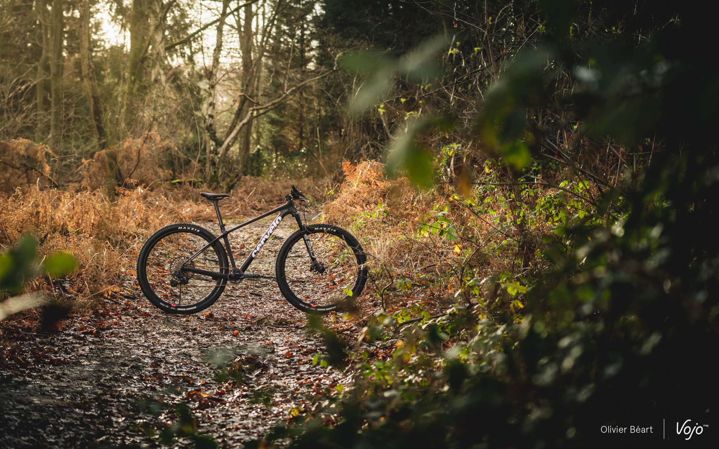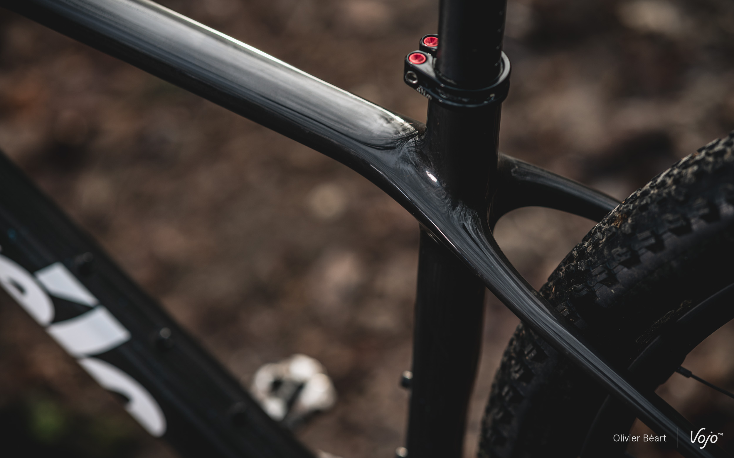 En descente, la tige de selle télescopique nous a un peu manqué dans les forts pourcentages, mais on sent assez vite que l’ADN du vélo n’est pas tellement dans les reliefs très marqués. Soyons de bon compte : il ne met pas le pilote mal à l’aise dans les drops ou les descentes engagées, mais il ne permet pas non plus de se surpasser et d’avoir envie d’aller sans cesse plus vite. En cela, il reste un hardtail assez classique, et son look plutôt sans folie colle assez bien avec son caractère sur les trails. On peut aussi regretter que, en l’absence de tige de selle télescopique, la tige de selle carbone montée de série n’apporte pas vraiment de filtration des vibrations, malgré une conception « double épaisseur » qui, sur papier, aurait pu laisser présager une certaine capacité de déformation.