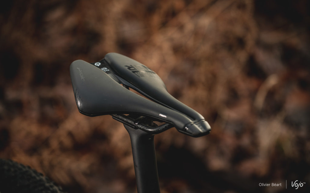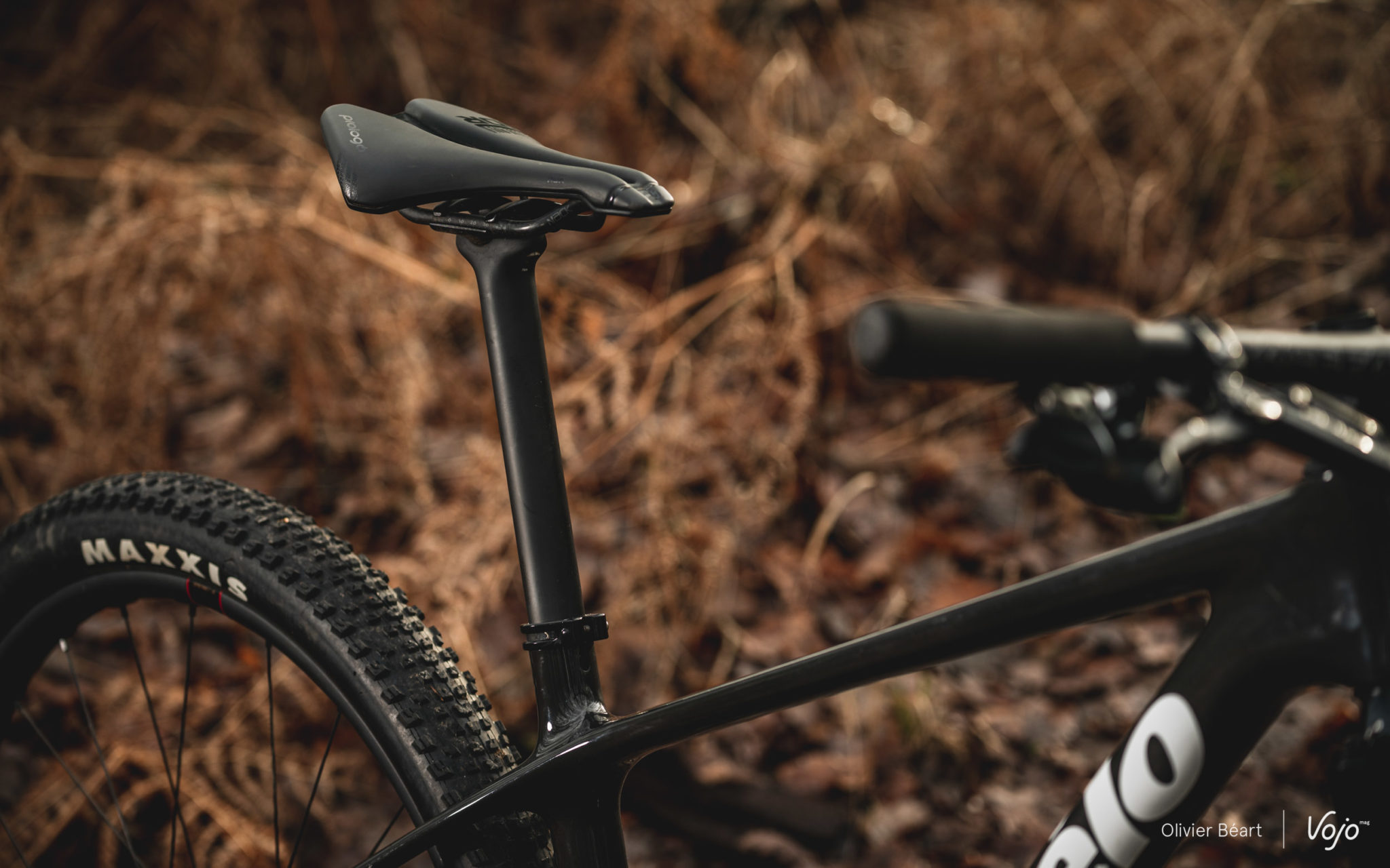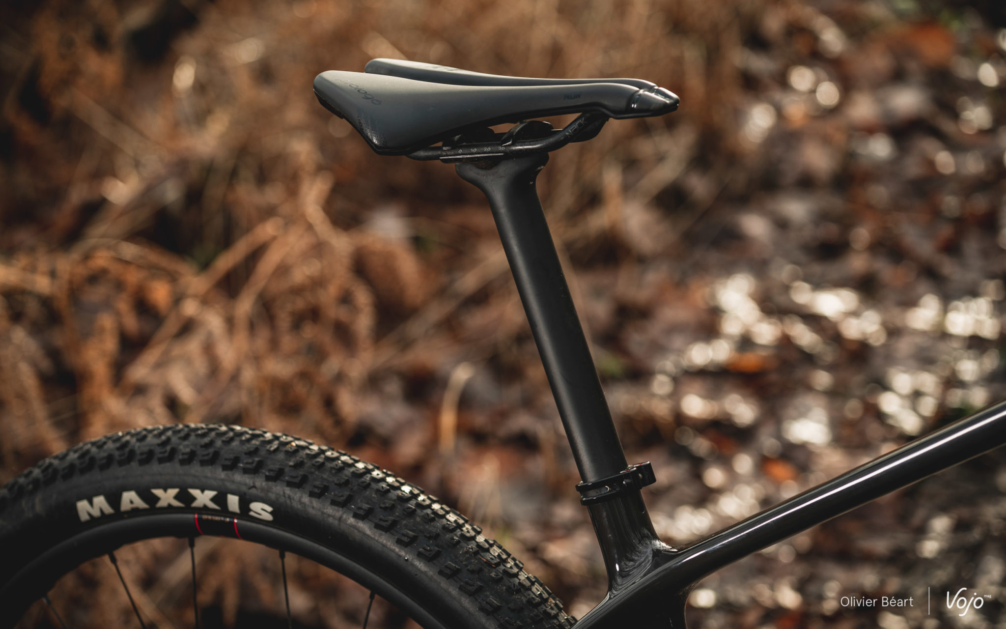 En descente, la tige de selle télescopique nous a un peu manqué dans les forts pourcentages, mais on sent assez vite que l’ADN du vélo n’est pas tellement dans les reliefs très marqués. Soyons de bon compte : il ne met pas le pilote mal à l’aise dans les drops ou les descentes engagées, mais il ne permet pas non plus de se surpasser et d’avoir envie d’aller sans cesse plus vite. En cela, il reste un hardtail assez classique, et son look plutôt sans folie colle assez bien avec son caractère sur les trails. On peut aussi regretter que, en l’absence de tige de selle télescopique, la tige de selle carbone montée de série n’apporte pas vraiment de filtration des vibrations, malgré une conception « double épaisseur » qui, sur papier, aurait pu laisser présager une certaine capacité de déformation.