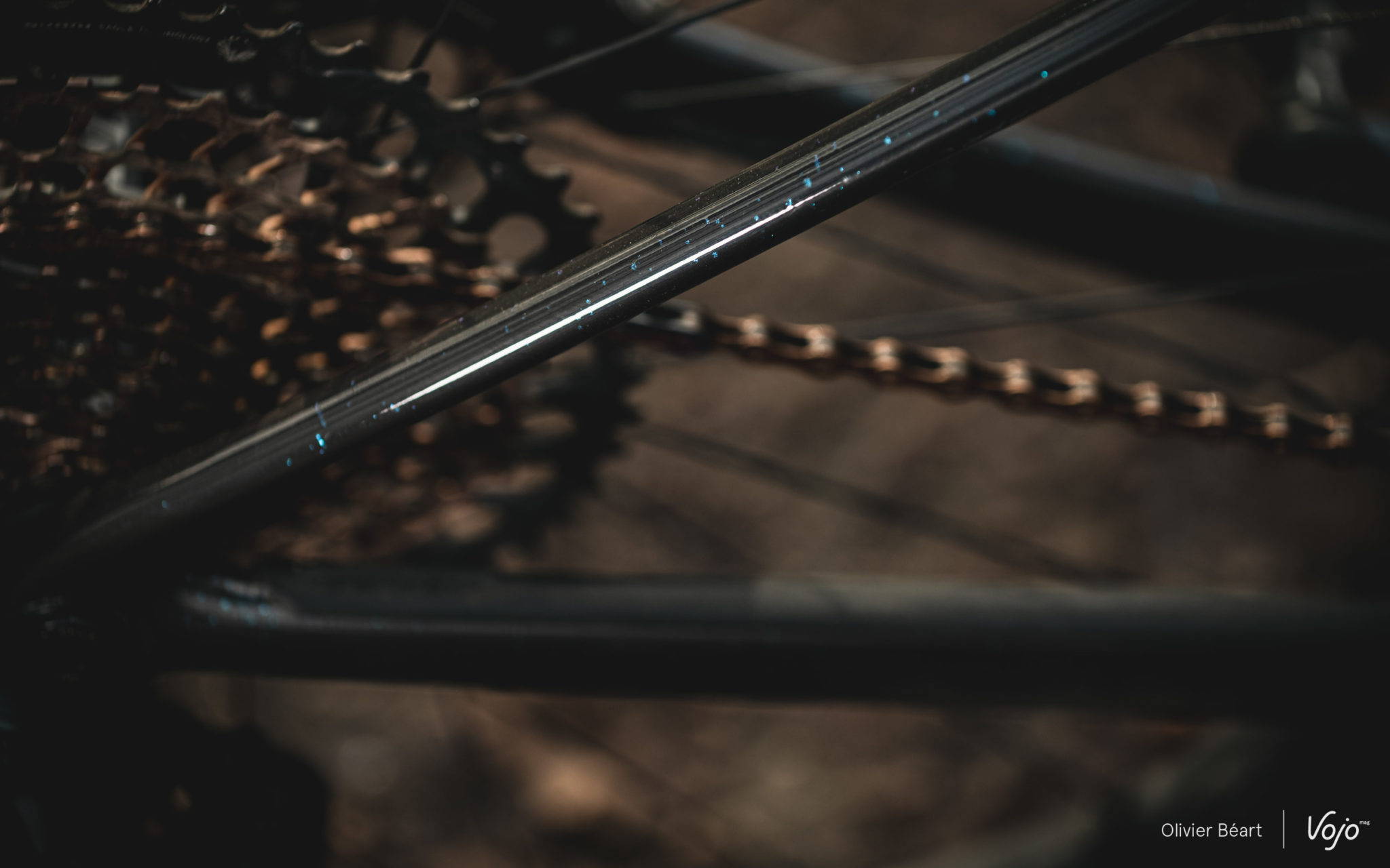 De série, le ZHT-5 est équipé d’une tige de selle en carbone à épaisseur variable, capable de se déformer légèrement. Cette tige de selle fixe en 30.9 mm peut toutefois être remplacée par une tige de selle télescopique. Pour le reste, un passage interne a été prévu par Cervélo, avec une entrée pour les câbles et Durit directement au niveau du jeu de direction. En plus d’offrir un look très épuré, cela permet d’éviter de devoir percer le cadre. On notera toutefois l’absence de système de butée de direction dont le rôle est d’éviter d’abîmer le cadre par des retours intempestifs de cintre en cas de chute. Ce n’est pas arrivé pendant le test, mais c’est une tranquillité d’esprit qu’on aime avoir sur le long terme.