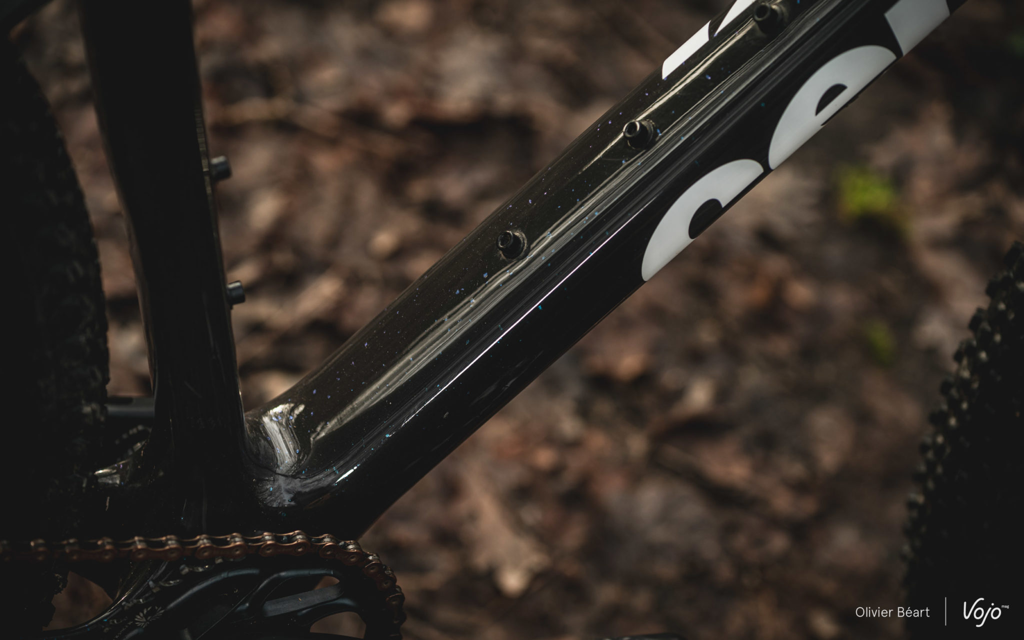 Au visuel, le bike est soigné, la finition est très belle… mais il manque un petit quelque chose, un grain de folie qui ferait de ce ZHT-5 un VTT absolument unique, presque un ovni dans le paysage. Clairement, mis à part quelques paillettes dans la peinture qui viennent trancher avec la teinte sombre, Cervélo a choisi le classicisme dans les lignes de sa machine. Soit, c’est surtout le comportement qui nous importe. Mais tout de même, on aurait aimé plus d’originalité de la part de la marque, histoire de marquer directement les esprits dès son arrivée dans le VTT. Cela dit, on sait que tout s’est décidé très vite du côté de la marque canadienne, et que le délai de réalisation de ce premier VTT destiné à permettre l’arrivée de la marque et du team Jumbo-Visma en MTB a été très court.