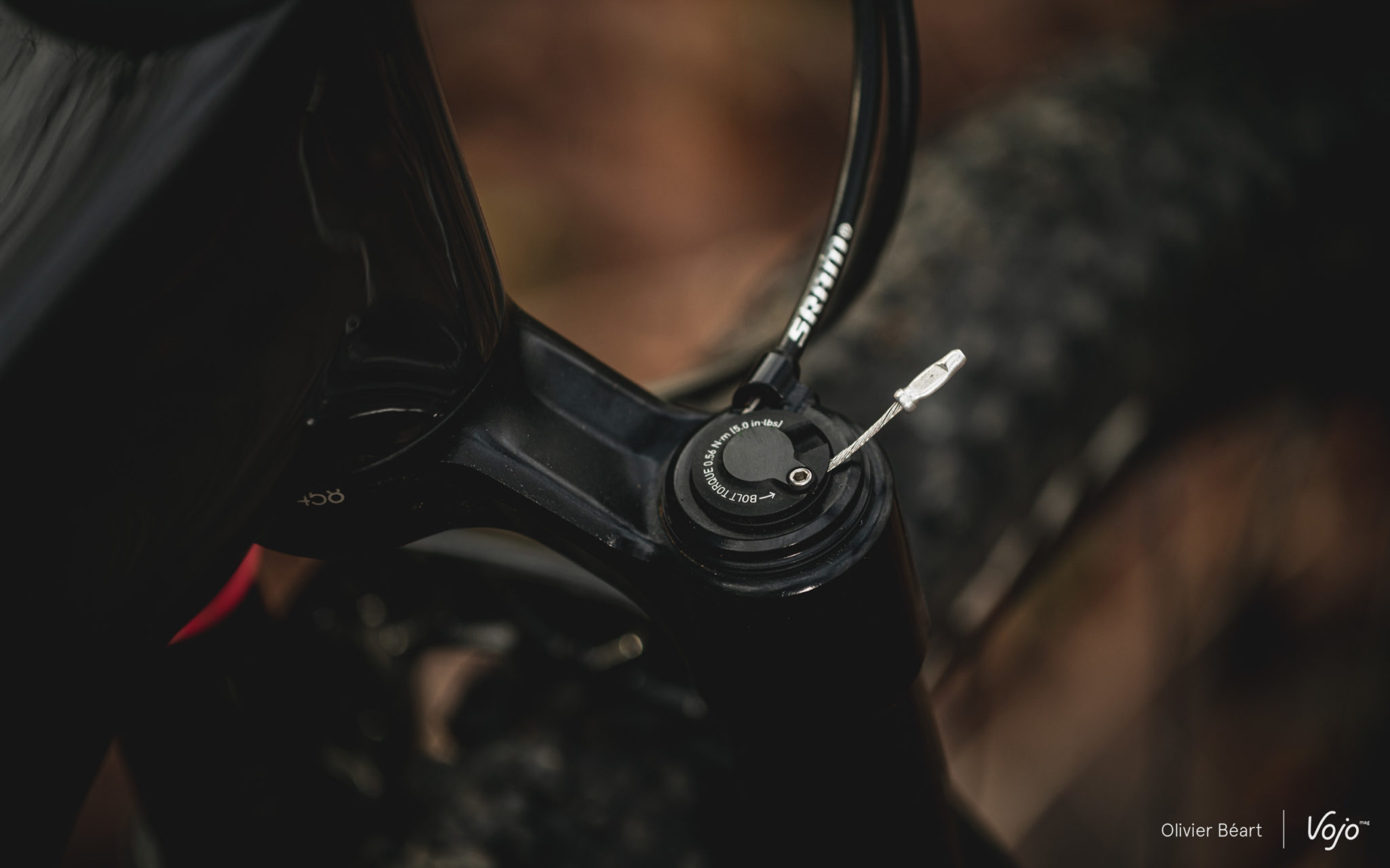 Une SID SL Ultimate s’occupe de la partie suspension pour ce premier VTT de chez Cervélo. Elle est ici en version 100 mm de débattement avec blocage au guidon. On le verra plus loin, elle s’est avérée parfaite sur ce genre de vélo.