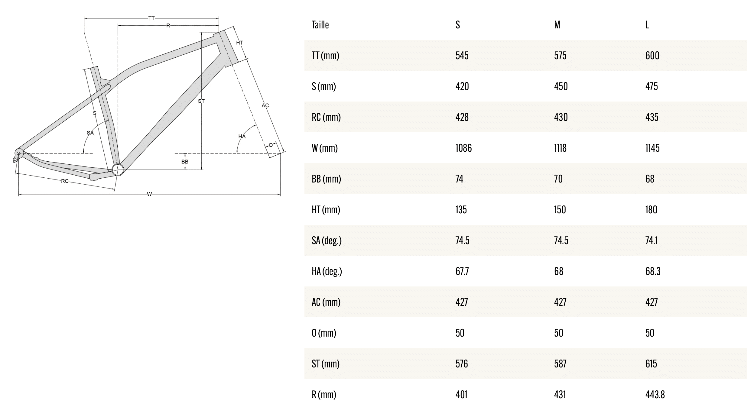 En regardant le tableau, on retrouve des chiffres familiers en tant que vététiste. Par exemple, le reach est de 431 mm en taille M, ce qui n’est pas aussi « profond » que les VTT les plus récents où on est autour des 450 mm en medium, mais on est largement au-dessus d’un « vrai » gravel, qui sera le plus souvent à moins de 400 mm. Le tout est combiné ici à une potence en 80 mm.