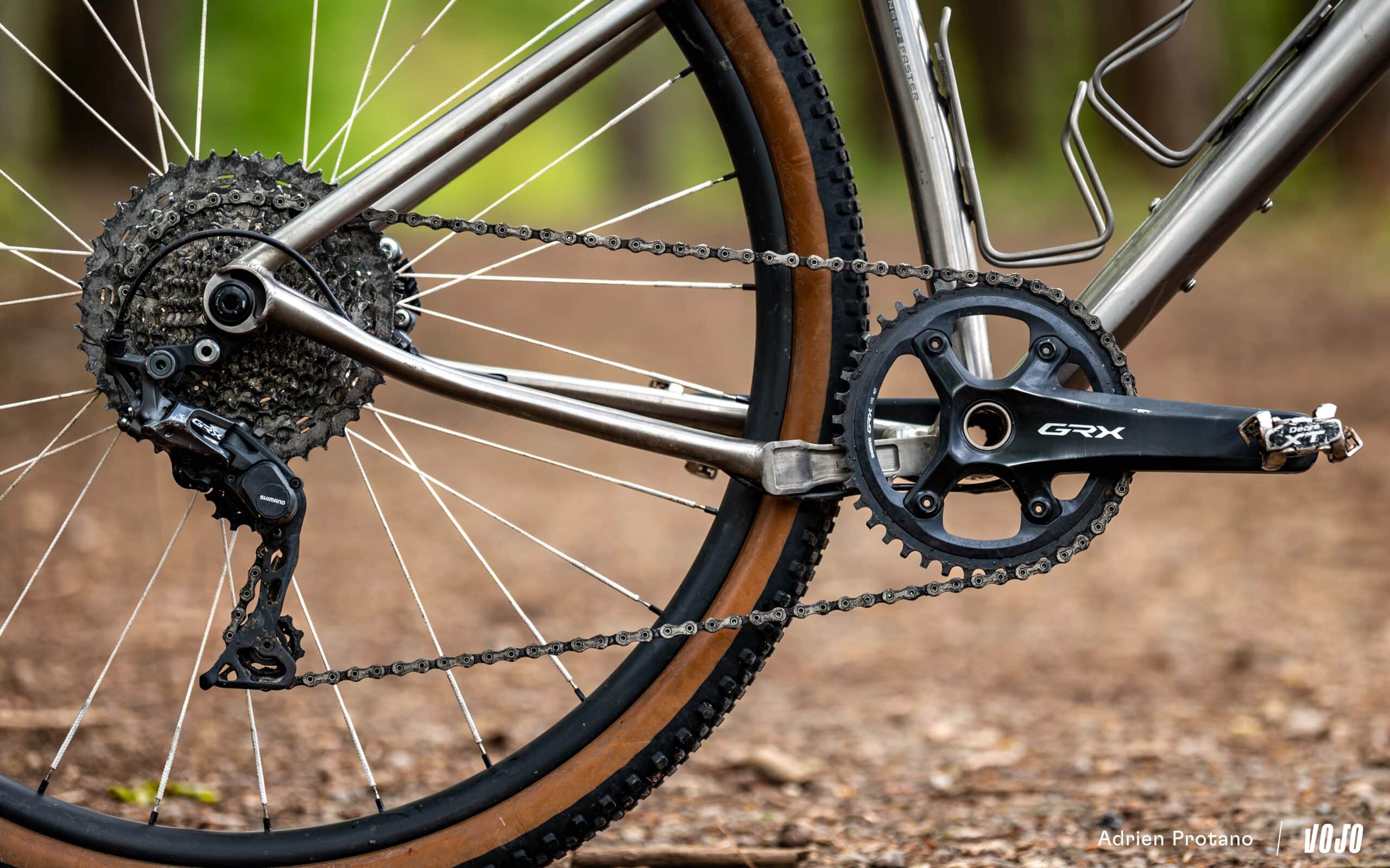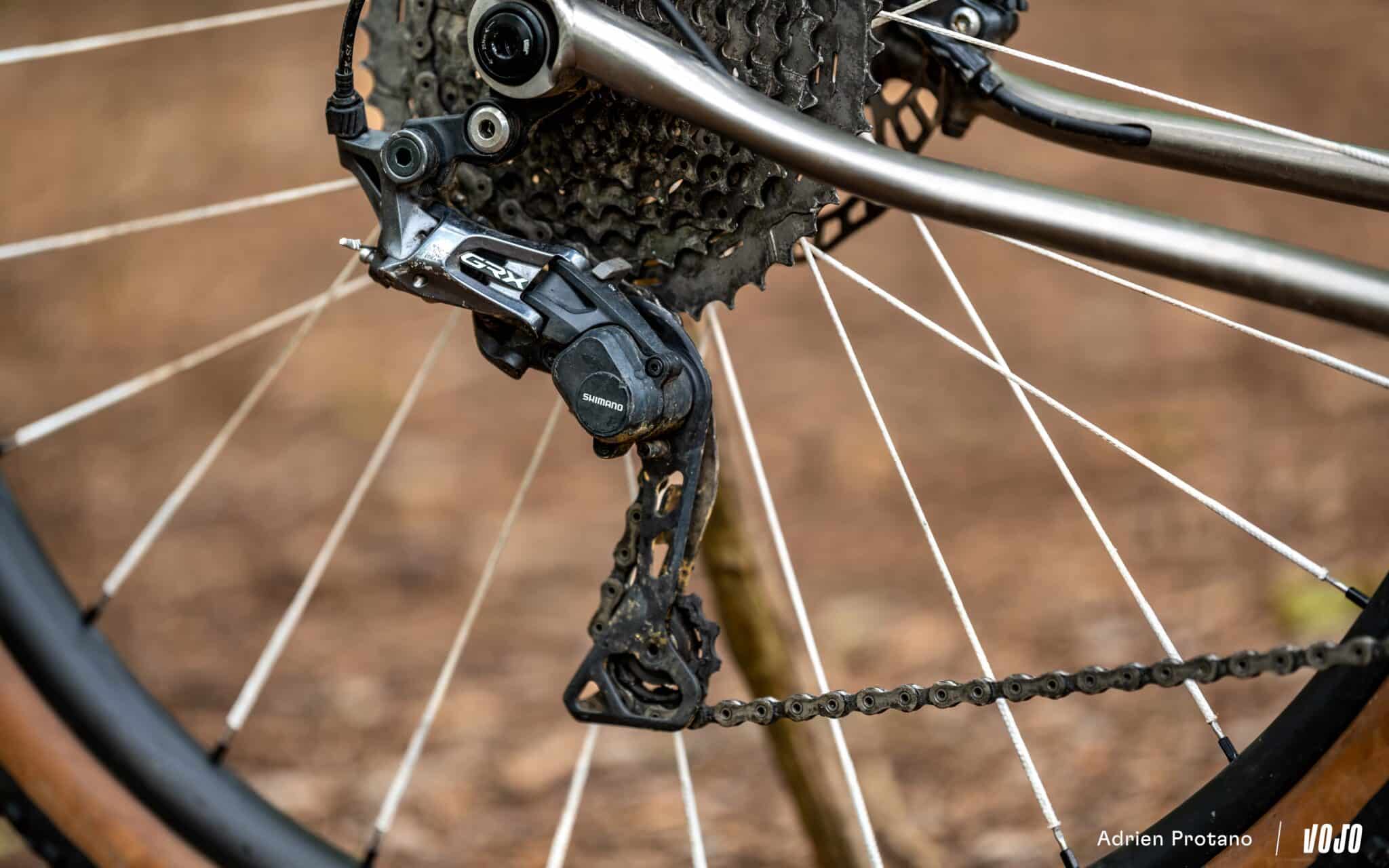 Pour le reste, nous avions sur notre modèle d’essai un montage en Shimano GRX800 11 vitesses avec cassette Shimano XT 11/46 et plateau de 42 dents. Clairement, vu le programme du Chiru Alpin, nous verrions plutôt un GRX 12 vitesses avec cassette 10/51 ou un groupe Sram AXS avec dérailleur VTT et cassette 10/52, histoire de pouvoir grimper du vraiment raide sans s’exploser les jambes. Côté freinage par contre, le groupe GRX s’est largement montré à la hauteur.