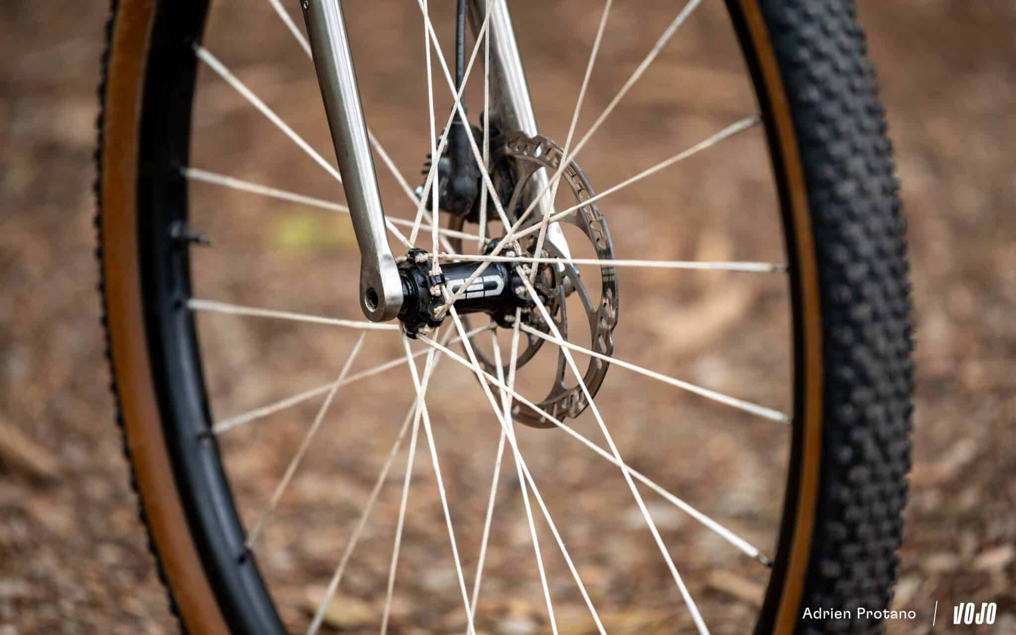 Un composant mérite aussi qu’on s’y attarde : les roues CEC à rayons Dyneema. Nous avons déjà eu l’occasion de vous parler de ces fameux rayons « textile » Berd qui sont utilisés ici et qui vont apporter aux roues plus de légèreté et plus de capacité de dissipation des vibrations que des rayons acier classiques. Ils collent parfaitement à la philosophie de l’Alpin et ils sont ici combinés à des jantes CEC en 24,5 mm de largeur interne et 25 mm de haut, et des moyeux CEC qui permettent d’arriver à tout juste 1000 g la paire. Outre ce test, nous avons eu l’occasion de les rouler lors d’un de nos voyages à Taïwan avec un vélo chargé de bagage pesant plus de 20 kg et elles avaient admirablement bien tenu !