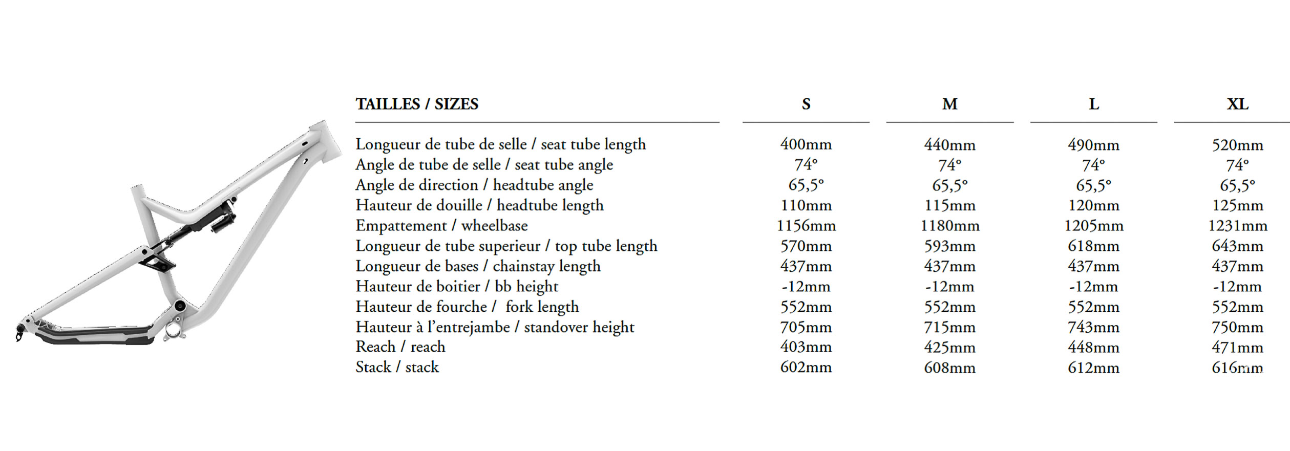L’empattement progresse par contre logiquement (1180 contre 1167mm) vu la nouvelle proue, tout comme l’angle de direction qui est de 65,5° contre 66° auparavant. La plus grosse modification concerne finalement l’angle de selle, qui passe de 72 à 74° pour placer le pilote dans une meilleure position lors des phases de pédalage. C’est de plus en plus tendance et nous trouvons que c’est une excellente chose ! Le cadre est disponible en 4 tailles (S, M, L et XL).