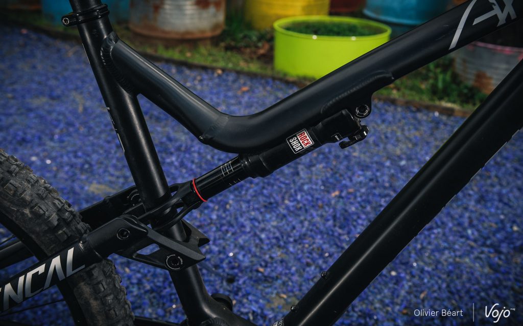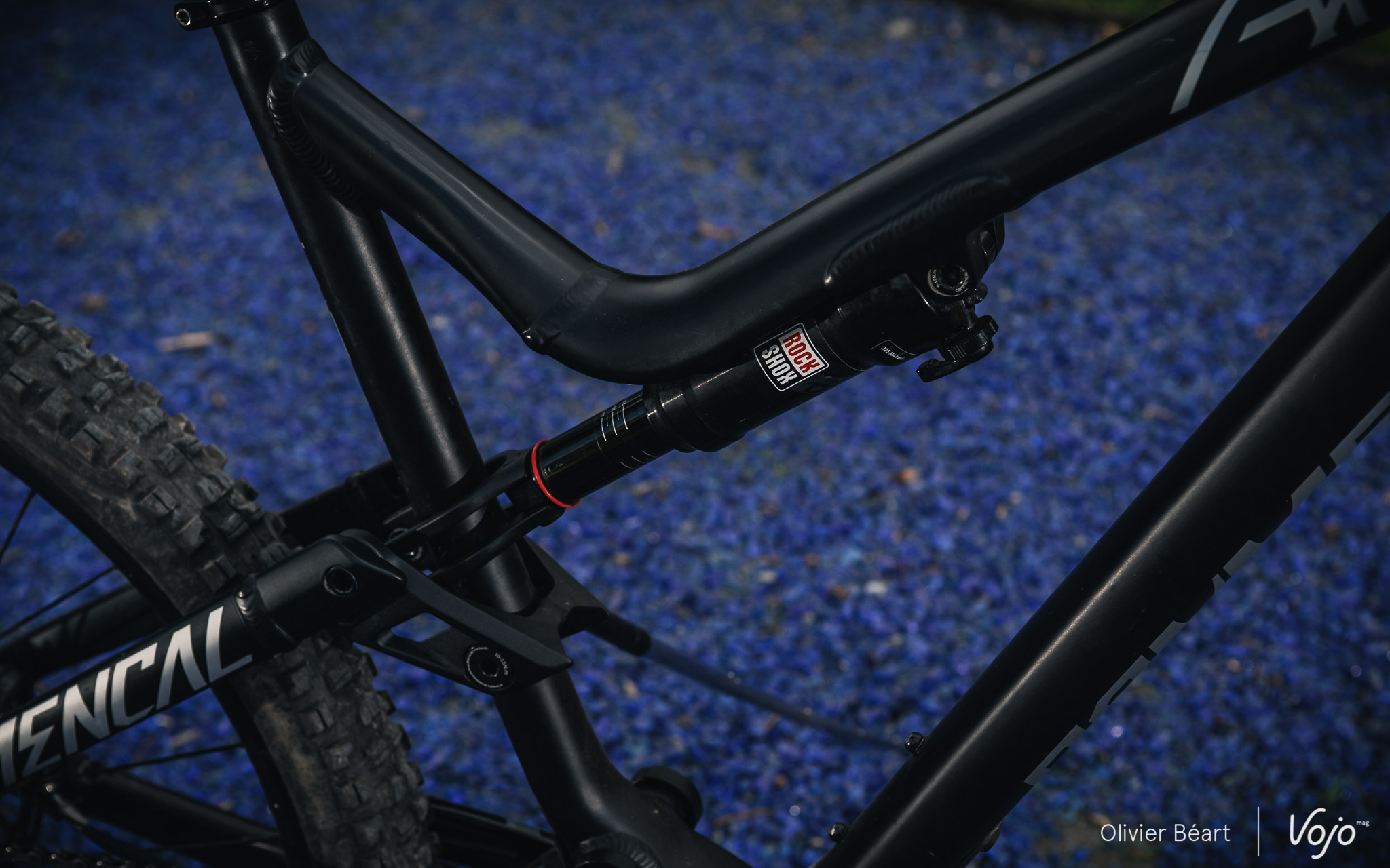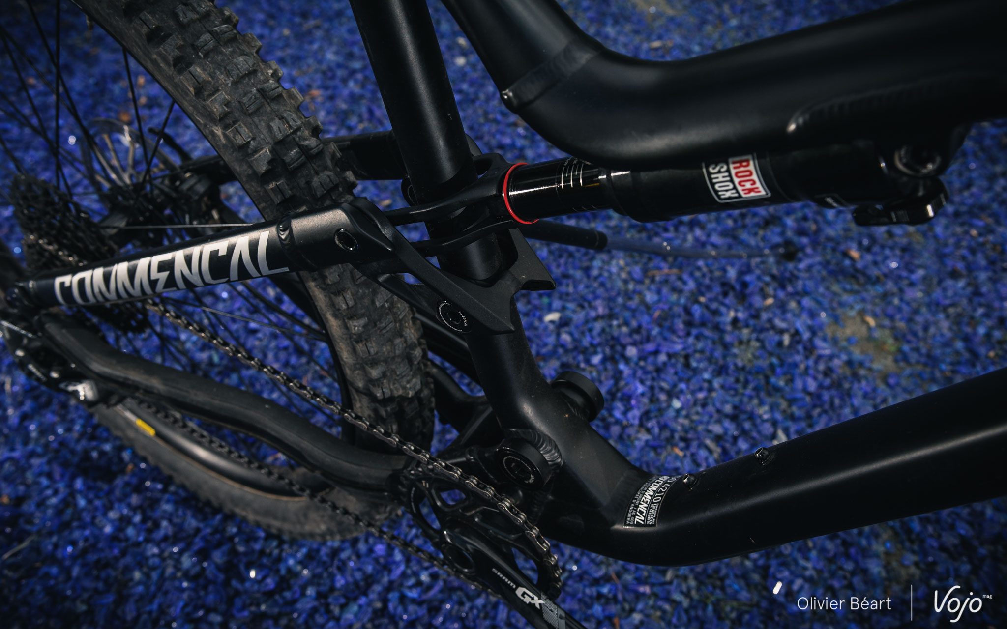 La cinématique ne change pas sur le principe et reste de type mono-pivot + biellette avec un point de pivot arrière placé sur les haubans. Le pivot principal reste placé haut, au niveau du sommet des dents d’un plateau de 32 dents comme celui monté d’origine sur le pédalier Sram GX, de sorte à obtenir une valeur d’anti-squat élevée (le Commencal Meta a toujours été connu pour être étonnamment bon au pédalage pour un vélo de ce type, et il entend le rester). Mais par contre, de petites évolutions de détail et le passage à un amortisseur au format Metric changent la donne.