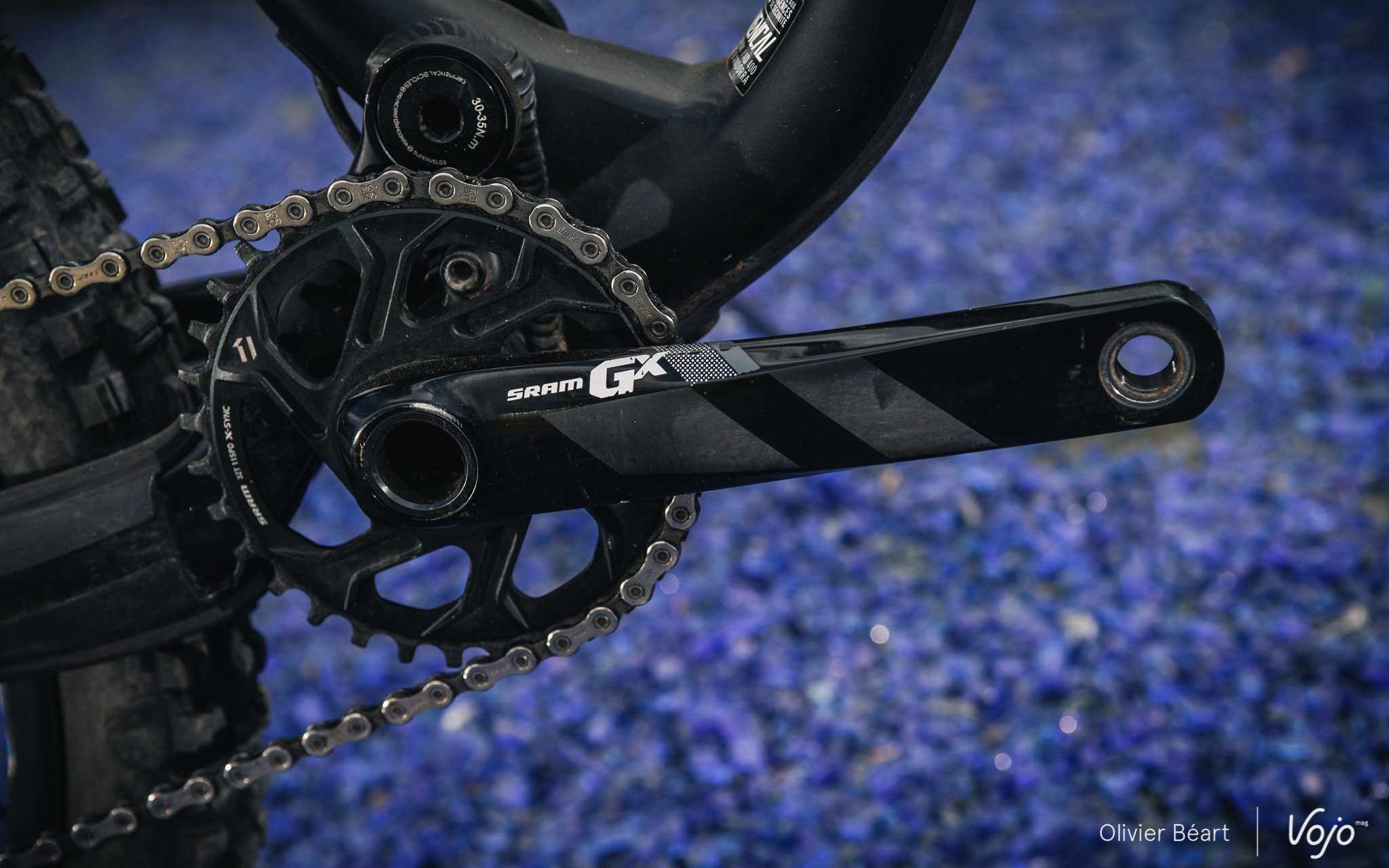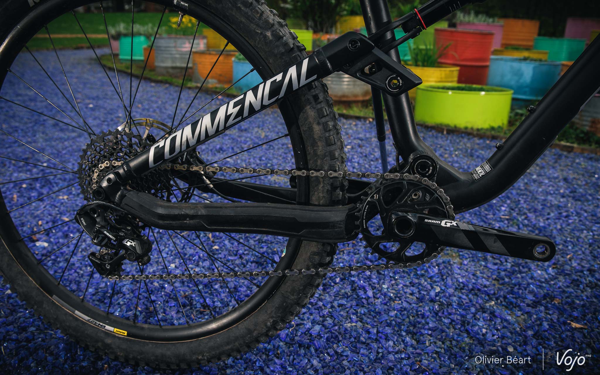 Pour ce test, nous avons choisi le Commencal Meta V4.2 Essential, positionné en milieu de gamme et affiché à 2999€ (tarif normal – mais 2799€ actuellement). Il est équipé d’une transmission Sram GX en 11 vitesses, et il faut monter vers le Race Eagle à 3499€ (également doté d’autres équipements plus haut de gamme) pour avoir du 12 vitesses en Sram XO Eagle. Mais il est fort probable qu’avec l’arrivée du Sram GX Eagle, une nouvelle version équipée de ce 12 vitesses plus accessible voit le jour. C’est d’ailleurs sur un Commencal Meta V4.2 issu de la flotte Sram (mais en version TR 130mm) que nous avons fait nos premiers essais du GX Eagle lors de sa sortie.