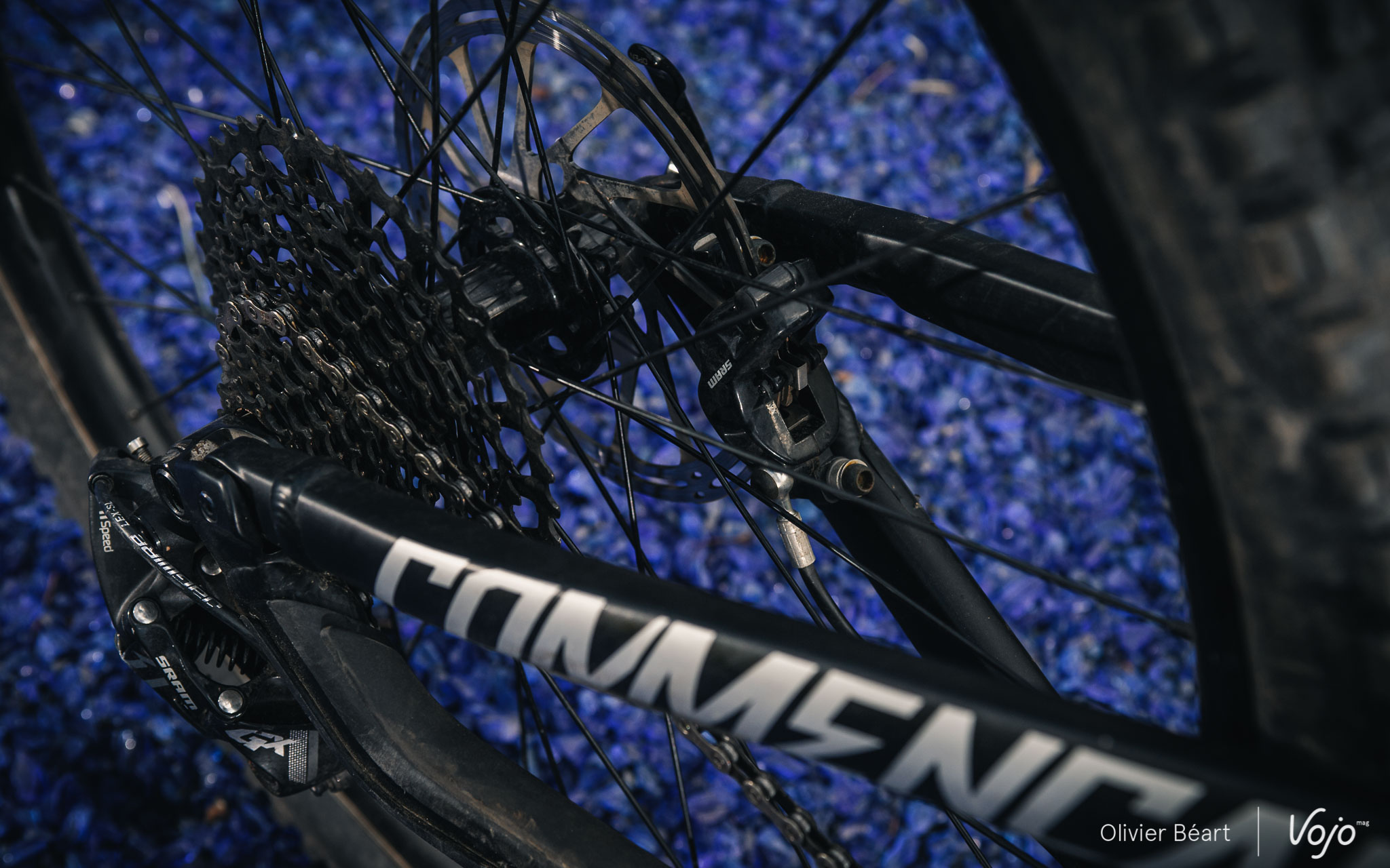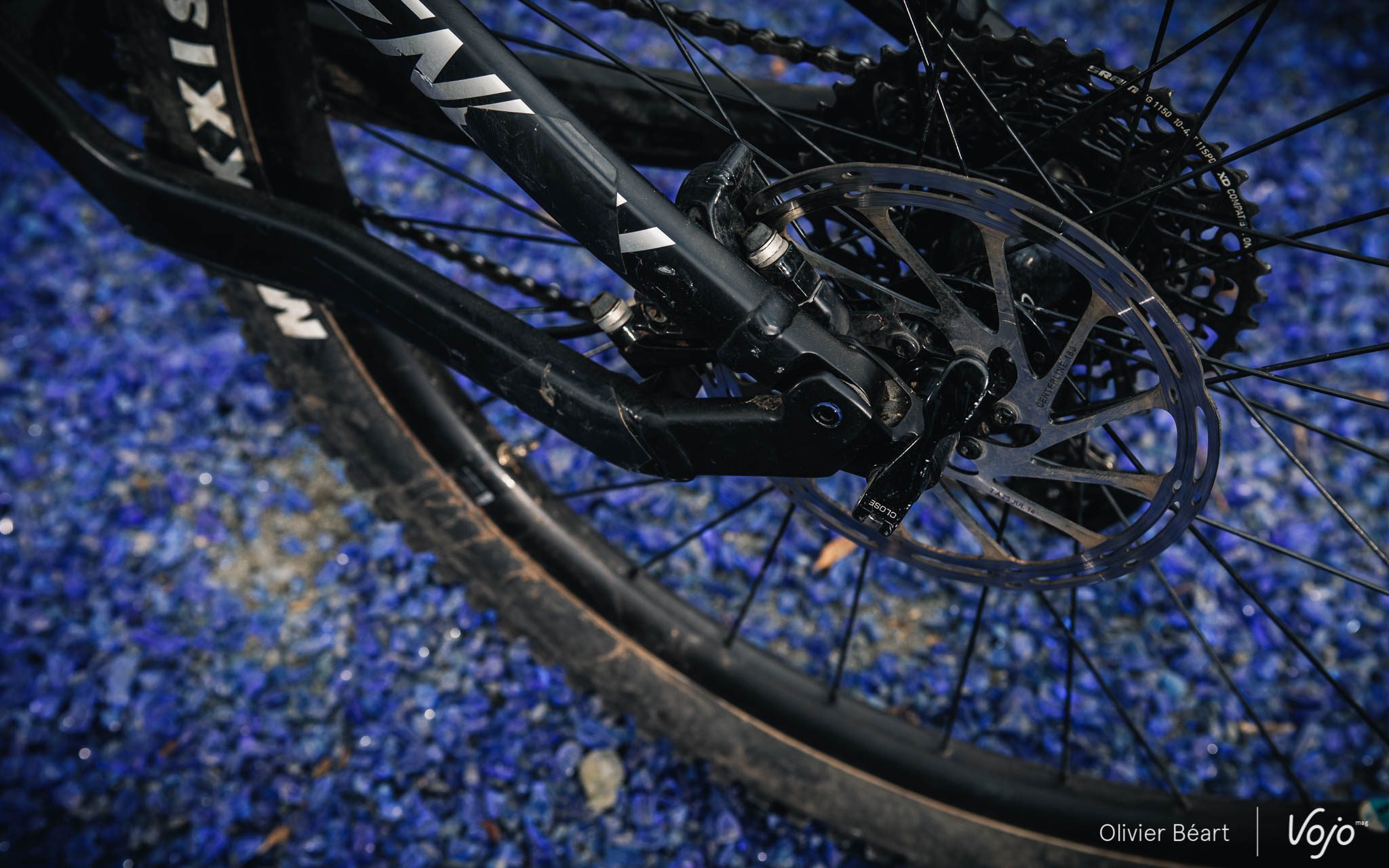 Parmi les autres détails qui fâchent, signalons aussi que nous avons dû resserrer plusieurs fois les axes et que les vis manquent de Loctite d’origine. Puis, il y a aussi la largeur du bras arrière, qui fait qu’on heurte souvent les bases et/ou les haubans à proximité de l’axe de roue arrière. A tel point qu’on en arrive parfois carrément à poser le talon sur la base près de l’étrier de frein ! Enfin, le système de serrage de la roue est plutôt cheap et, même s’il ne s’est jamais desserré lors du test, il ne met pas en confiance. Voilà des points sur lesquels Commencal devra selon nous travailler pour une prochaine évolution.