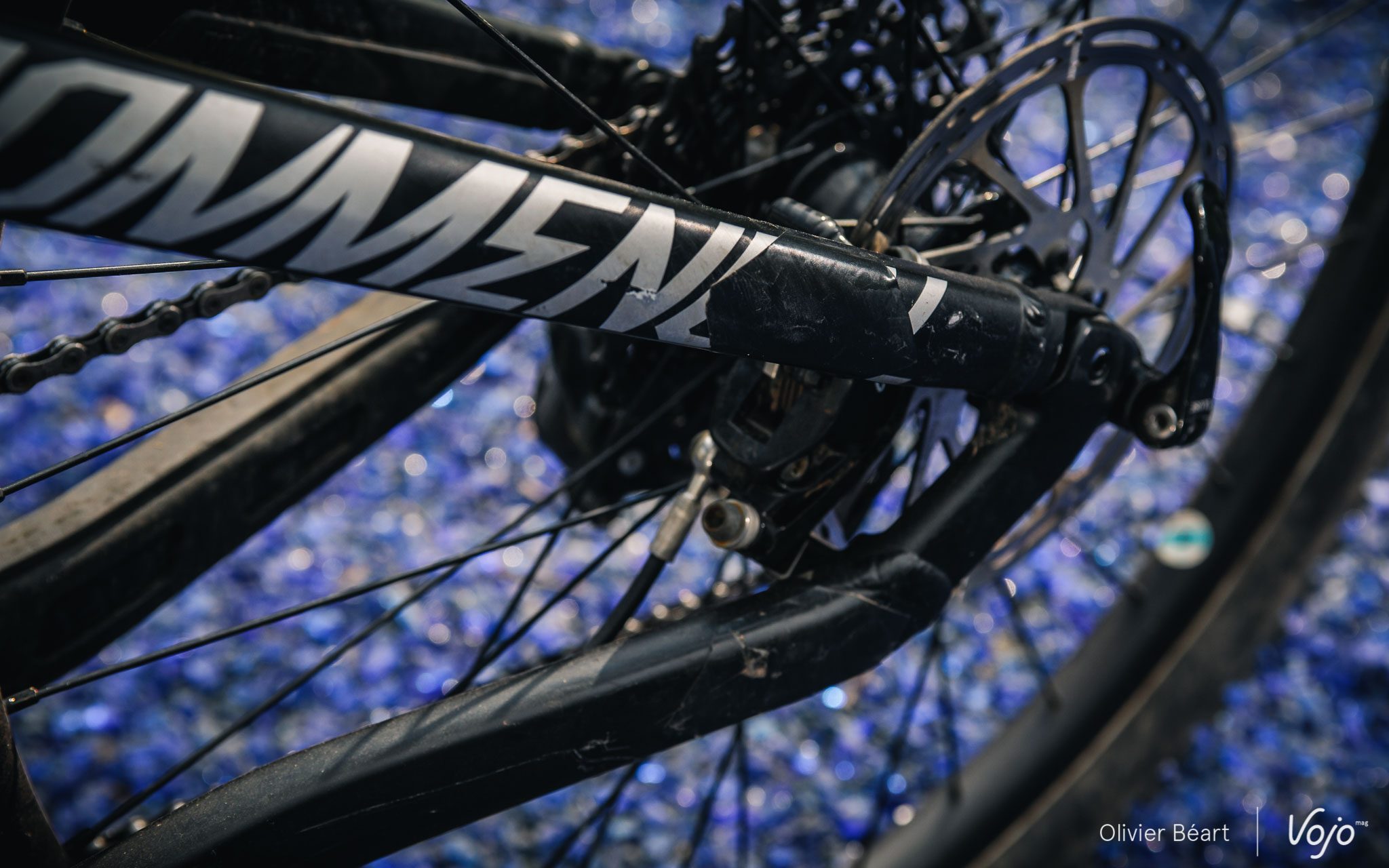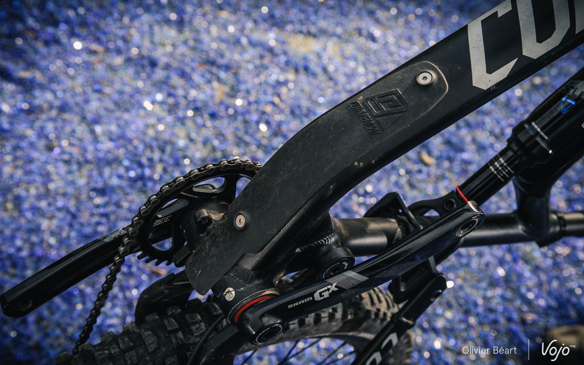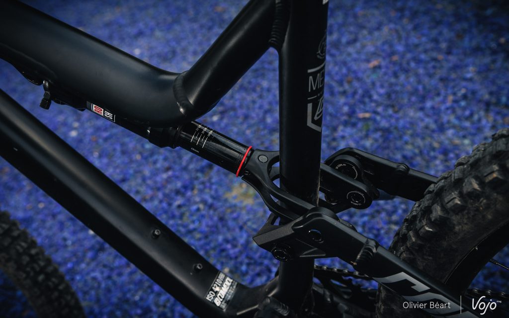 Par contre, on s’étonne que des gars comme Barelli ou une « forte femme » au pilotage incisif comme Cécile Ravanel s’accommodent de ce trait de caractère. Pour nous, sans transformer le vélo en barre à mine, un peu plus de rigidité serait vraiment bienvenue et nous pensons que c’est au niveau des points de pivot que cela se joue. Plus particulièrement au niveau de la biellette supérieure dont on peut voir les nombreuses pièces bouger généreusement quand on prend la roue arrière et le triangle avant en mains.