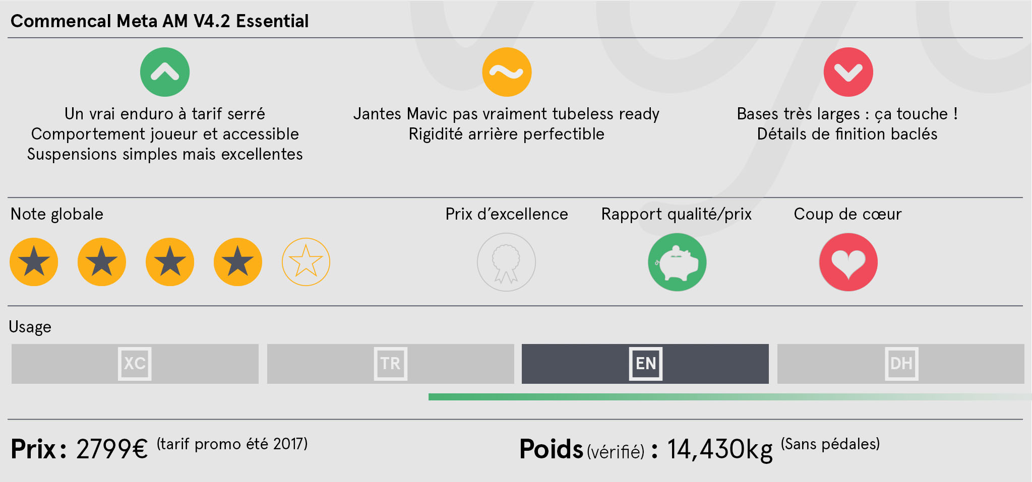 Par rapport au V4, ce Commencal Meta AM V4.2 est clairement plus typé enduro. 10mm de débattement en plus, c’est peu sur le papier, mais s’il ressemble encore beaucoup à son prédécesseur, sur le terrain son comportement est assez différent. Le Meta pédale toujours très bien et c’est tant mieux car sans rien perdre de ce côté, il gagne sur les autres tableaux avec une suspension arrière nettement plus efficace et homogène, bien en phase avec le programme. Son côté « vélo facile » en fait un des rares enduros vainqueurs en EWS qu’on peut conseiller sans équivoque à un enduriste débutant. C’est d’autant plus vrai que les tarifs auxquels le Commencal Meta AM V4.2 est proposé (moins de 3000€ pour cette version) le rendent aussi accessible à beaucoup plus de bourses que la plupart des vraies machines d’enduro au caractère afirmé. Oui, son cadre gagnerait à être plus rigide, la largeur de son bras arrière est gênante et, en noir, la finition du cadre laisse à désirer quand on y regarde de près. Mais l’ensemble proposé par Commencal n’en reste pas moins très séduisant, efficace et attachant grâce à une suspension aujourd’hui parfaitement aboutie et à une géométrie qui met le plaisir au centre des préoccupations. Au final, c’est cela qu’on retient et qui justifie un coup de coeur même si, objectivement, il ne peut pas encore briguer la note maximale et s’il doit son passage de 3,5 à 4 étoiles à son tarif qui le place parmi les meilleures affaires du moment. Et aussi car nous préférons les vélos imparfaits mais de caractère à d’autres plus policés mais qui en deviennent parfois insipides.