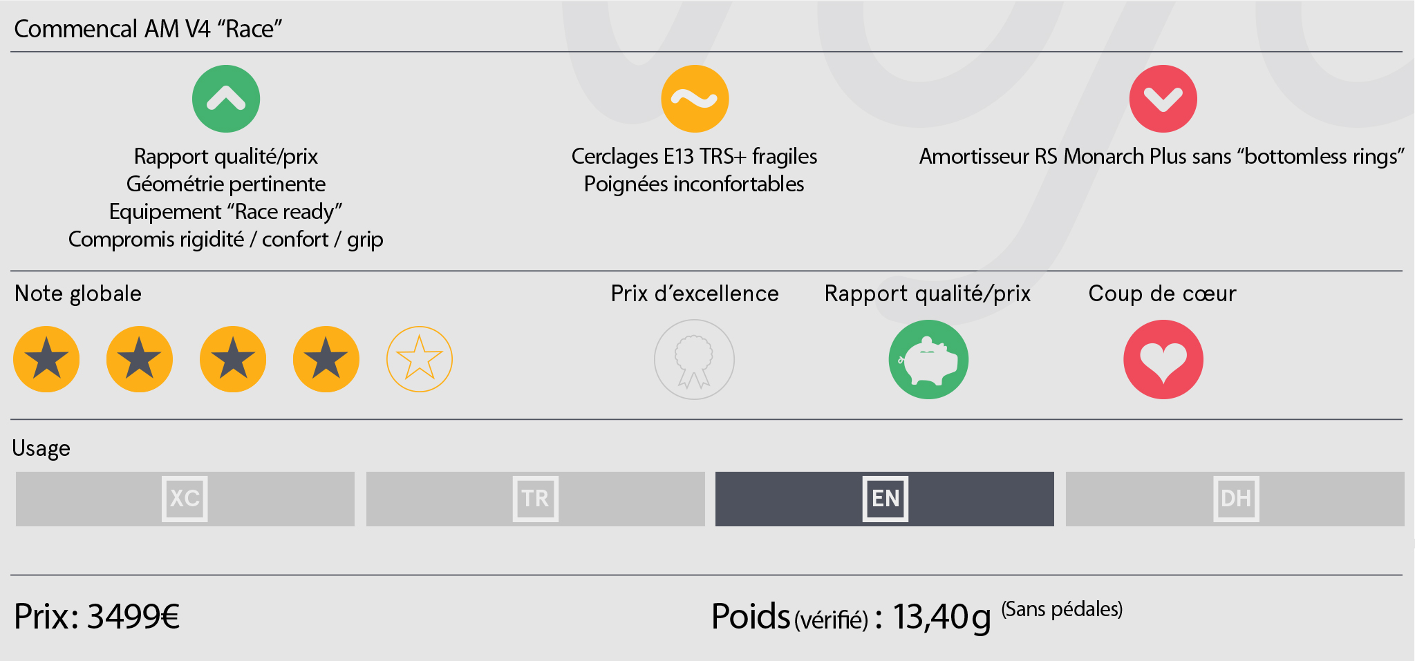 Vu les mensurations de notre testing team made in Elsass, notre modèle de test nous est arrivé en taille L et il s’est avéré parfaitement adapté pour les pilotes de plus d’1m80. Nous l’avons pesé, sans pédales, à 13,4kg. À l’heure de la conclusion, ce Meta ne nous laisse vraiment pas indifférents. Commencal a réussit à faire naître un enduro réellement polyvalent, autant en terme d’aptitude sur le terrain qu’en possibilité d’exploitation par des pilotes aux profils différents. Avec un rapport qualité prix plus qu’intéressant, ce Meta v4 conviendra à un large spectre de pratiquants. Facile à prendre en main et relativement peu exigeant, il est accessible à des pilotes loisirs. Le Commencal Meta ne vole pourtant pas son appellation « race » puisqu’il reste une très bonne arme pour un enduro au format rallye qui permettra aux pilotes de bon niveau de s’amuser pleinement. Cet aluminium est bien proportionné et est prêt à encaisser. Il va vite et laisse une belle place au fun. Le Meta V4 conviendra à 85% des compétiteurs. Pour les 15% restants, une session de test et de réglages sera nécessaire. Il sera primordial de trouver les bons settings de suspension et une nouvelle paire de roues. Il est d’ailleurs intéressant de rappeler que Commencal propose depuis l’année dernière un programme « à la carte » qui permet de personnaliser l’équipement de son vélo. Une solution intéressante pour les pilotes exigeants.