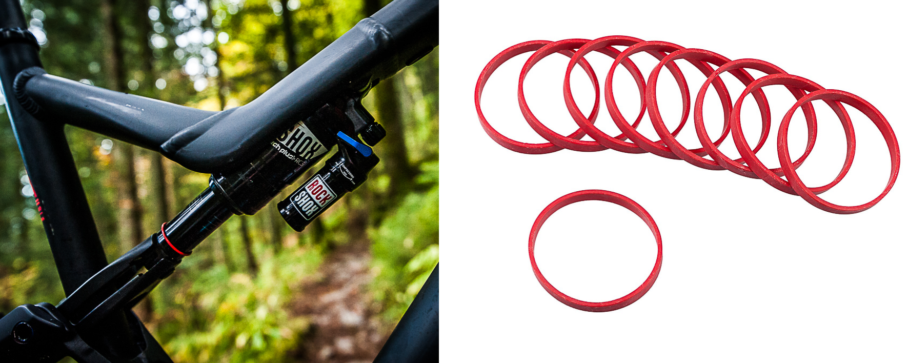 Ce constat ne nous semblant pas en accord avec le travail fourni par la marque sur ce vélo et la pratique pour laquelle il se destine, nous contactons cette dernière. Commencal nous conseille alors d’utiliser des « bottomless rings », de petits ronds rouges en plastique qui agissent comme des « tokens » en réduisant le volume d’air de l’amortisseur. La procédure est simple, à la portée de tous et est réalisée en moins de 10 minutes. Une fois dégonflé, on dévisse simplement le cylindre principal de l’amortisseur et on y place entre 3 et 5 « bottomless rings » (3 dans notre cas) avant de repartir à l’assaut des sentiers.
