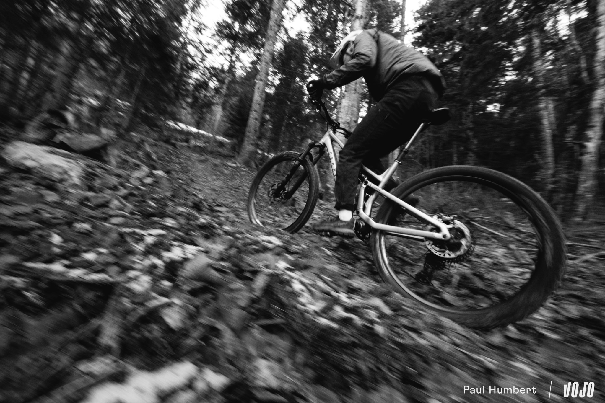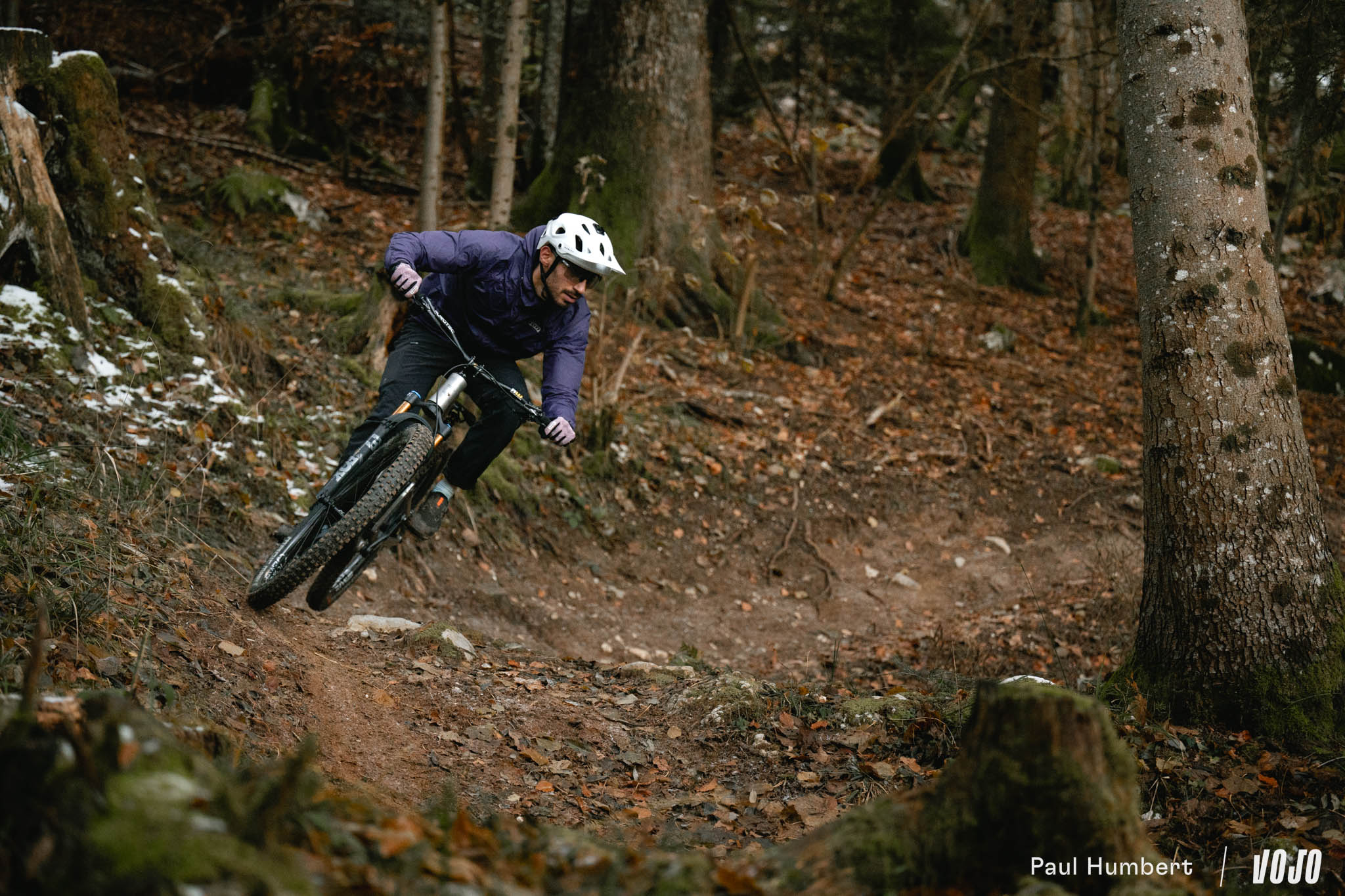 Quand on sort de ce terrain pour s’aventurer dans des choses un peu plus techniques, caillouteuses ou racineuses, le Tempo demande d’être tenu un peu plus. Entre les roues plutôt rigides qui ne font pas grand-chose pour aider et cette suspension qui pousse, il faut un minimum de niveau et d’expérience pour s’amuser, mais le vélo s’en sort encore bien grâce à la géométrie (les 65,5° d’angle de direction notamment), au débattement de 140 mm à l’avant et aux composants adaptés, comme les gros pneus ou la fourche qui ne s’affaisse pas.