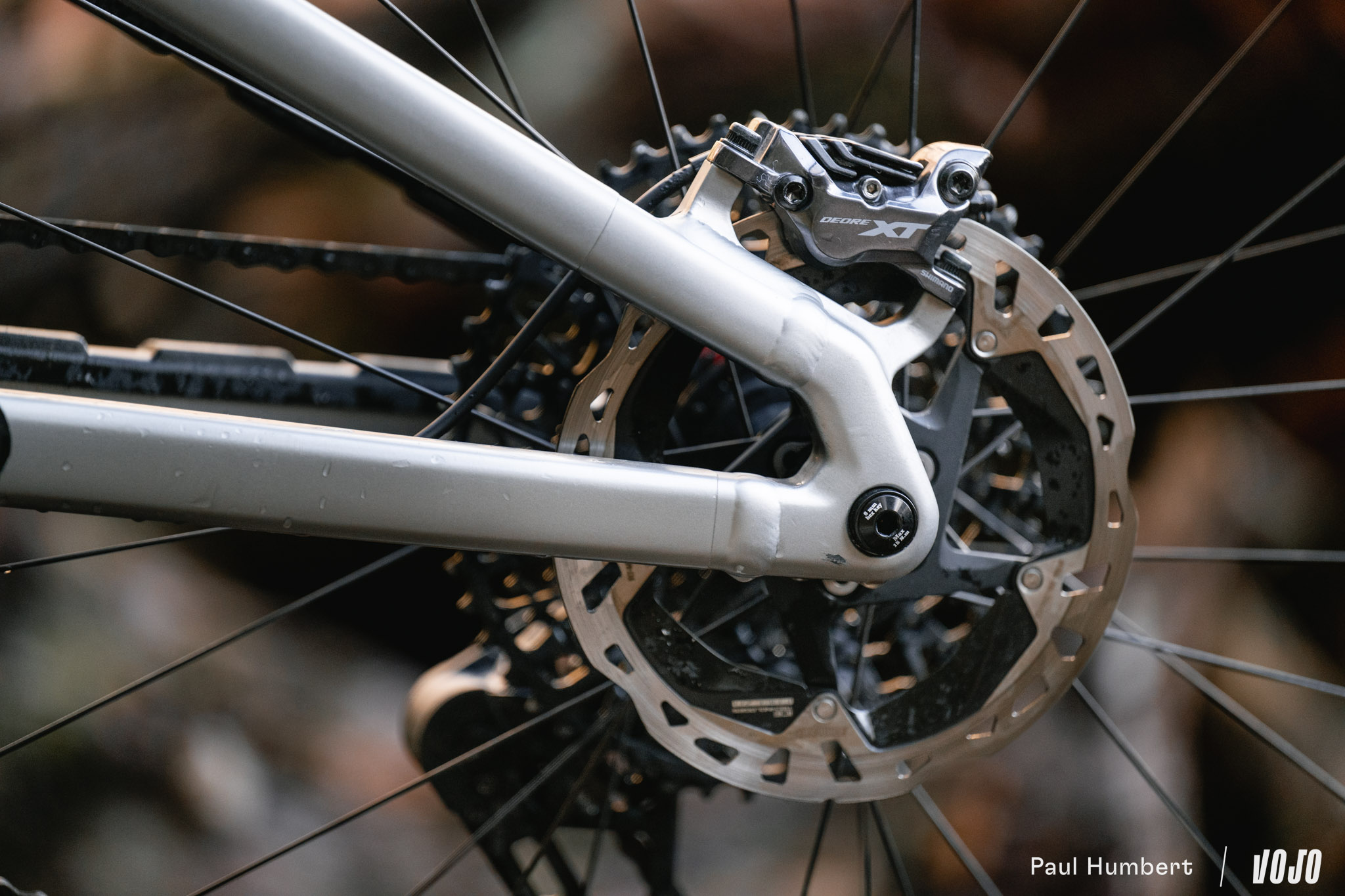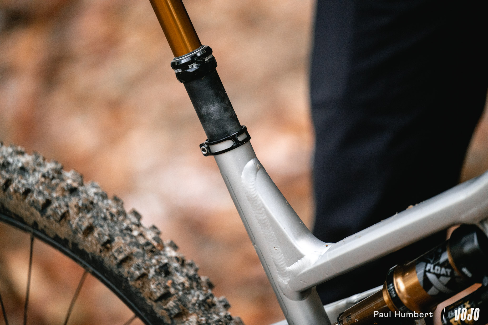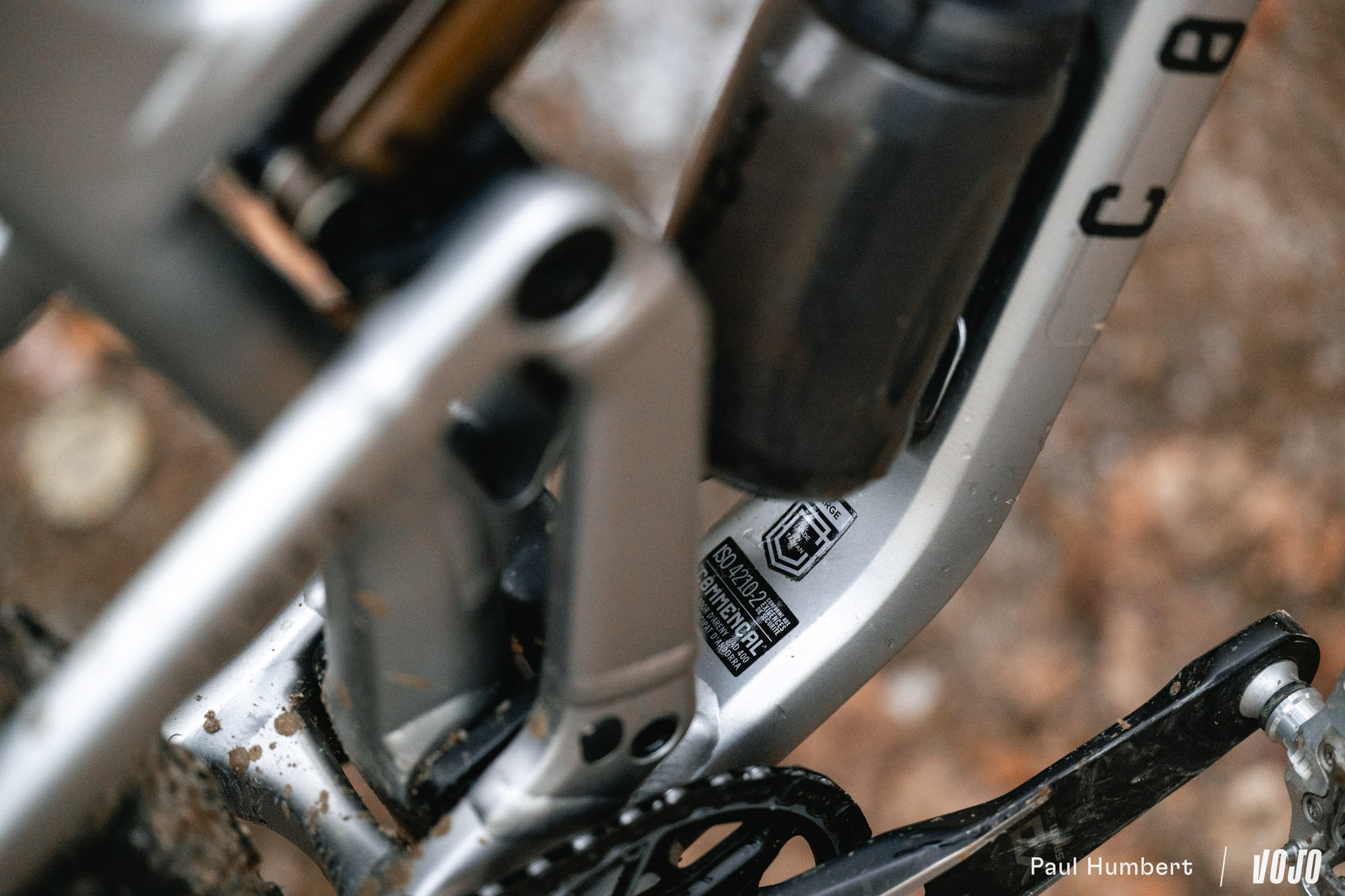 On termine ce tour du châssis avec un mot sur la finition. Elle est magnifique dans cette version Silver, qui rappelle l’aluminium brut en plus fin et plus sombre, mais malheureusement assez fragile. Petits cailloux ou gravillons mal placés, molette de réglage de l’amortisseur en le démontant pour atteindre les fameuses vis de la suspension… Il est facile de laisser des petites marques sur le cadre. Dans ces conditions, on ne saurait trop vous recommander l’installation d’un kit de protection intégral type Slicy Sublimistick ou RideWrap dès l’achat du vélo.
