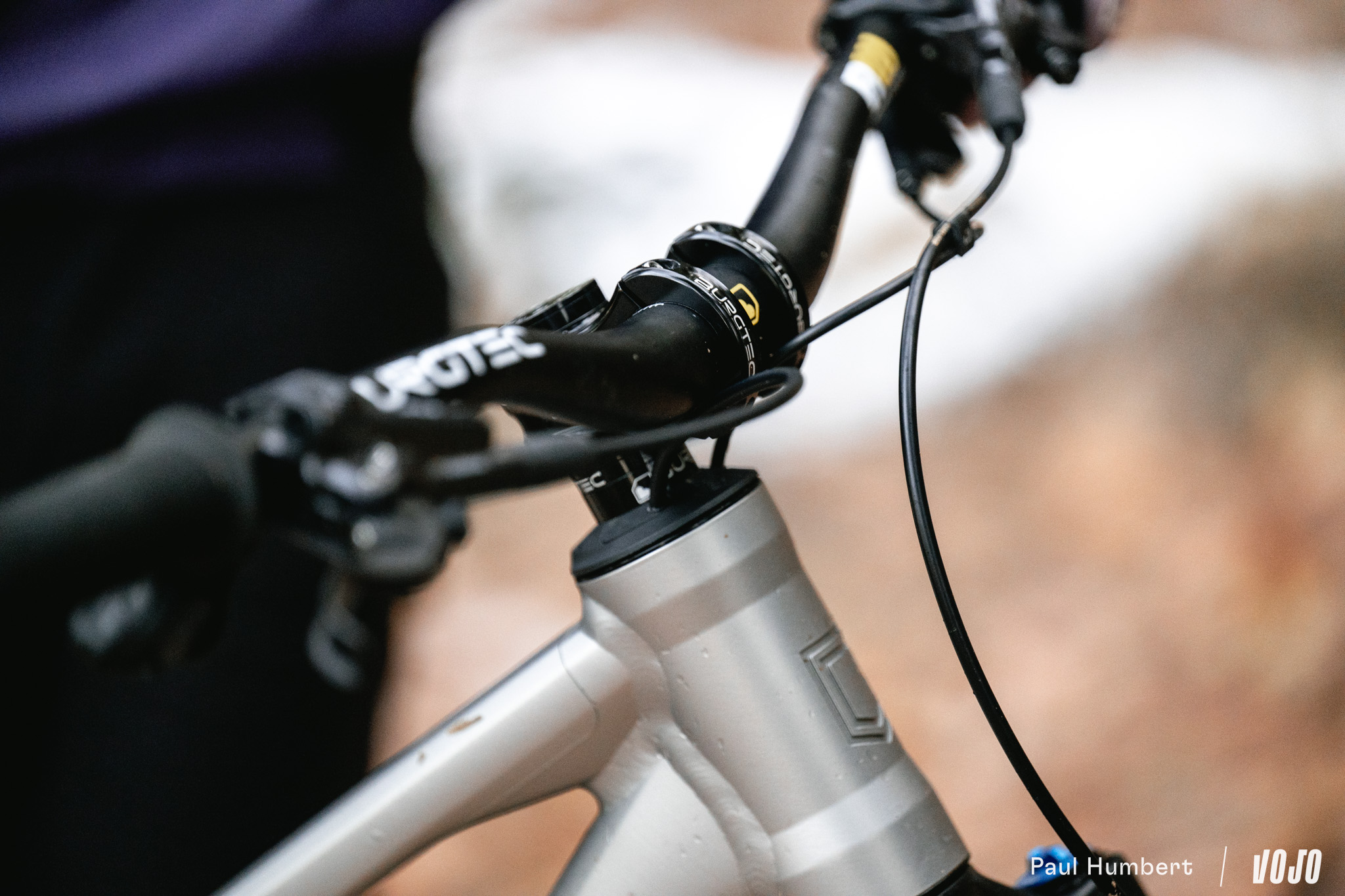 Enfin, les périphériques sont tous issus de marques reconnues : poste de pilotage Burtec en aluminium avec poignées ODI, selle Fizik et tige de selle Fox Transfer Factory qui nous a d’ailleurs posé quelques problèmes de fluidité en raison du cheminement anguleux du cable dans le cadre.
