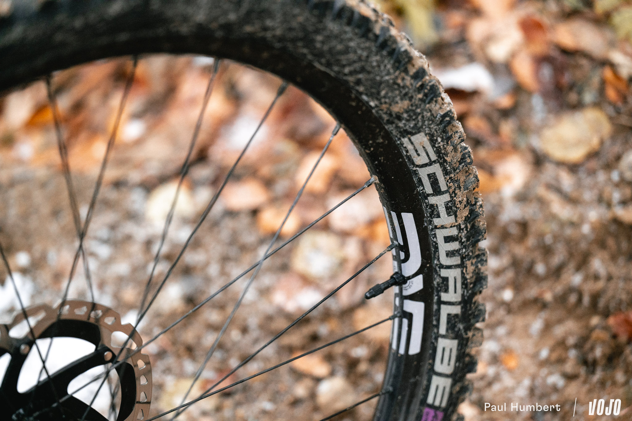Pour le train roulant, attention les yeux : la marque a choisi pour nous des roues en carbone Enve AM 30 (sur moyeux Industry Nine) avec des pneus Schwalbe en carcasse SuperTrail, profil Tacky Chan et gomme Soft à l’arrière avec un Magic Mary en SuperSoft à l’avant.