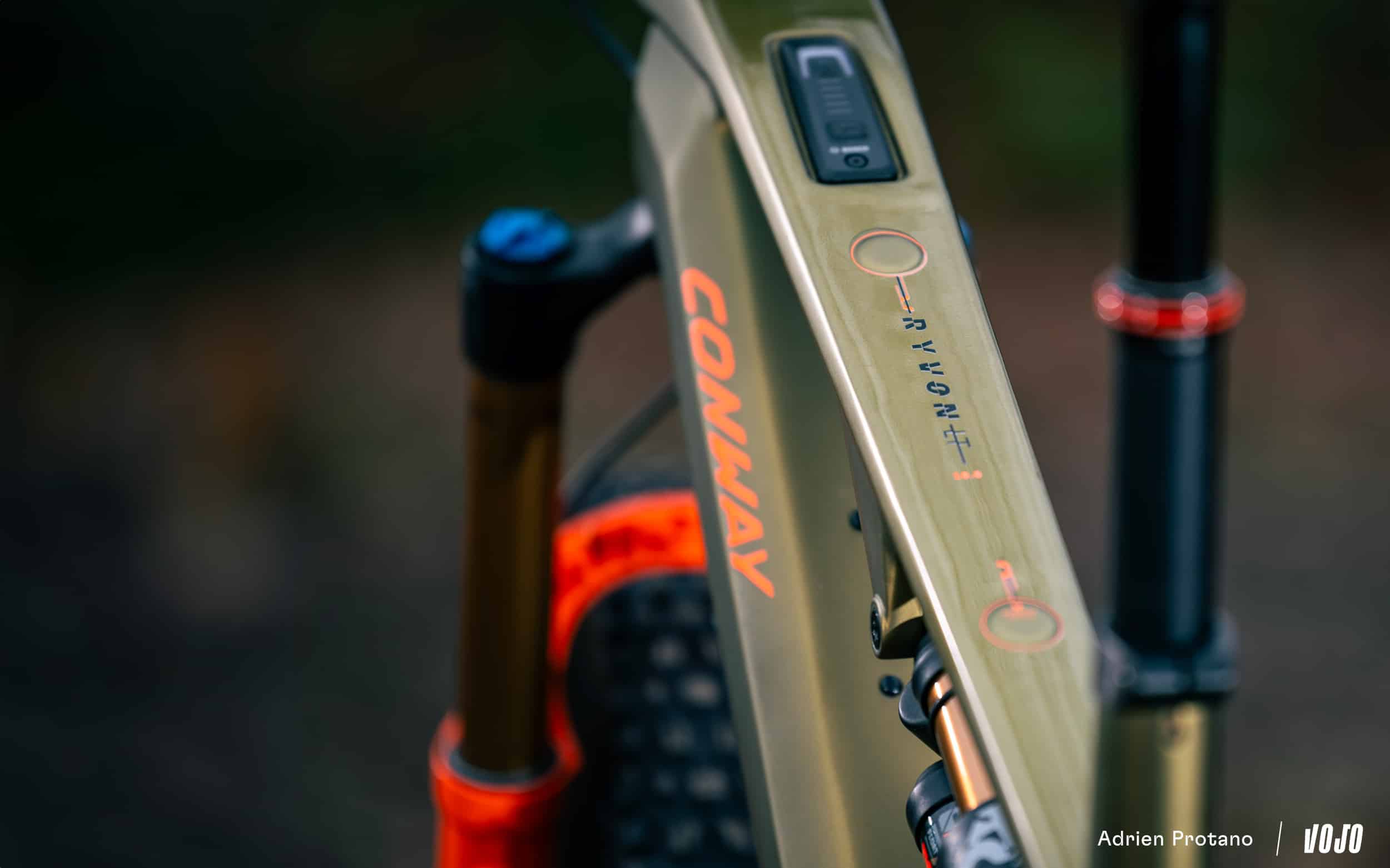 On notera que ce Conway Ryvon n’est pas équipé d’un port de recharge intégré, et qu’il est donc nécessaire de recharger la batterie en dehors du vélo. Cela permet selon la marque d’obtenir un châssis bien plus rigide étant donné qu’il n’est pas nécessaire de prévoir un trou de plusieurs centimètres au sein du cadre.