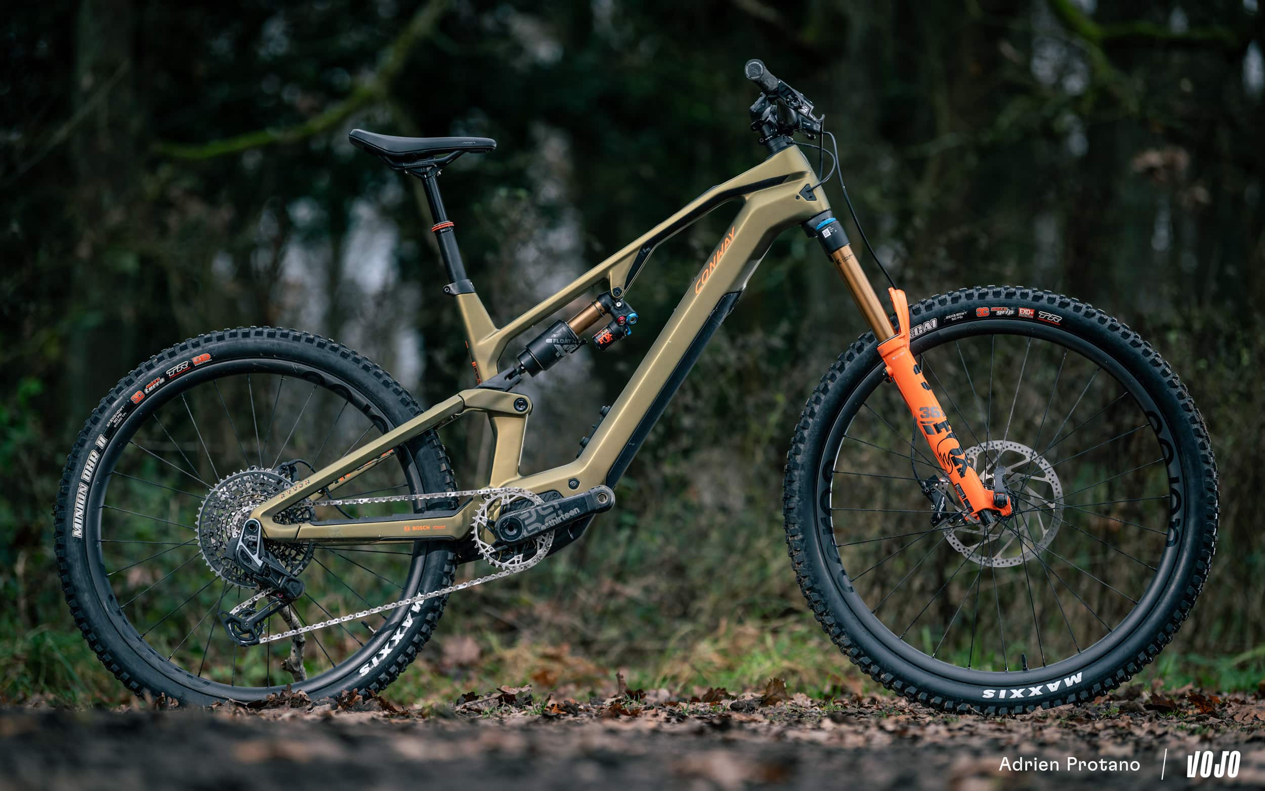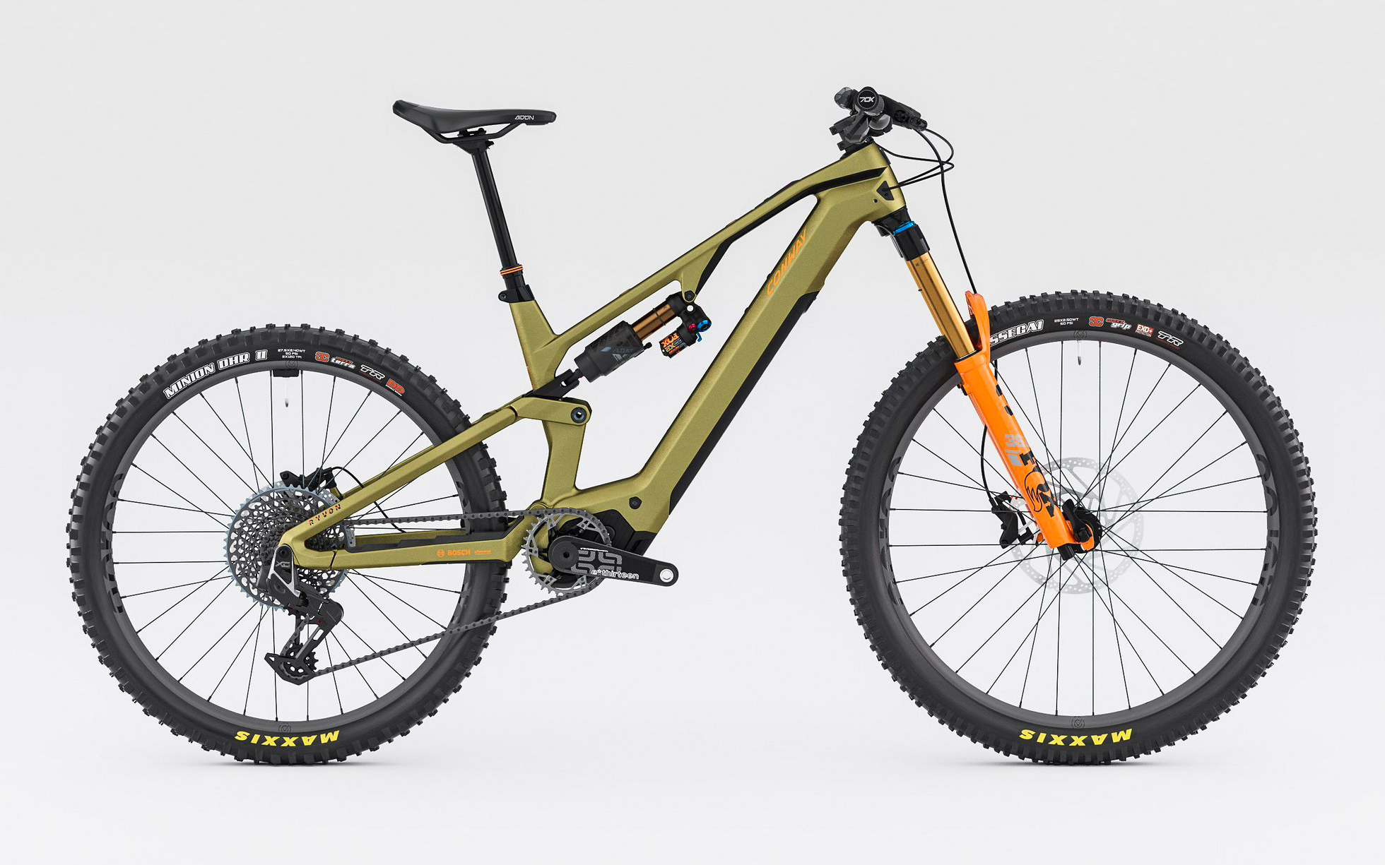 - Conway Ryvon LT 10.0 (9499€) : fourche Fox 36 Factory, amortisseur Fox X2 Factory, transmission Sram T-Type AXS X0, freins Tektro DH-R Evo, roues Acros Enduro Carbon