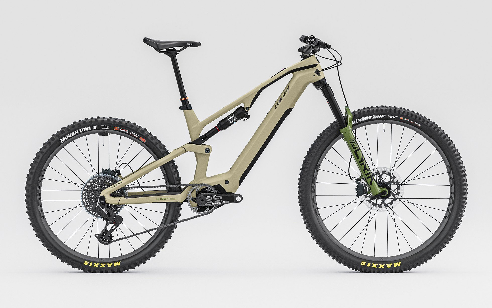 - Conway Ryvon ST 10.0 (9499€) : fourche RockShox Lyrik Ultimate, amortisseur RockShox Deluxe Select+, transmission Sram T-Type AXS XO, freins Magura MT7, roues Acros Enduro Carbon