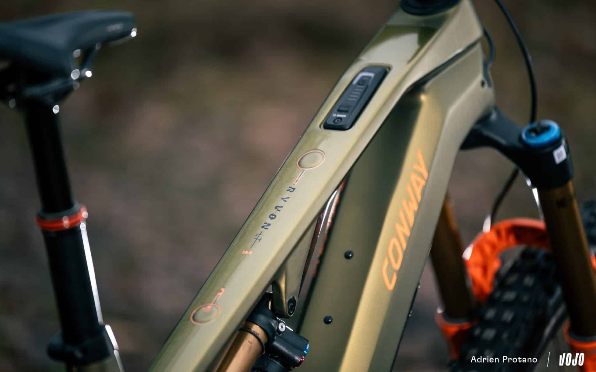 On notera que ce Conway Ryvon n’est pas équipé d’un port de recharge intégré, et qu’il est donc nécessaire de recharger la batterie en dehors du vélo. Cela permet selon la marque d’obtenir un châssis bien plus rigide étant donné qu’il n’est pas nécessaire de prévoir un trou de plusieurs centimètres au sein du cadre.