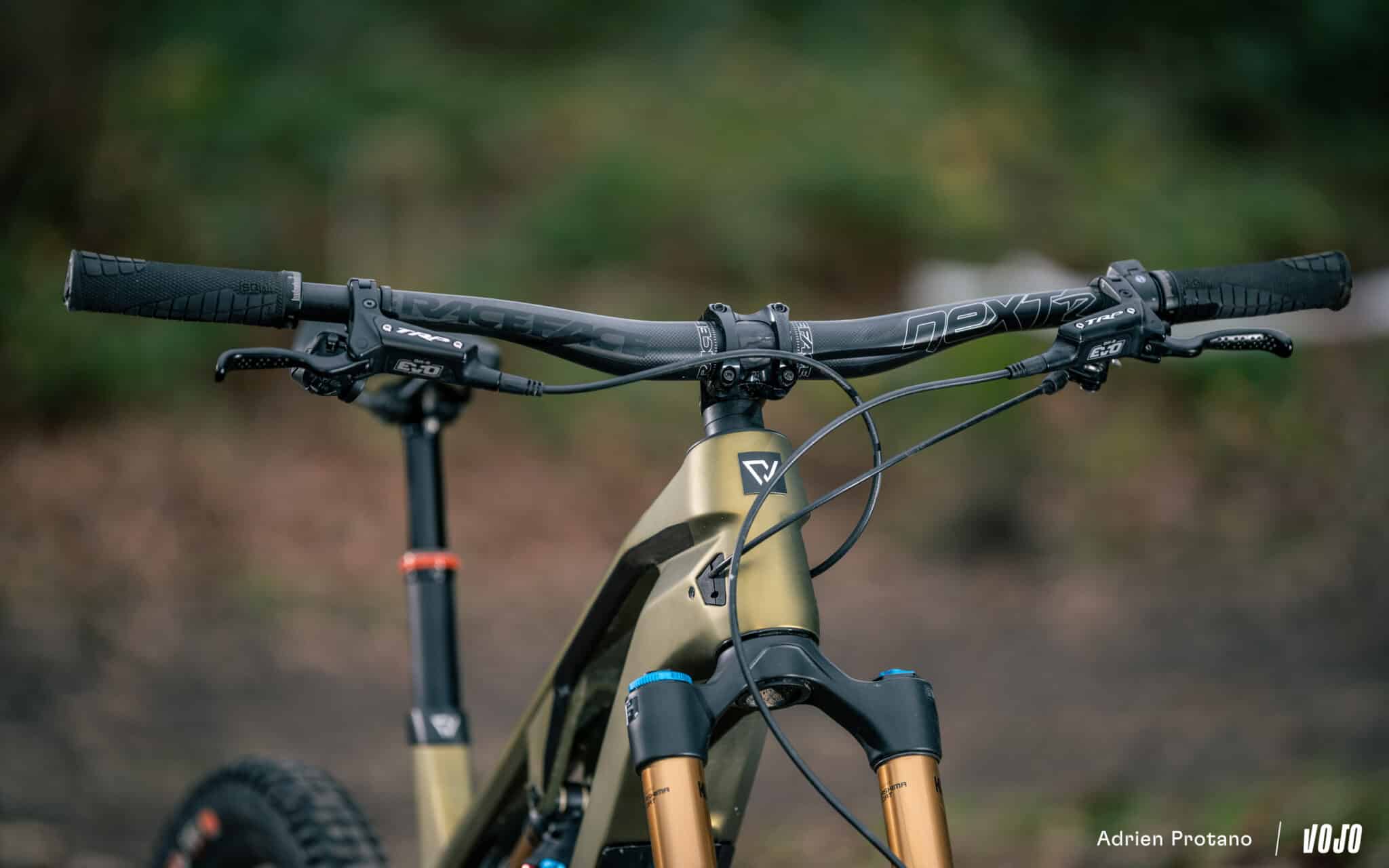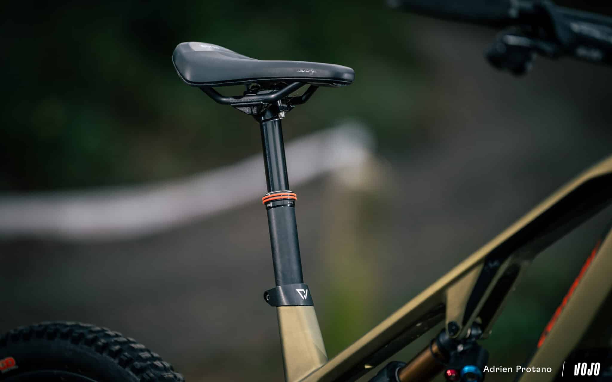 Le poste de pilotage est composé d’un ensemble cintre-potence en provenance de chez Race Face, avec un cintre en 760 mm de largeur et une potence de 32 mm. La tige de selle télescopique est une Vecnum Nivo offrant 150 mm de développement, surmontée d’une selle Fizik Terra Aidon X1.