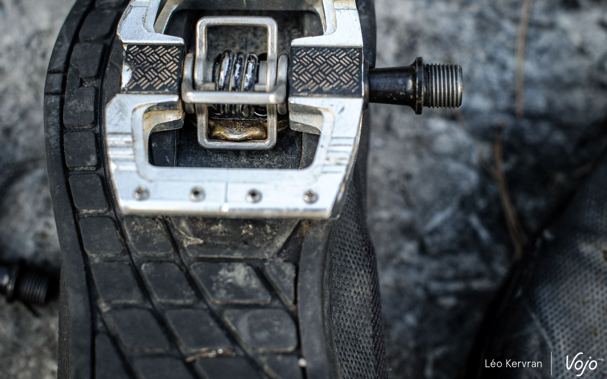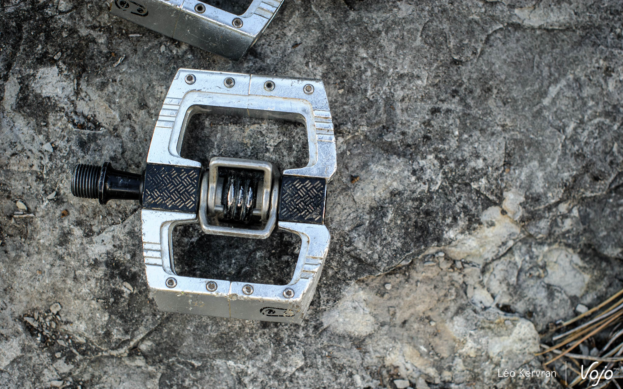 Côté matériaux, c’est donc de l’aluminium pour la cage mais tout le reste est en acier : chromoly forgé pour l’axe, inoxydable pour les ailettes et le ressort. Dernière caractéristique importante, le centre de la pédale est positionné à 57 mm de la manivelle là où la concurrence est plutôt à 55 mm. Un axe plus long, c’est plus de stabilité mais cela peut aussi avoir des inconvénients comme nous l’avons constaté sur le terrain.