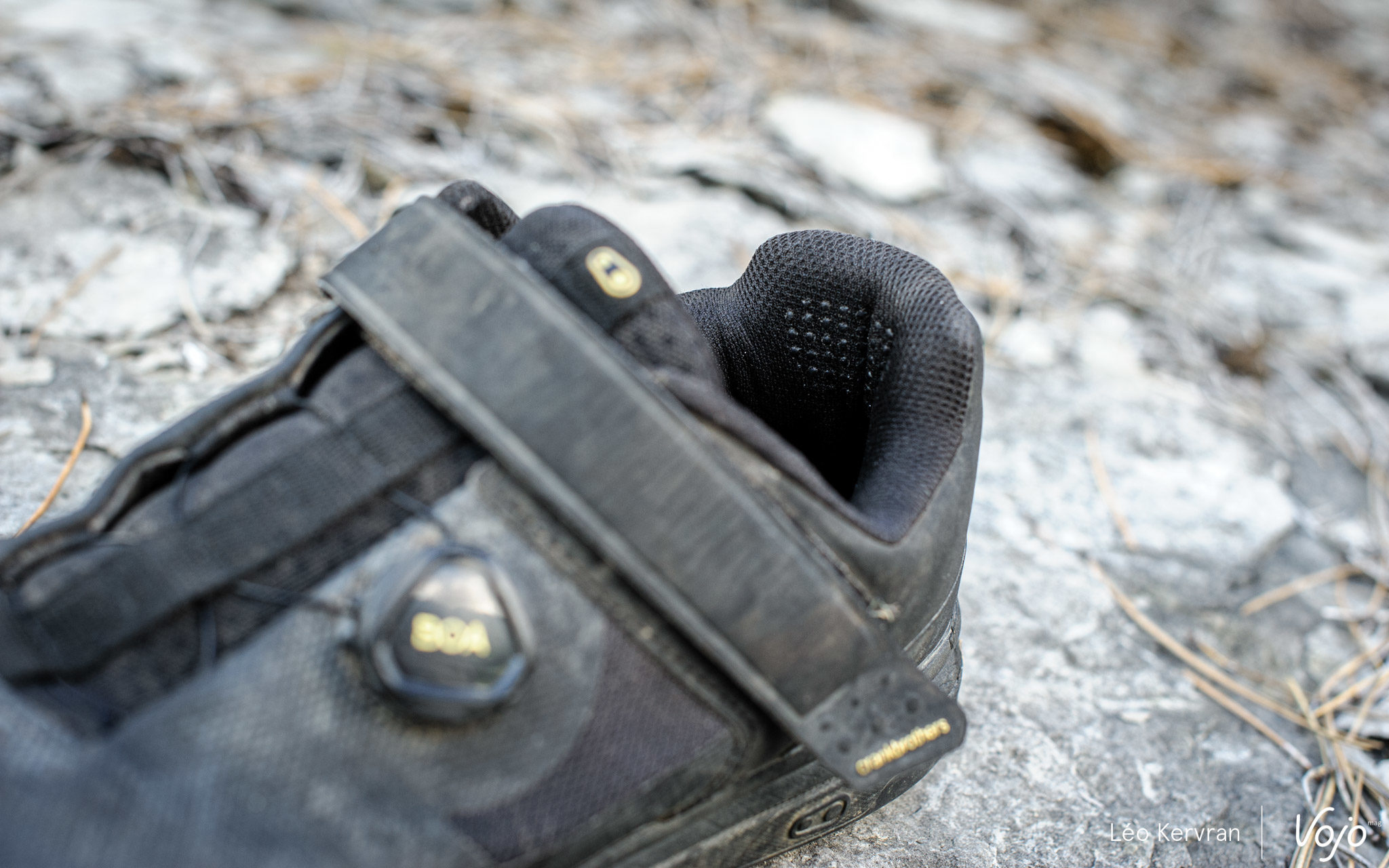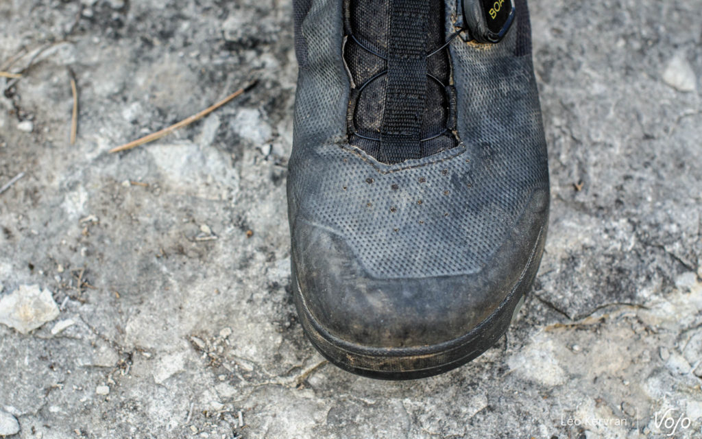 Côté technique, la chaussure se ferme à l’aide d’un Boa L6 (médio pied) et d’un scratch (coup de pied). L’intérieur est en mesh tout comme la languette mais vu de l’extérieur, tout l’avant-pied est recouvert d’un matériau plastique souple qui donne une certaine impression de robustesse et de protection, impression renforcée par la présence d’un solide pare-pierre devant les orteils. On notera aussi de petits points en silicone au niveau du talon, afin d’éviter tout glissement au pédalage ou en marchant.