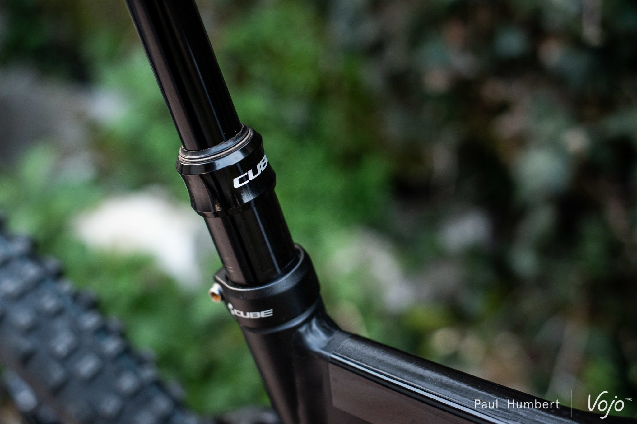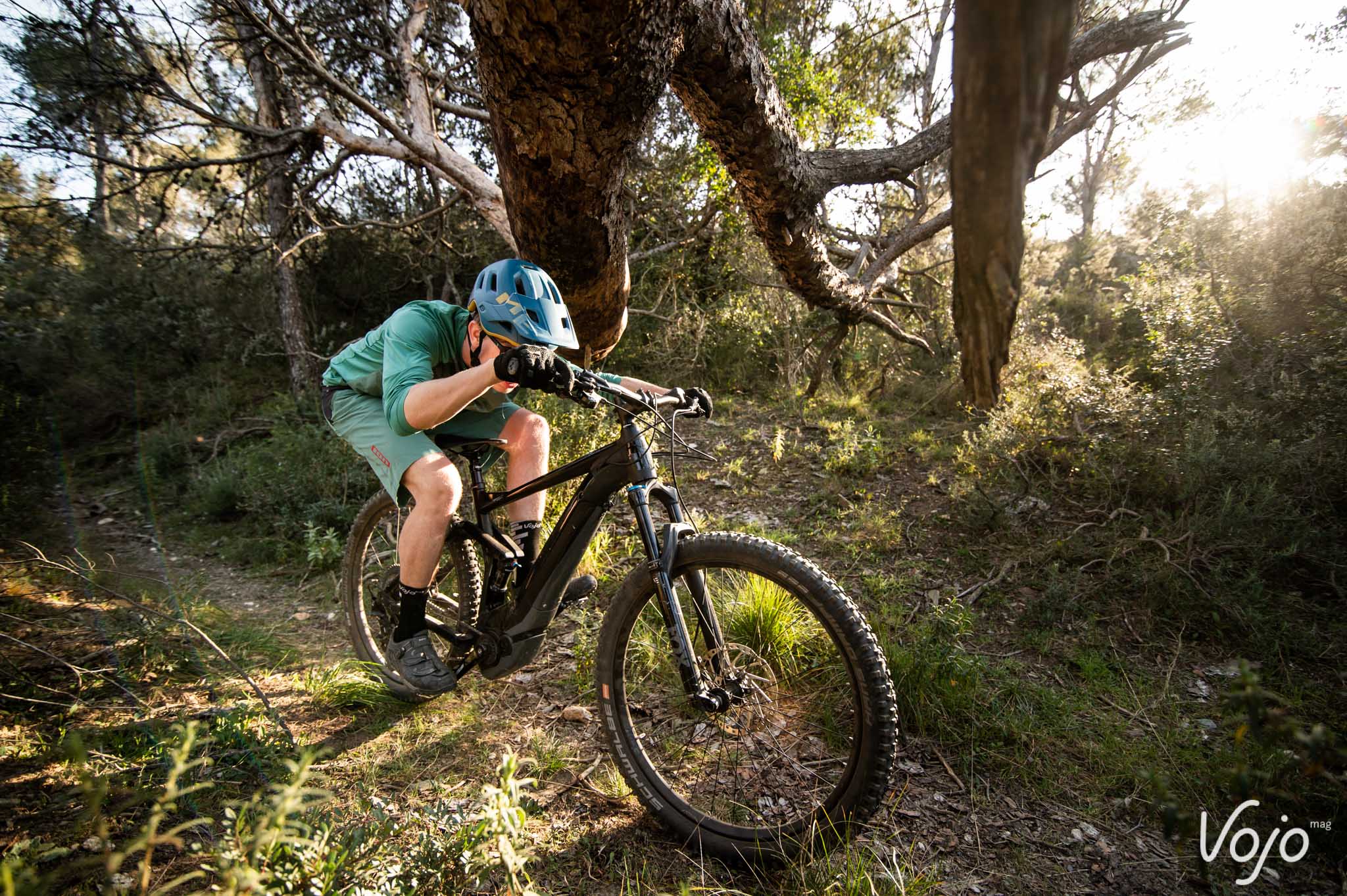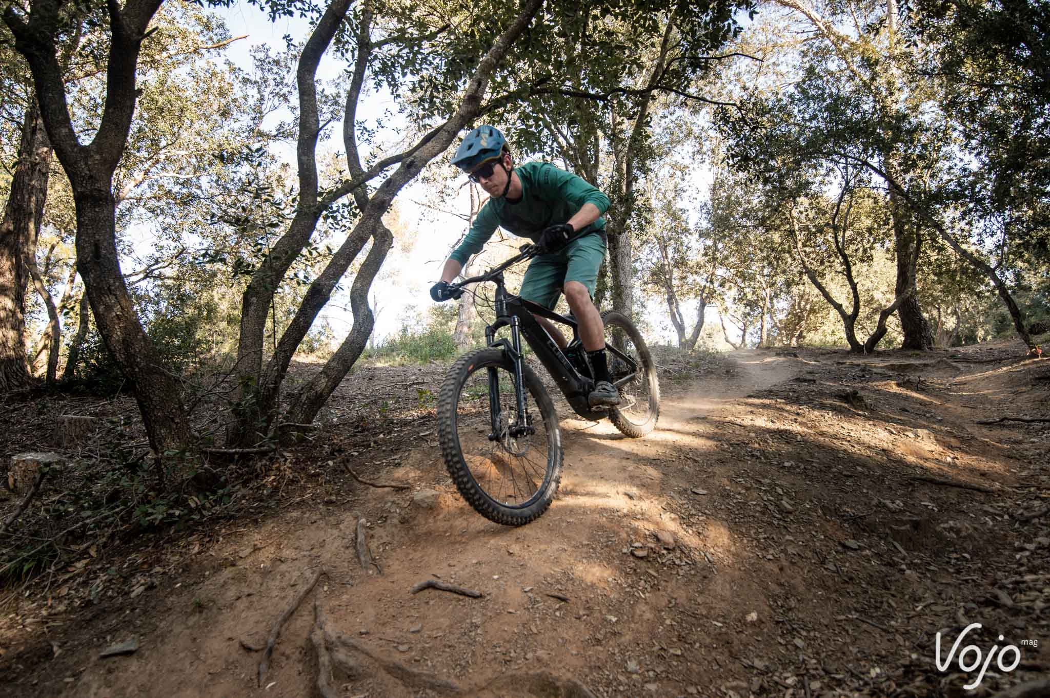 Quand on descend la selle et qu’on attaque la descente, la position est bonne et engageante. Le Cube Stereo se comporte assez gentiment quand on se promène sur des sentiers faciles, il lisse le terrain et absorbe bien les chocs. En revanche, une fois qu’on met du rythme, il sort de sa zone de confort et il a du mal à le suivre.