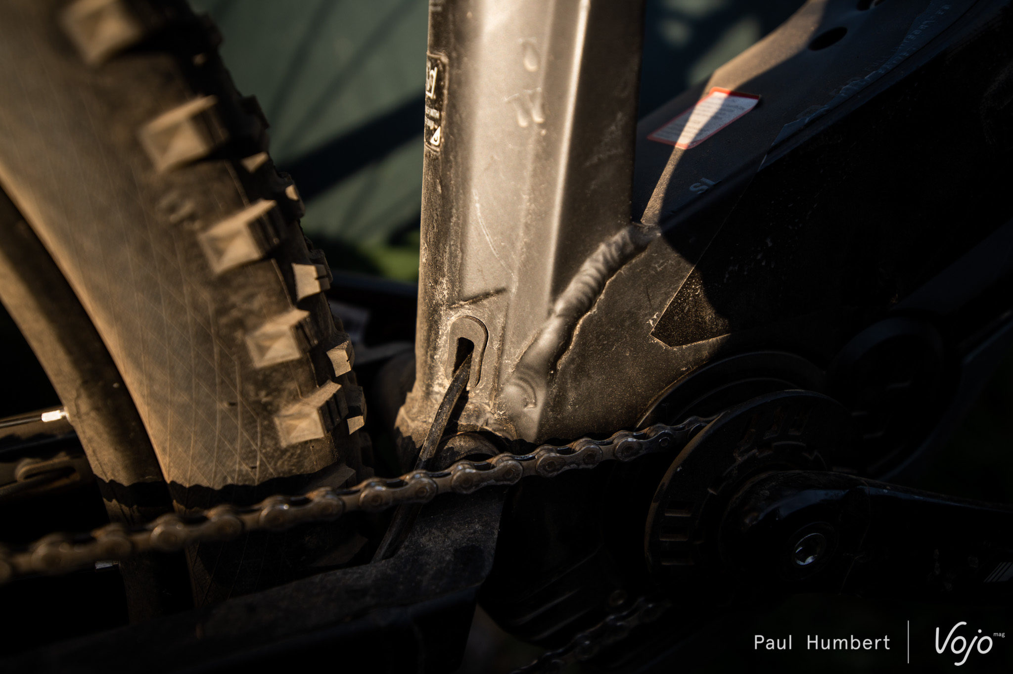 Les câbles et gaines sont intégrés au cadre et le point d’ancrage bas de l’amortisseur vient lui aussi s’intégrer aux lignes du vélo sous le tube de selle.