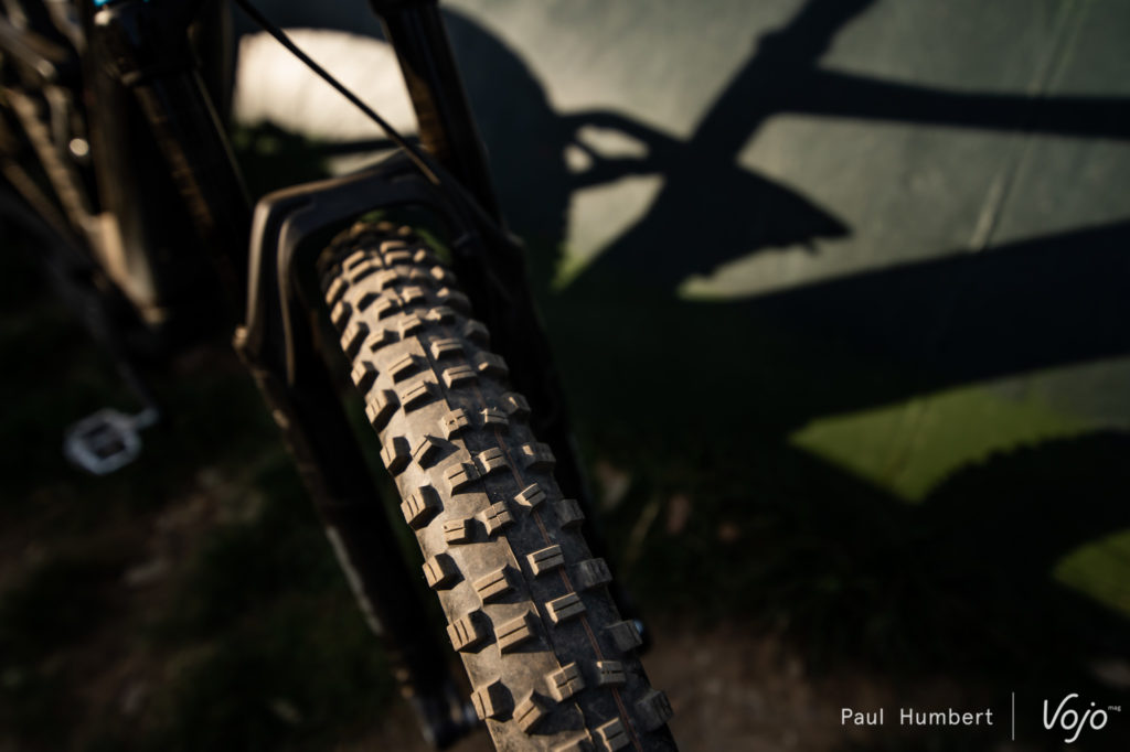 Pour les pneus, on retrouve les Schwalbe Hans Dampf en gomme Addix Soft à l’avant et Speedgrip à l’arrière. Les deux sont en section 2.6. L’ensemble est cohérent, facile à prendre en main et relativement fiable.
