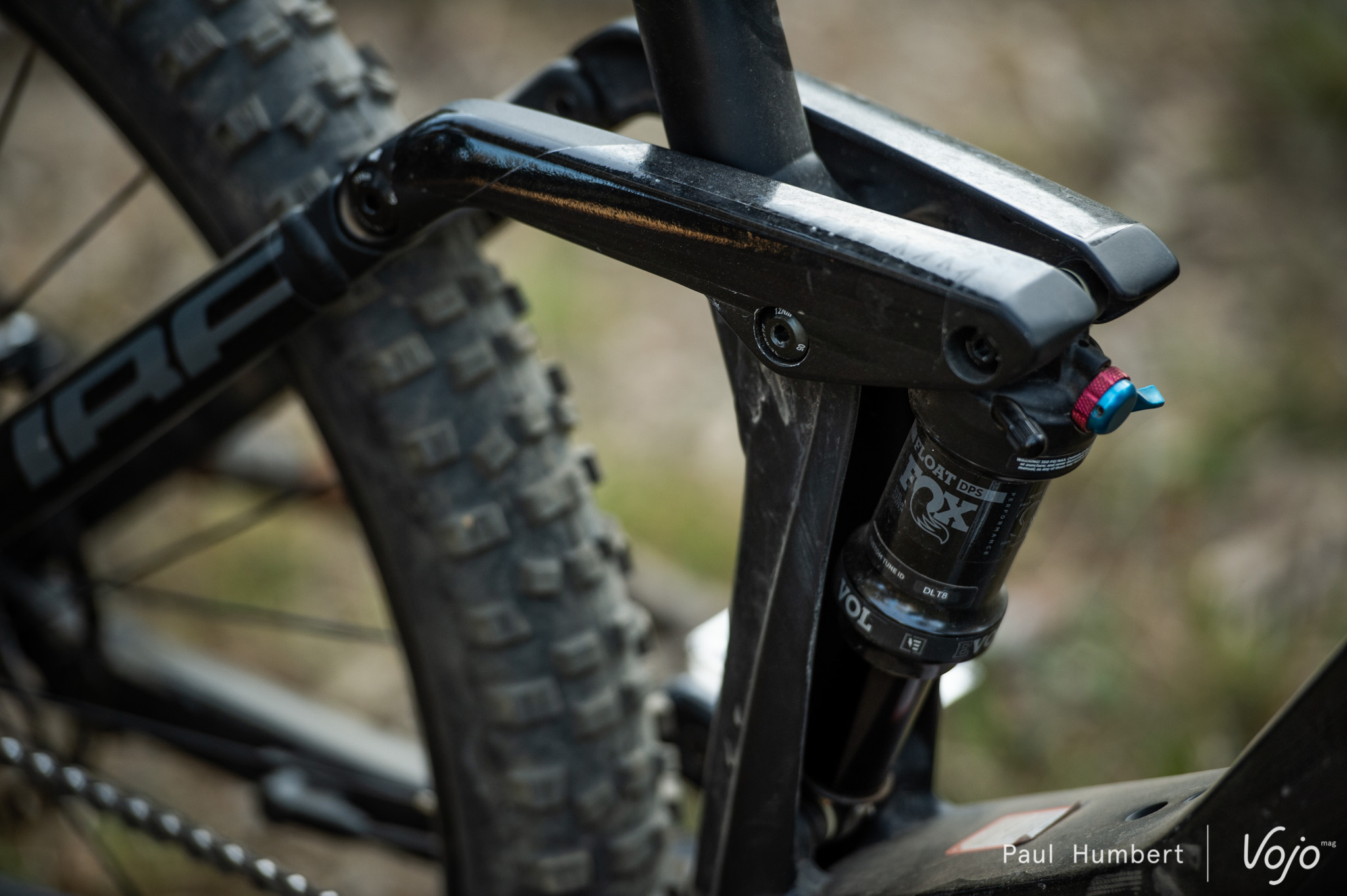 Côté cinématique, Cube reste sur un « four bar linkage » de type « Horst link » assez traditionnel et utilise une biellette de grande taille ancrée sur le tube de selle. Cette biellette est faite de deux pièces monocoques qui viennent se fixer de part et d’autre du cadre et de l’amortisseur. Le point de pivot principal est situé juste derrière le moteur Bosch Performance CX et l’amortisseur est ancré juste au-dessus de celui-ci.