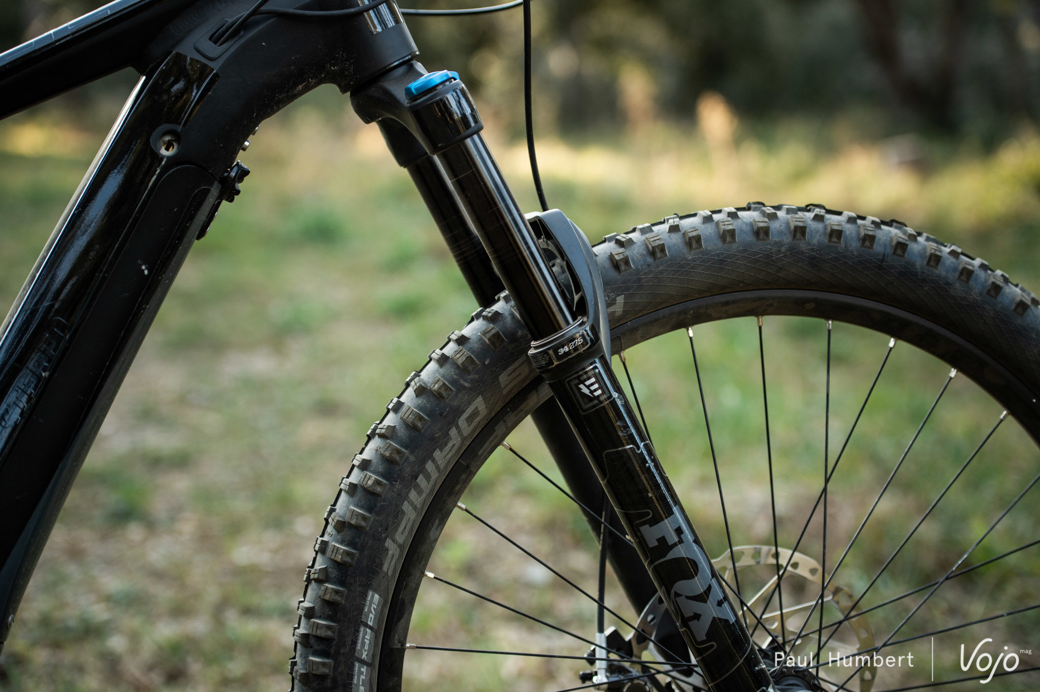 Le Cube Stereo Hybrid 140 est équipé de manière assez cohérente. Côté suspension, une fourche Fox 34 Rythm E-Bike est à l’avant du vélo avec sa cartouche GRIP et une commande qui permet d’aller jusqu’au blocage de la fourche.