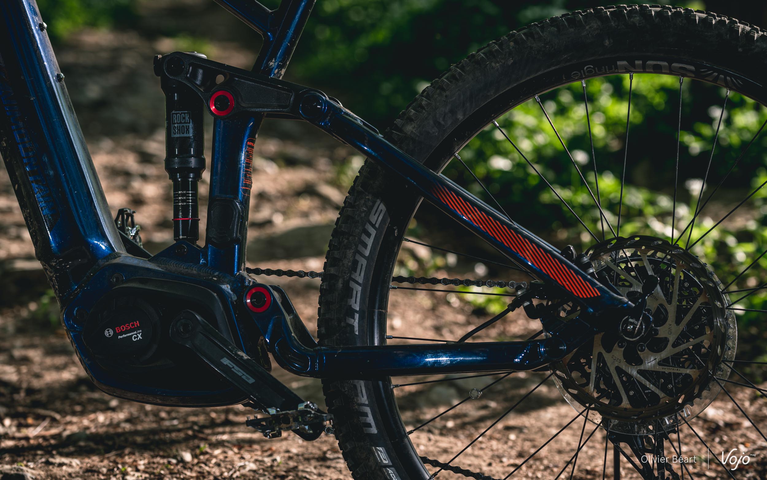 Cette suspension est ici couplée à un amortisseur RockShox Deluxe, sur lequel on remarque qu’il n’y a pas de levier permettant de le bloquer pour les portions roulantes. Si ce type d’appendice est très utile sur un vélo classique, sans assistance, et pour des pratiques typées compétition, il n’est pas du tout indispensable à nos yeux sur un VTT électrique où on gagnera beaucoup plus à laisser la suspension active en permanence. D’autant plus qu’ici, le pompage est très limité. Par contre, la plage du réglage du rebond (mollette rouge) nous semble trop limitée et sur le terrain, il nous a souvent semblé trop lent.