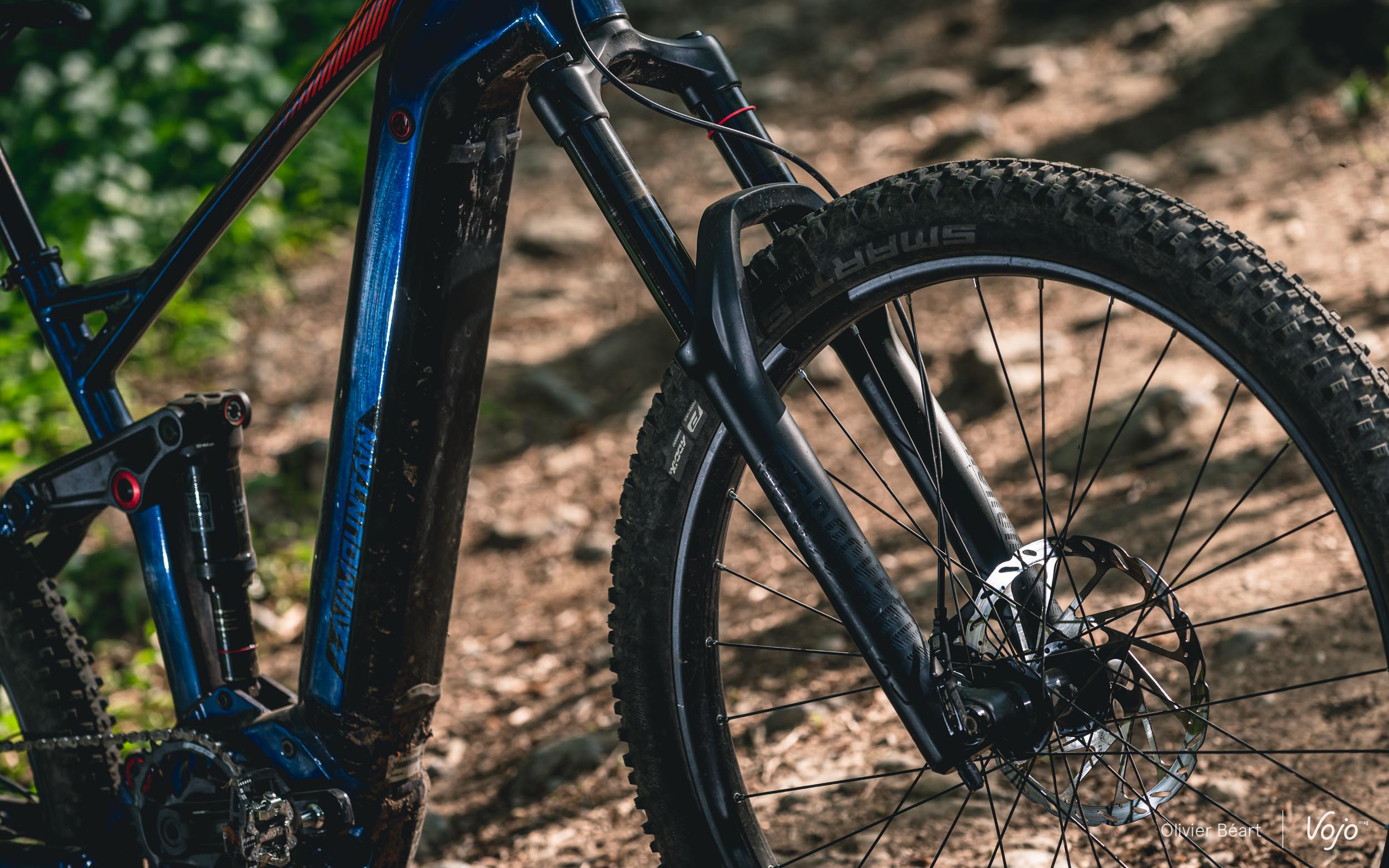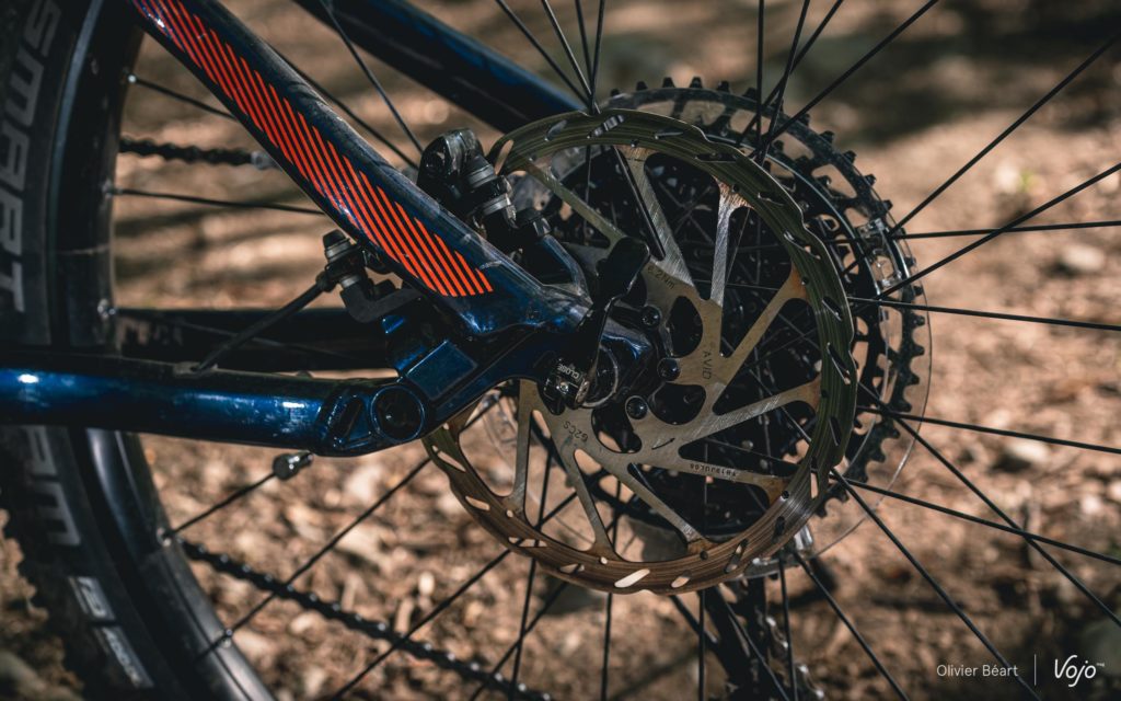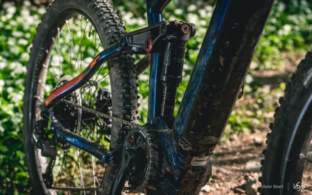 Quand c’est cassant, la suspension arrière encaisse bien les impacts et colle avec aisance la roue arrière au sol. On aurait juste aimé pouvoir régler le rebond vers quelque chose de plus rapide. Ici, nous avons roulé avec le réglage à fond du côté « lapin » (rapide) tout en trouvant toujours cela un peu trop lent pour vraiment bien avaler les successions d’impacts. A l’avant, la RockShox 35 ne démérite pas et elle sera parfaite pour un usage cool. Quand on lui rentre un peu dedans, le châssis encaisse bien, mais on sent que c’est assez basique au niveau des pièces internes. Il y a aussi un claquement en détente pas vraiment pénalisant mais assez perceptible. Comme expliqué plus haut au chapitre des suspensions, les pilotes plus pointus apprécieront la possibilité de pouvoir upgrader leur fourche avec de meilleurs composants internes.