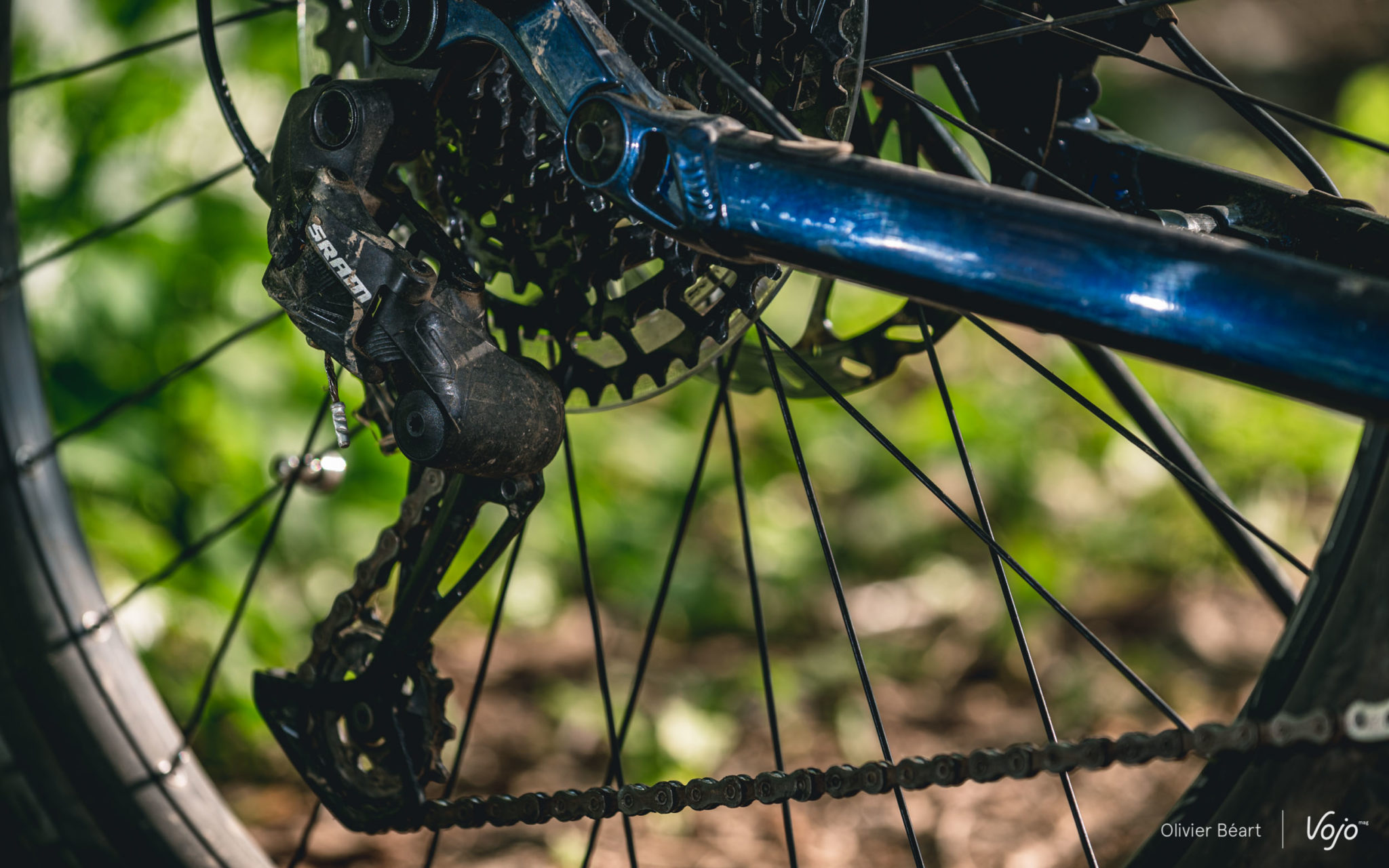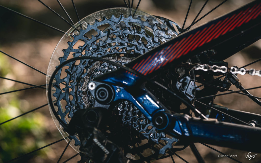 La transmission est en 12 vitesses, avec le groupe d’entrée de gamme Sram SX. Bien sûr, les changements de vitesses ne sont pas aussi vifs que sur un GX ou sur les autres groupes plus haut de gamme de la marque. Bien sûr, la cassette en acier est très lourde. Bien sûr, la commande est un peu « molle ». Mais lors de notre test, l’ensemble s’en est plutôt bien sorti et n’a pas montré de faiblesse particulière.