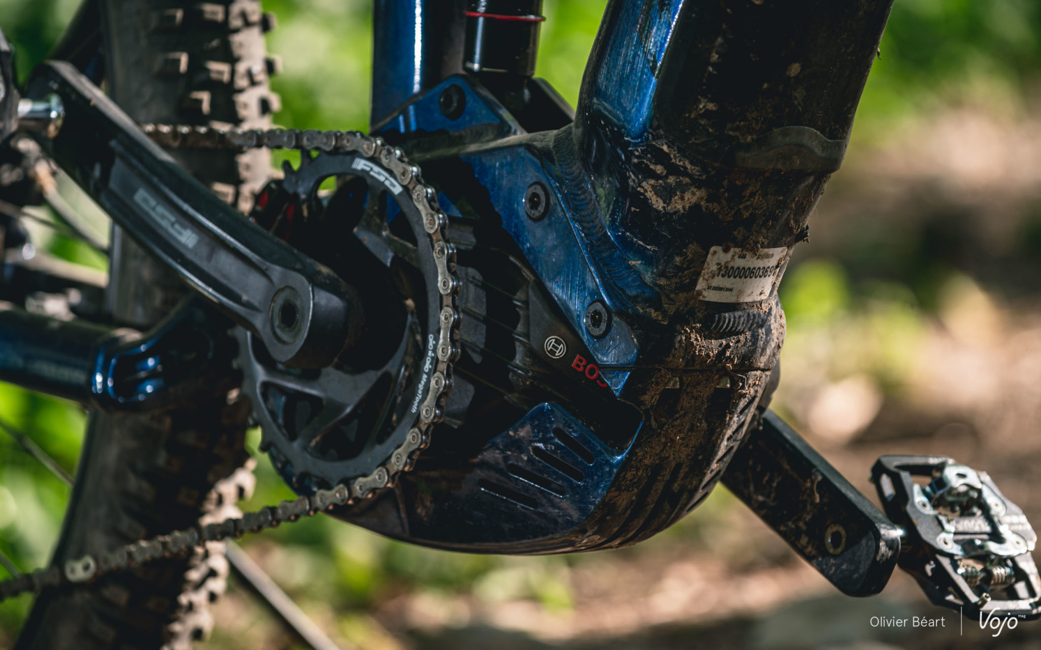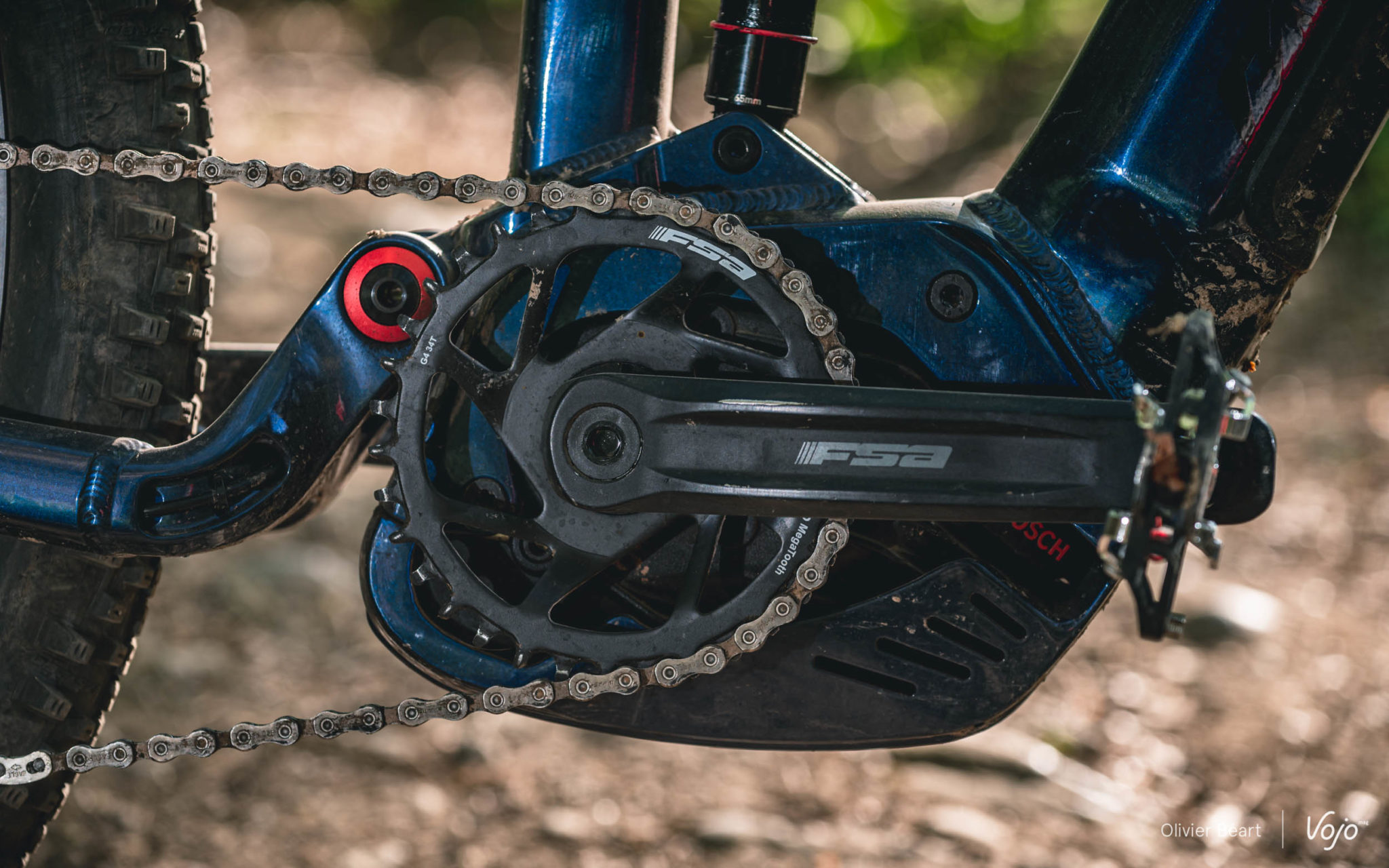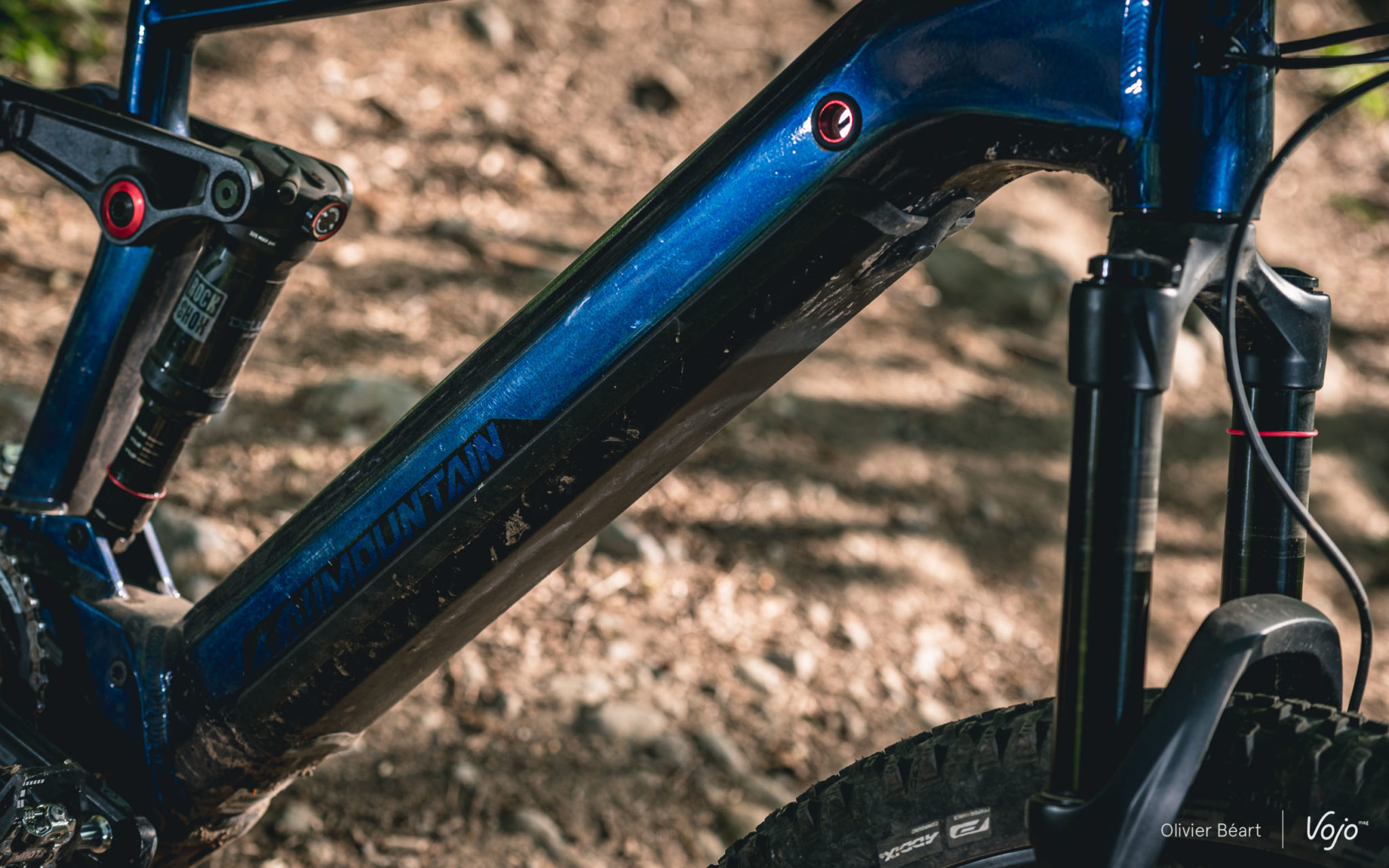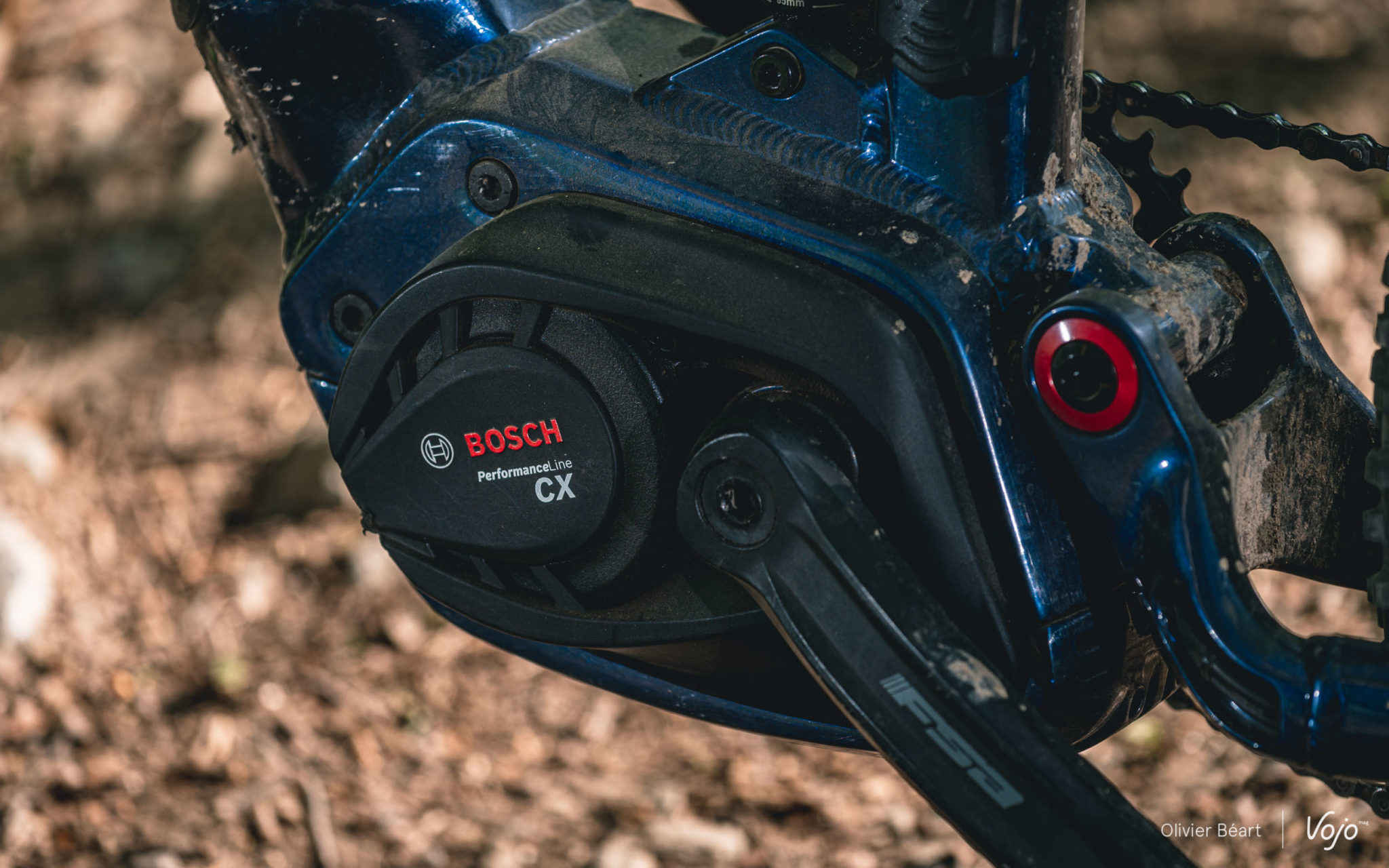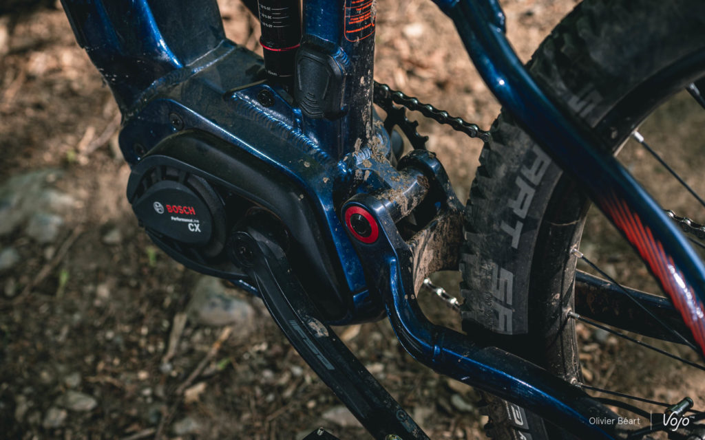 Le moteur est un des atouts de ce vélo, puisqu’on retrouve la dernière génération du Bosch Performance CX (voir notre présentation détaillée ici). Compact, performant (jusqu’à 340% d’assistance et 75Nm de couple), quasi sans frottements lorsqu’il est débrayé, il figure parmi les références du segment. Il est ici protégé par un carter en aluminium qui l’encercle complètement. Nous avons plusieurs fois tapé des pierres et des branches lors de franchissements, et le carter ne portait quasi aucune trace d’impact mis à part quelques griffes dans la peinture. Il semble donc très robuste, ce qui n’est pas toujours le cas ailleurs…
